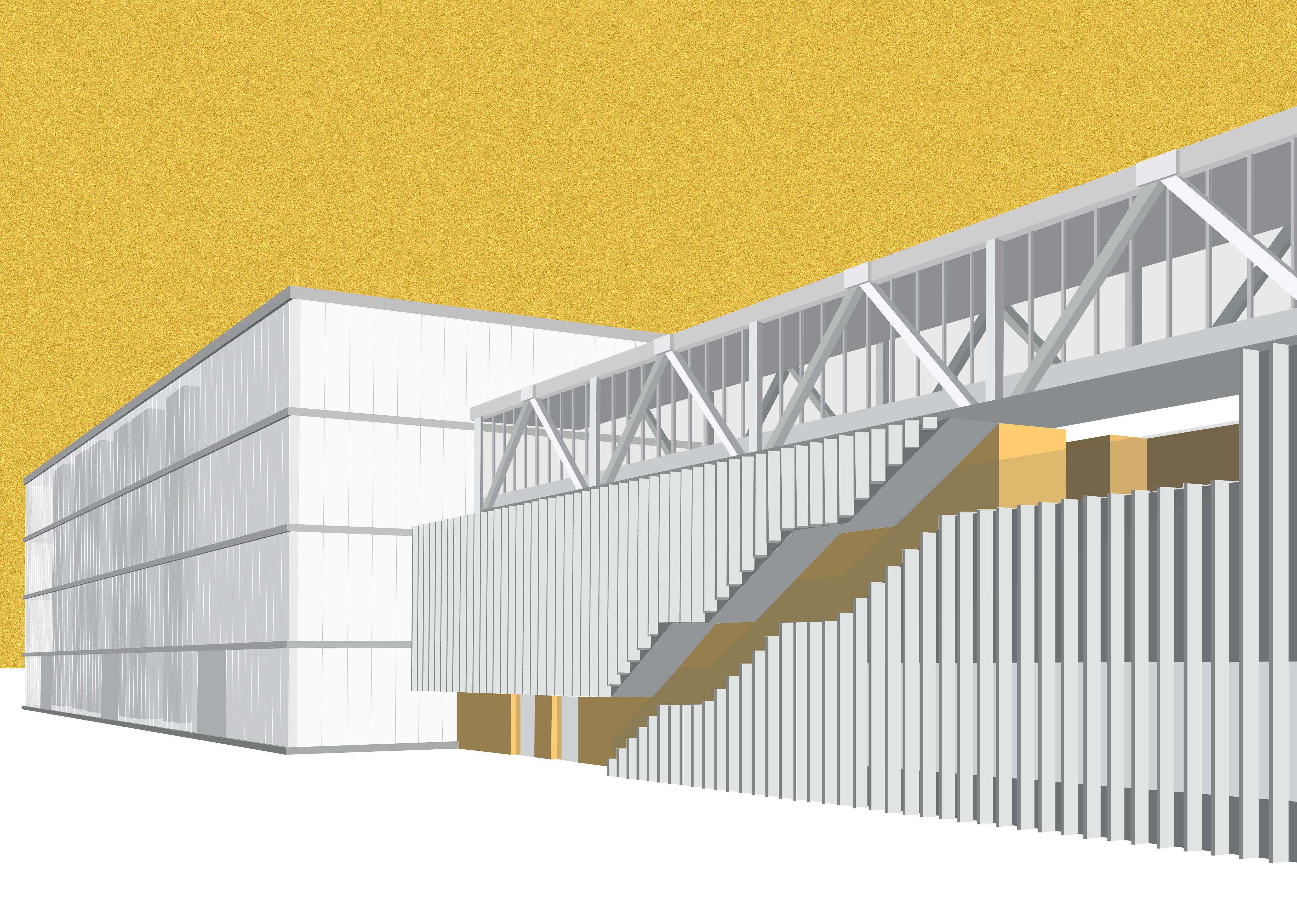 Il tema dell’interferenza si riflette nel progetto attraverso i materiali leggeri, come il metacrilato, posti in contrapposizione con materiali “pesanti” come il calcestruzzo. Anche i colori scelti sono in contrasto con quelli esistenti, come il blu della pista che contrasta il rosso dei tubi presenti nello spazio. Il progetto, inoltre, va a scambiare le temperature tipiche dello spazio, riscaldando lo spazio aperto e raffreddando lo spazio interno dell’aula che si affaccia sul patio.
