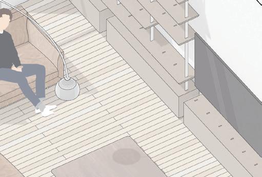 La pista esterna viene servita da un sistema di casse agganciate ai pilastri dello spazio patio già esistenti. All’interno dell’aula il suono esce dal pavimento disequilibrante.