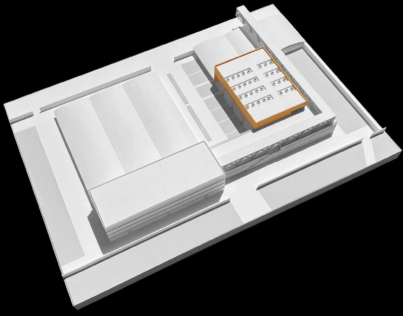 Accanto al blocco di archiviazione si sviluppa una parte amministrativa e di consultazione, legato anch’esso all’attività dell’archivio. Parte delle sale di consultazione al primo piano affacciano sul blocco pubblico, che presenta un accesso differenziato. Esso ospita una biblioteca a doppia altezza, un auditorium ed un co-working a disposizione del quartiere e della città di Milano. L’ultimo piano di questo blocco ha la caratteristica di essere completamente cieco perimetralmente e ricevere luce solo dai lucernari piramidali, è rivestito di un intonaco giallo che permette all’edificio di essere riconosciuto anche da lunga distanza. La scala in prospetto porta direttamente alla sala espositiva sospesa che corre al di sopra dell’edificio all’interno di una struttura reticolare.