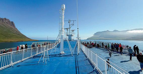 Übernachtung Mittelklasse-Hotels und Gästehäuser, teils in einsamer Lage Höhepunkte Wasserfall Gullfoss, Gletscherlagune (s. Foto S. 30), Geysire, Hauptstadt Reykjavik, Westfjorde, Wasserfall Dynjandi Die große Tour, die auch die Westfjorde besucht. Vom Fährhafen geht es im Uhrzeigersinn um die große Insel herum. Die Route verläuft komplett auf Asphalt und kann mit jedem PKW befahren werden.