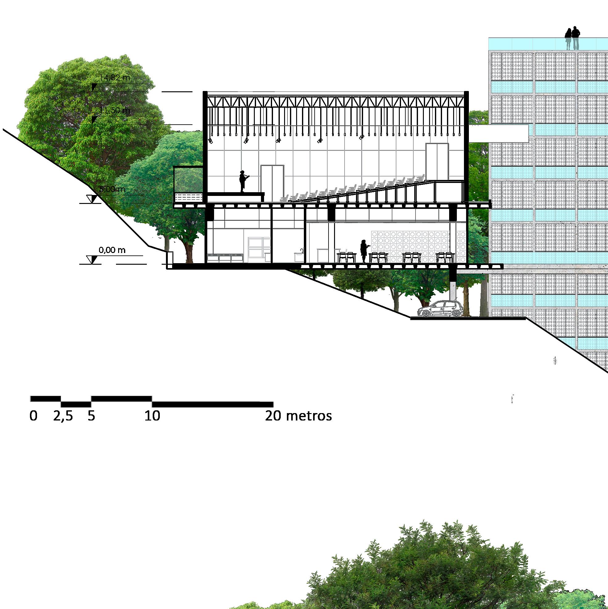 While the existing structure on pilotis dances following the rugged topography, the annex building floats straight with its simple form, in order to dialogue and be embraced by the pre-existing building bachelor final thesis site: Niterói, RJ - Brasil year: 2019