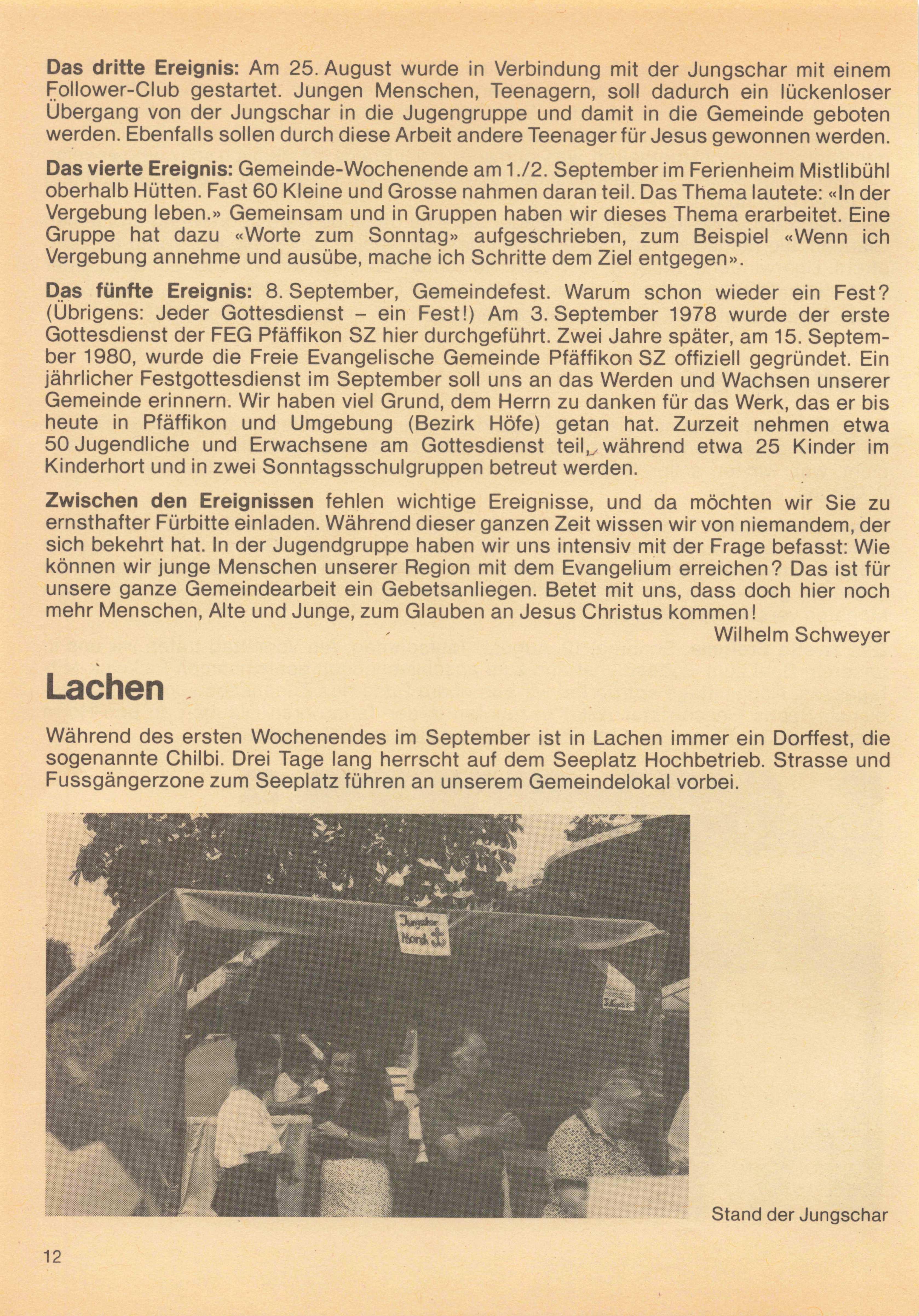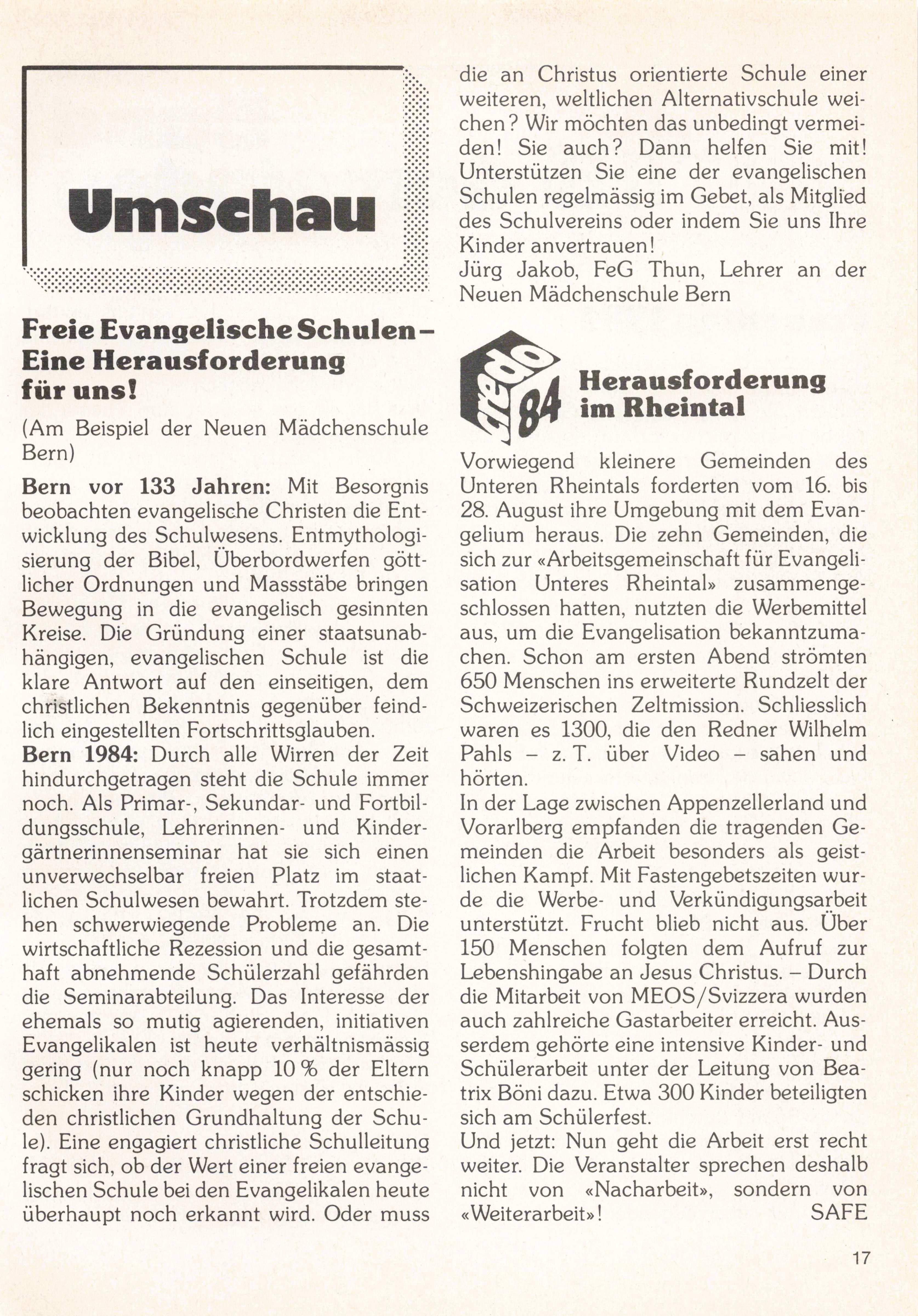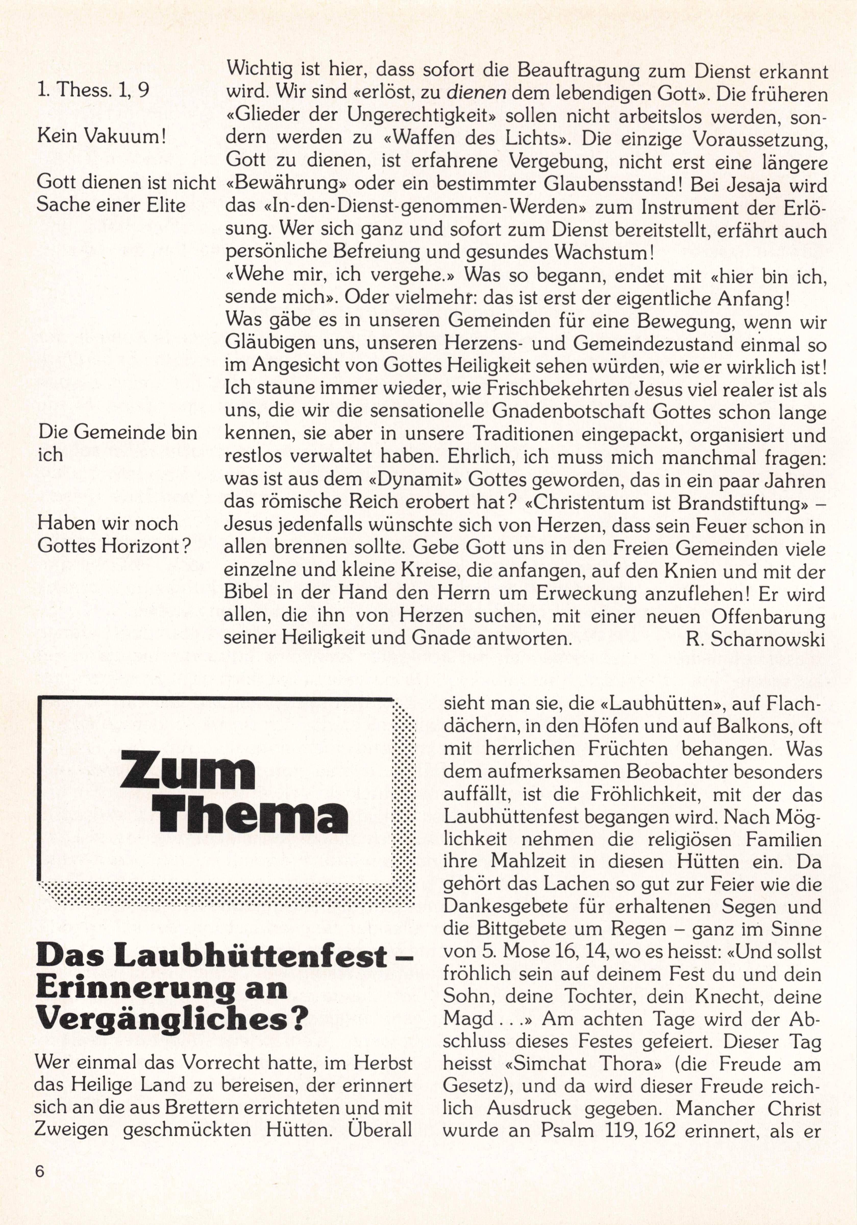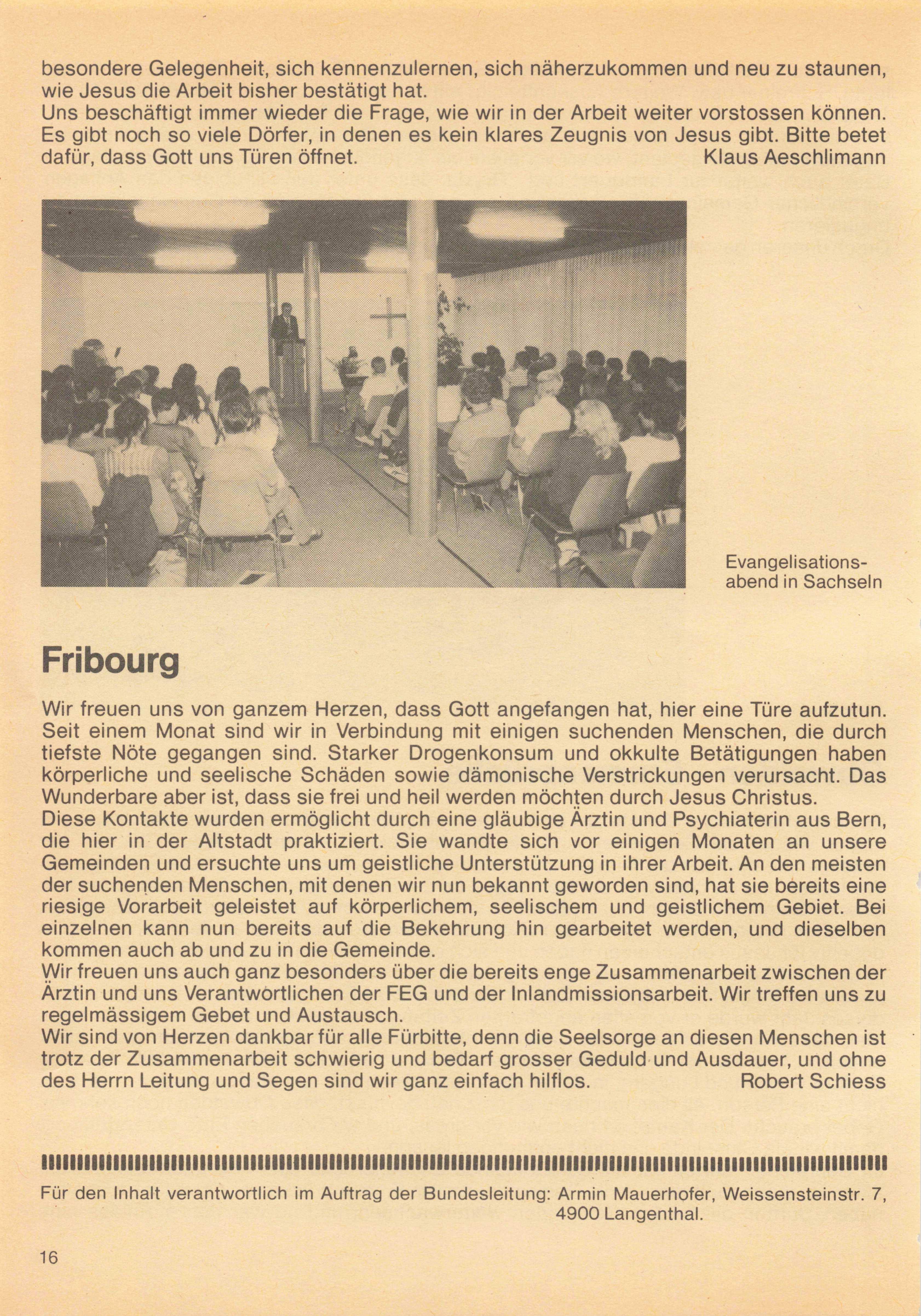 Schriftleitung: Wilhelm Schweyer, Churerstrasse 95, 8808 Pfäffikon SZ, Telefon 055 48 29 76. Redaktionsschluss: 6 Wochenvor Erscheinen. Administration und Versand: Buchhandlung der Freien Evangelischen Gemeinden, Zeughaus gasse 35/37, 3000 Bern 7, Telefon 031 22 04 21. Abonnement jährlich Fr. 16.- (für Ein zelbezüger zusätzlich Fr. 2.50 für Versand); Postcheck 30-15603506 Grosshöchstetten.