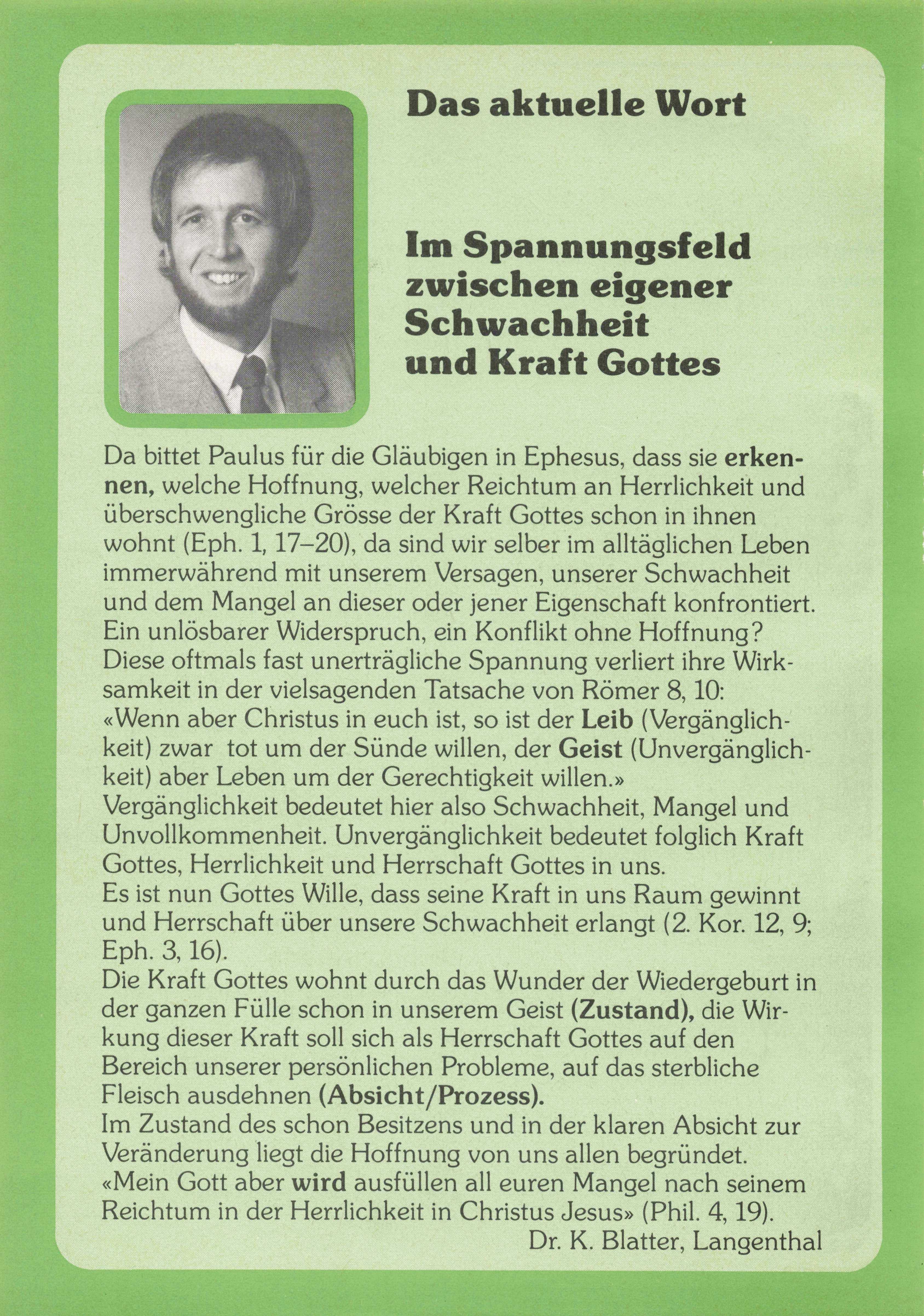 Da bittet Paulus für die Gläubigen in Ephesus, dass sie erken nen, welche Hoffnung, welcher Reichtum an Herrlichkeit und überschwengliche Grösse der Kraft Gottes schon in ihnen wohnt (Eph. 1,17-20), da sind wir selber im alltäglichen Leben immerwährend mit unserem Versagen, unserer Schwachheit und dem Mangel an dieser oder jener Eigenschaft konfrontiert. Ein unlösbarer Widerspruch, ein Konflikt ohne Hoffnung? Diese oftmals fast unerträgliche Spannung verliert ihre Wirk samkeit in der vielsagenden Tatsache von Römer 8,10; «Wenn aber Christus in euch ist, so ist der Leib (Vergänglich keit) zwar tot um der Sünde willen, der Geist (Unvergänglich keit) aber Leben um der Gerechtigkeit willen.»