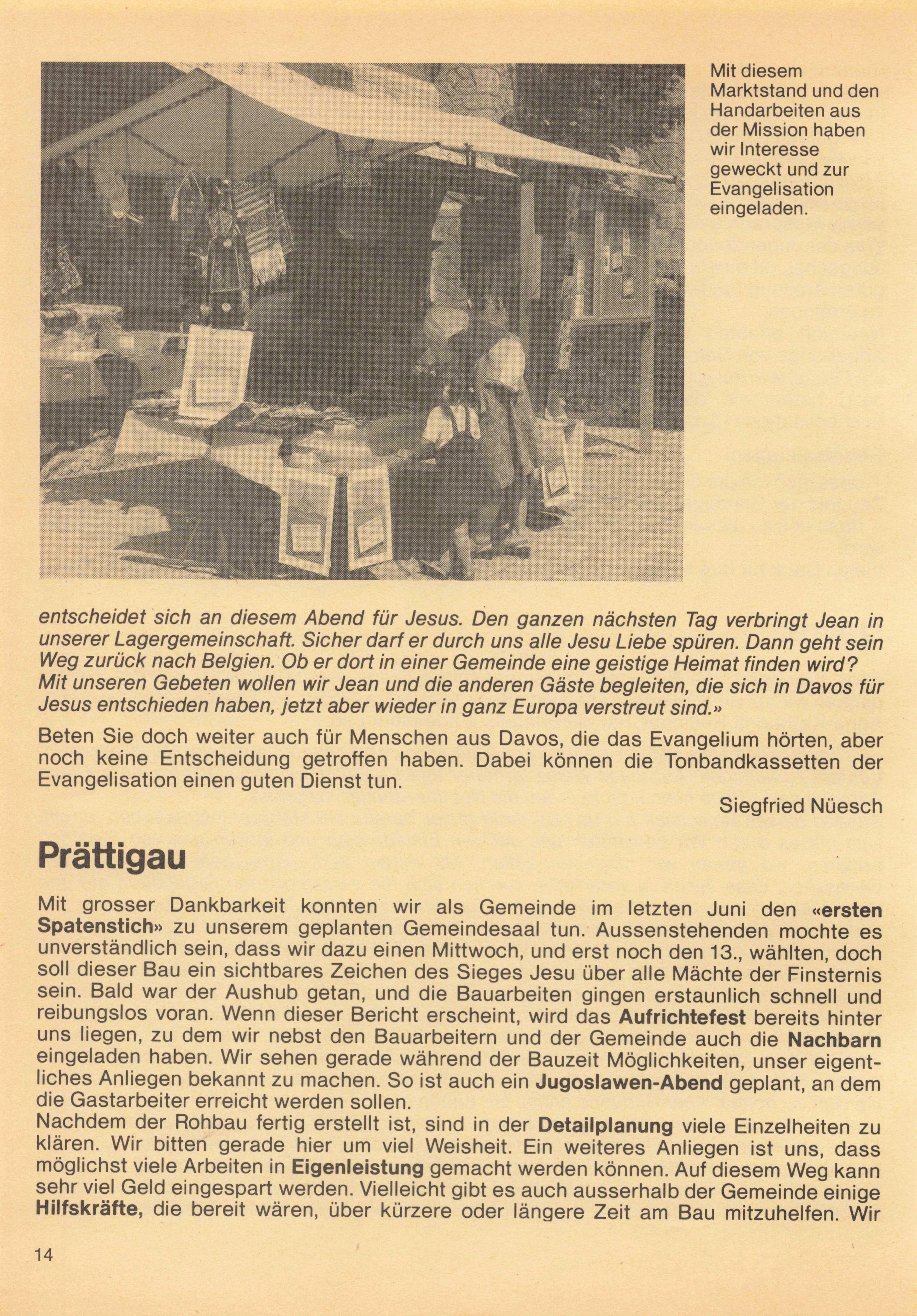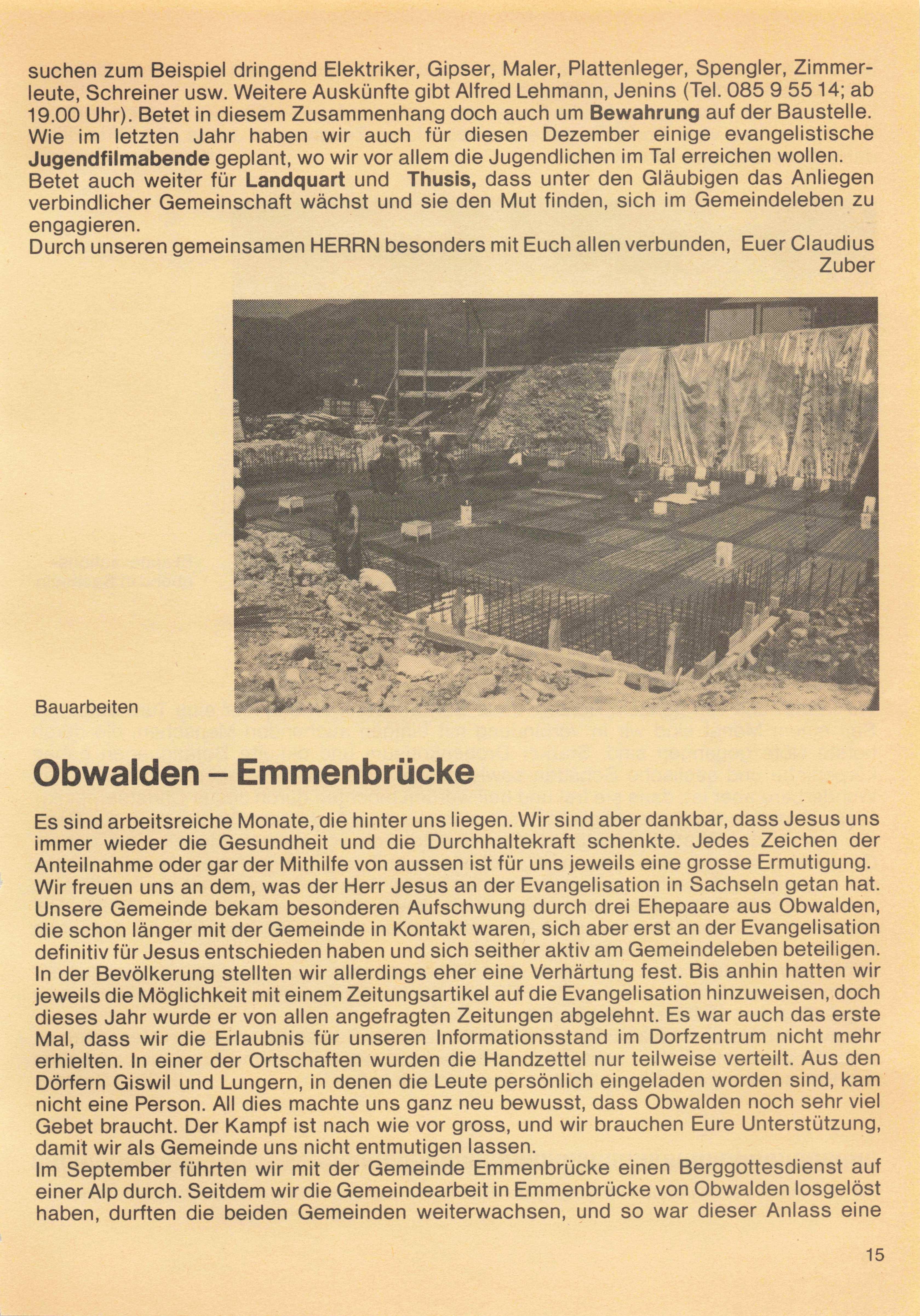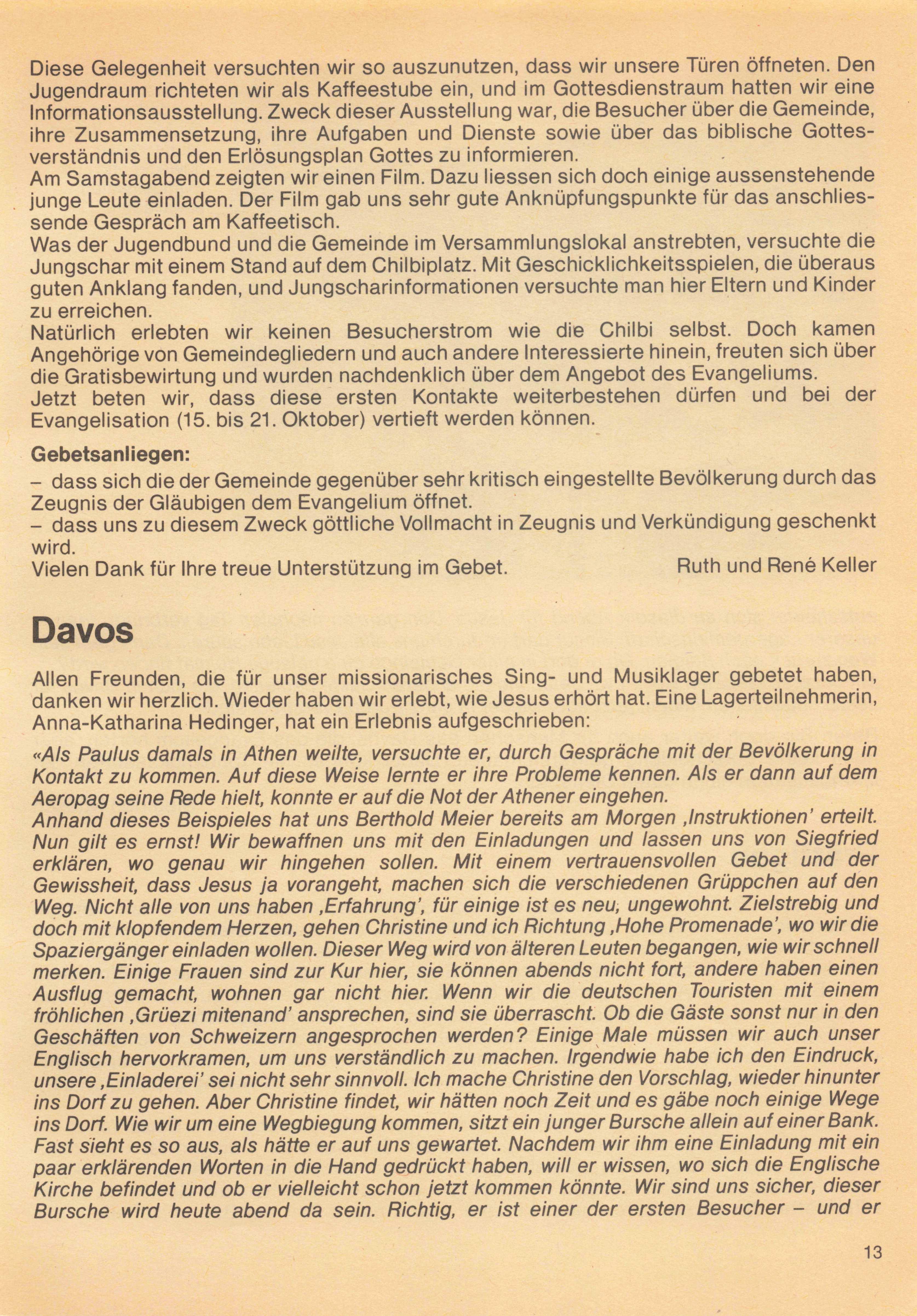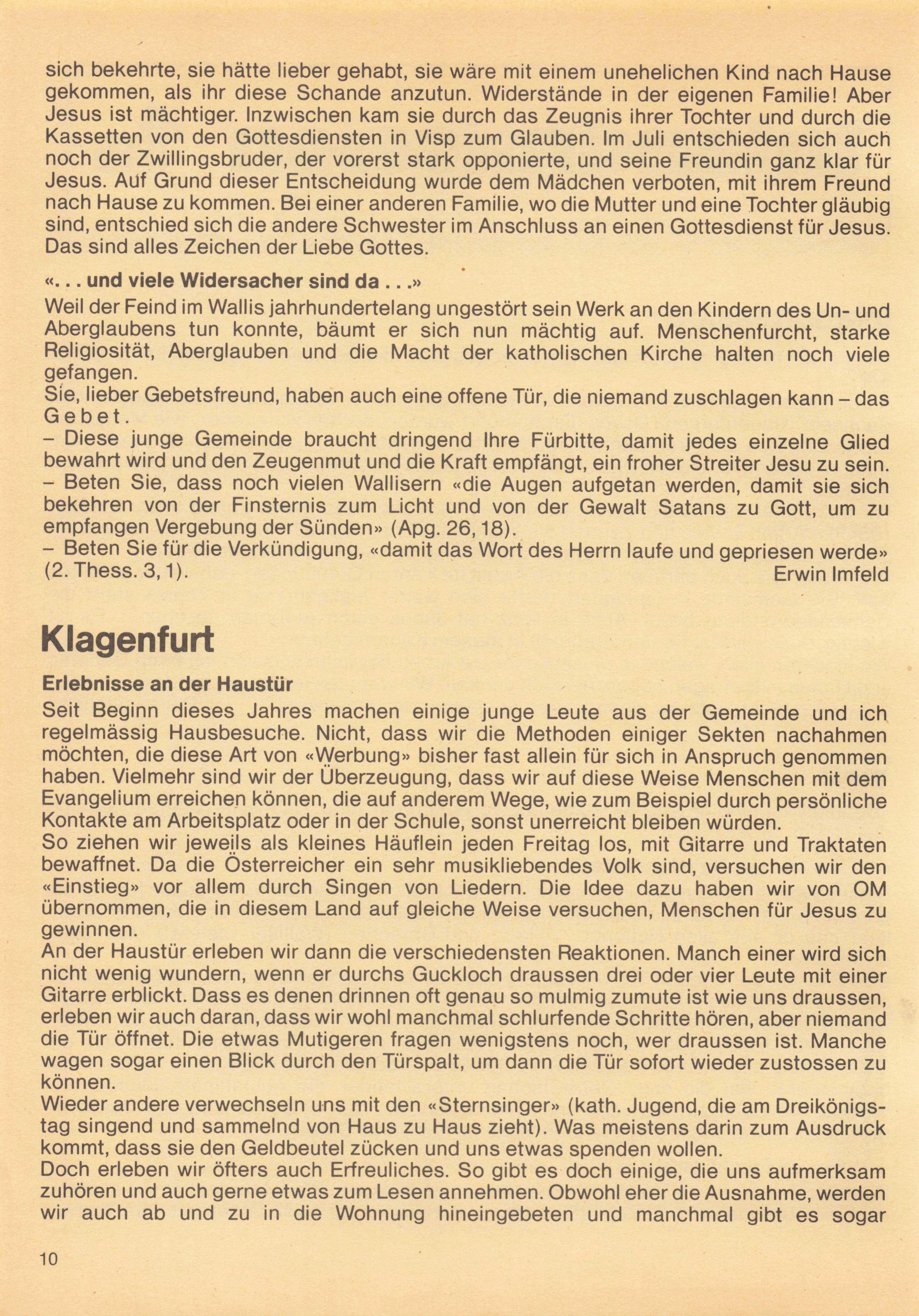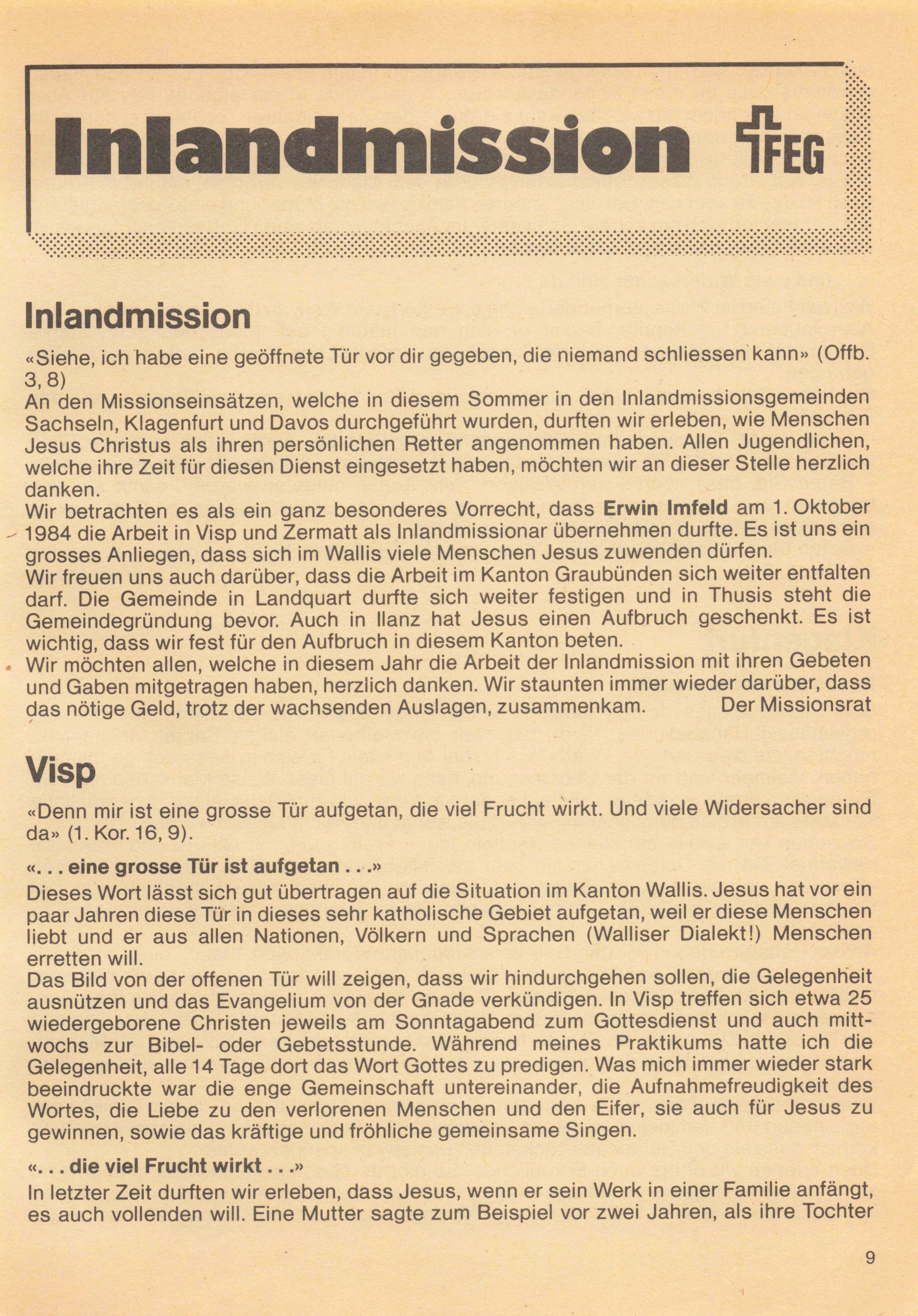 Wir betrachten es als ein ganz besonderes Vorrecht, dass Erwin Imfeld am 1. Oktober 1984 die Arbeit in Visp und Zermatt als Inlandmissionar übernehmen durfte. Es ist uns ein grosses Anliegen, dass sich im Wallis viele Menschen Jesus zuwenden dürfen. Wir freuen uns auch darüber, dass die Arbeit im Kanton Graubünden sich weiter entfalten darf. Die Gemeinde in Landquart durfte sich weiter festigen und in Thusis steht die Gemeindegründung bevor. Auch in llanz hat Jesus einen Aufbruch geschenkt. Es ist wichtig, dass wir fest für den Aufbruch in diesem Kanton beten.