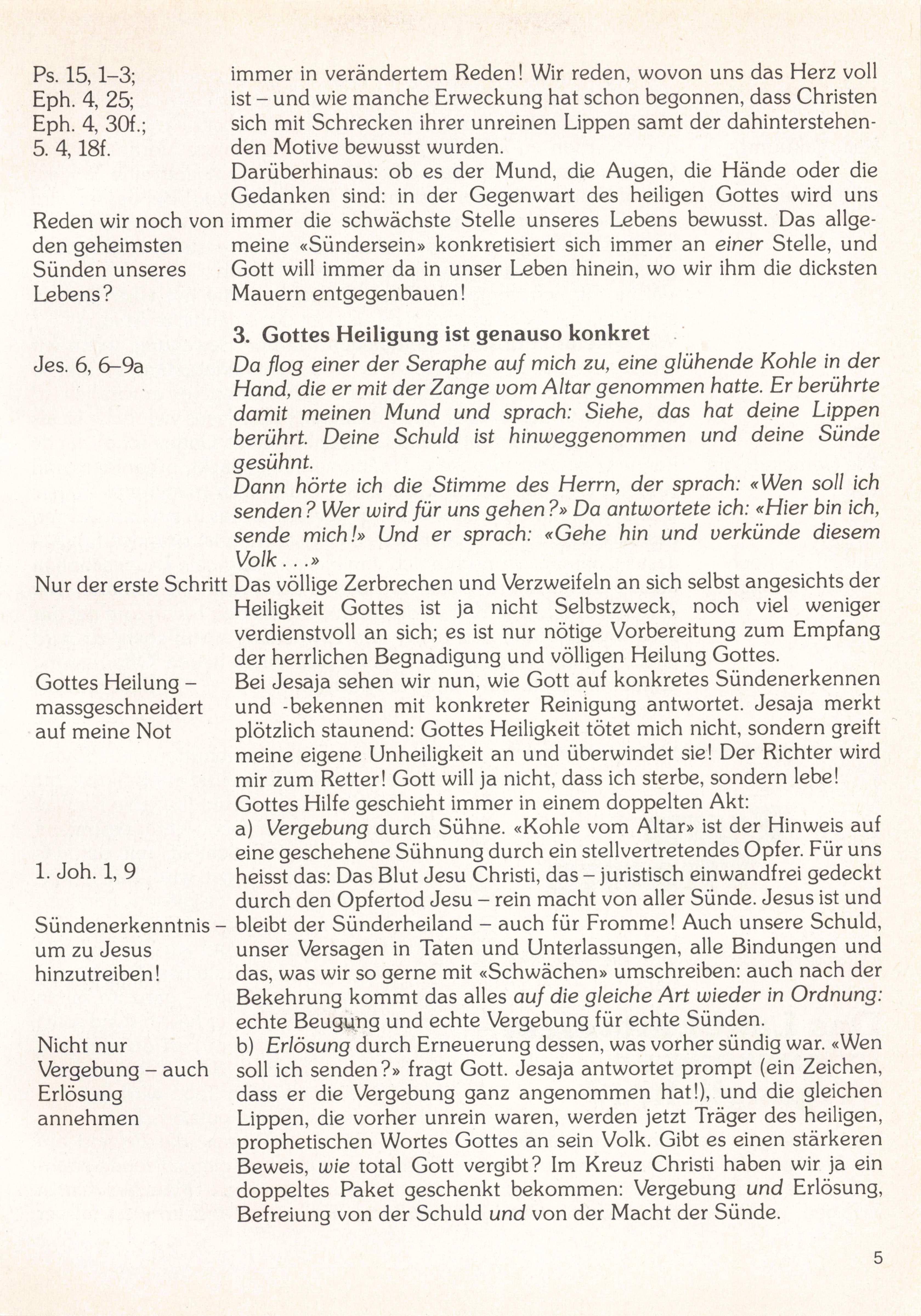 Darüberhinaus; ob es der Mund, die Augen, die Hände oder die Gedanken sind: in der Gegenwart des heiligen Gottes wird uns immer die schwächste Stelle unseres Lebens bewusst. Das allge meine «Sündersein» konkretisiert sich immer an einer Stelle, und Gott will immer da in unser Leben hinein, wo wir ihm die dicksten Mauern entgegenbauen!