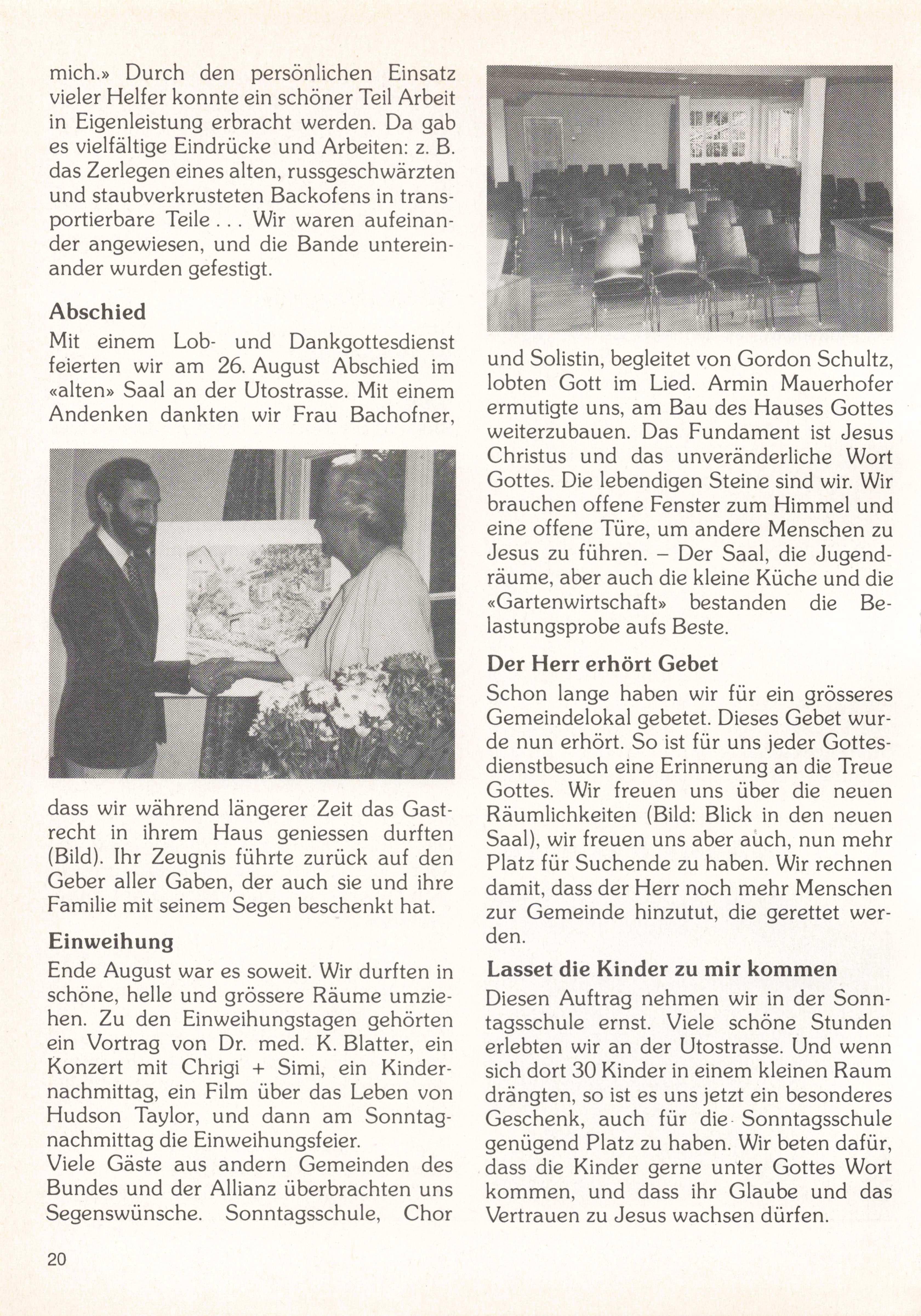 Ende August war es soweit. Wir durften in schöne, helle und grössere Räume umzie hen. Zu den Einweihungstagen gehörten ein Vortrag von Dr. med. K. Blatter, ein Konzert mit Chrigi -f Simi, ein Kinder nachmittag, ein Film über das Leben von Hudson Taylor, und dann am Sonntag nachmittag die Einweihungsfeier.