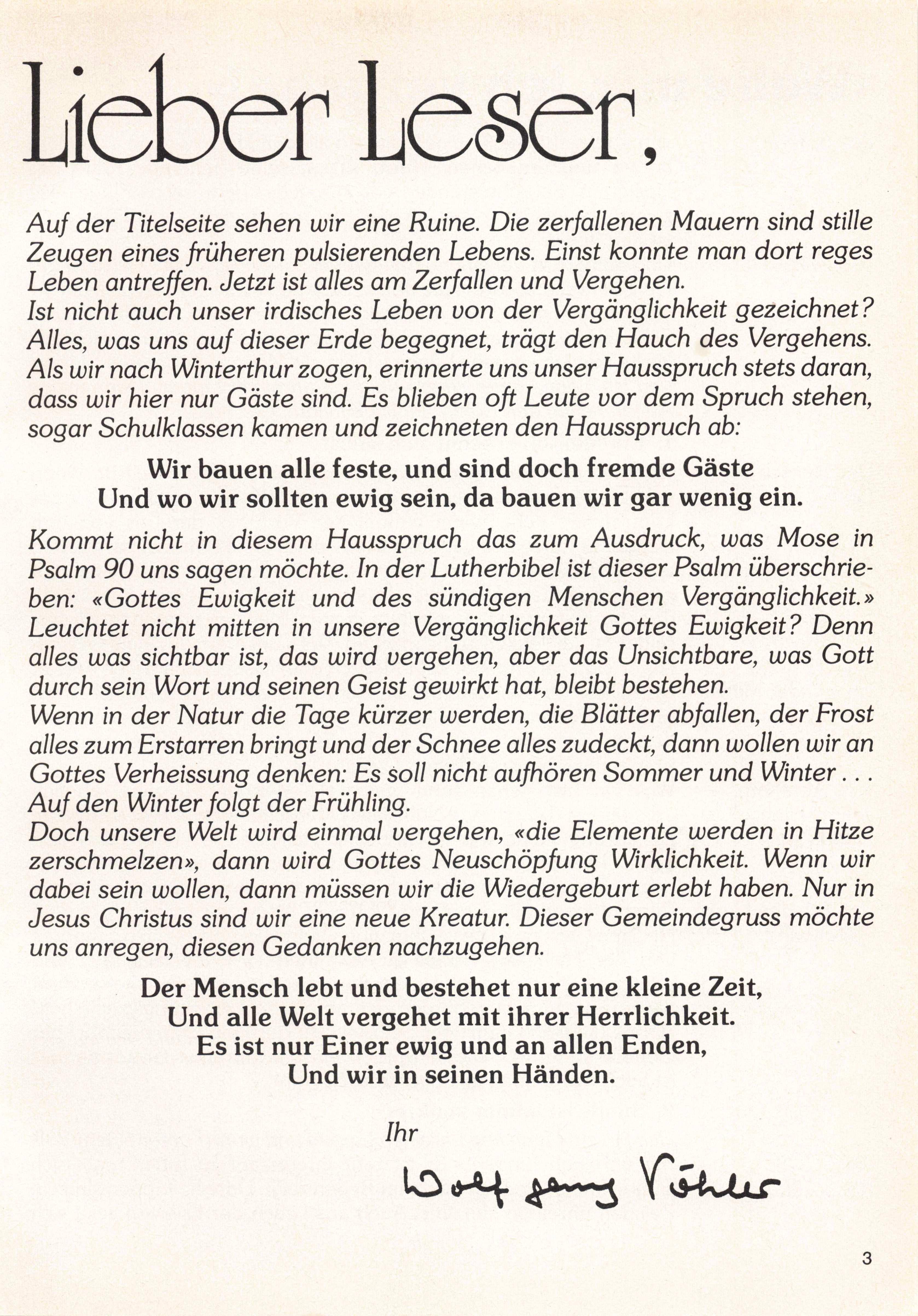 Auf der Titelseite sehen wir eine Ruine. Die zerfallenen Mauern sind stille Zeugen eines früheren pulsierenden Lebens. Einst konnte man dort reges Leben antreffen. Jetzt ist alles am Zerfallen und Vergehen. Ist nicht auch unser irdisches Leben von der Vergänglichkeit gezeichnet? Alles, was uns auf dieser Erde begegnet, trägt den Hauch des Vergehens. Als wir nach Winterthur zogen, erinnerte uns unser Hausspruch stets daran, dass wir hier nur Gäste sind. Es blieben oft Leute vor dem Spruch stehen, sogar Schulklassen kamen und zeichneten den Hausspruch ab: