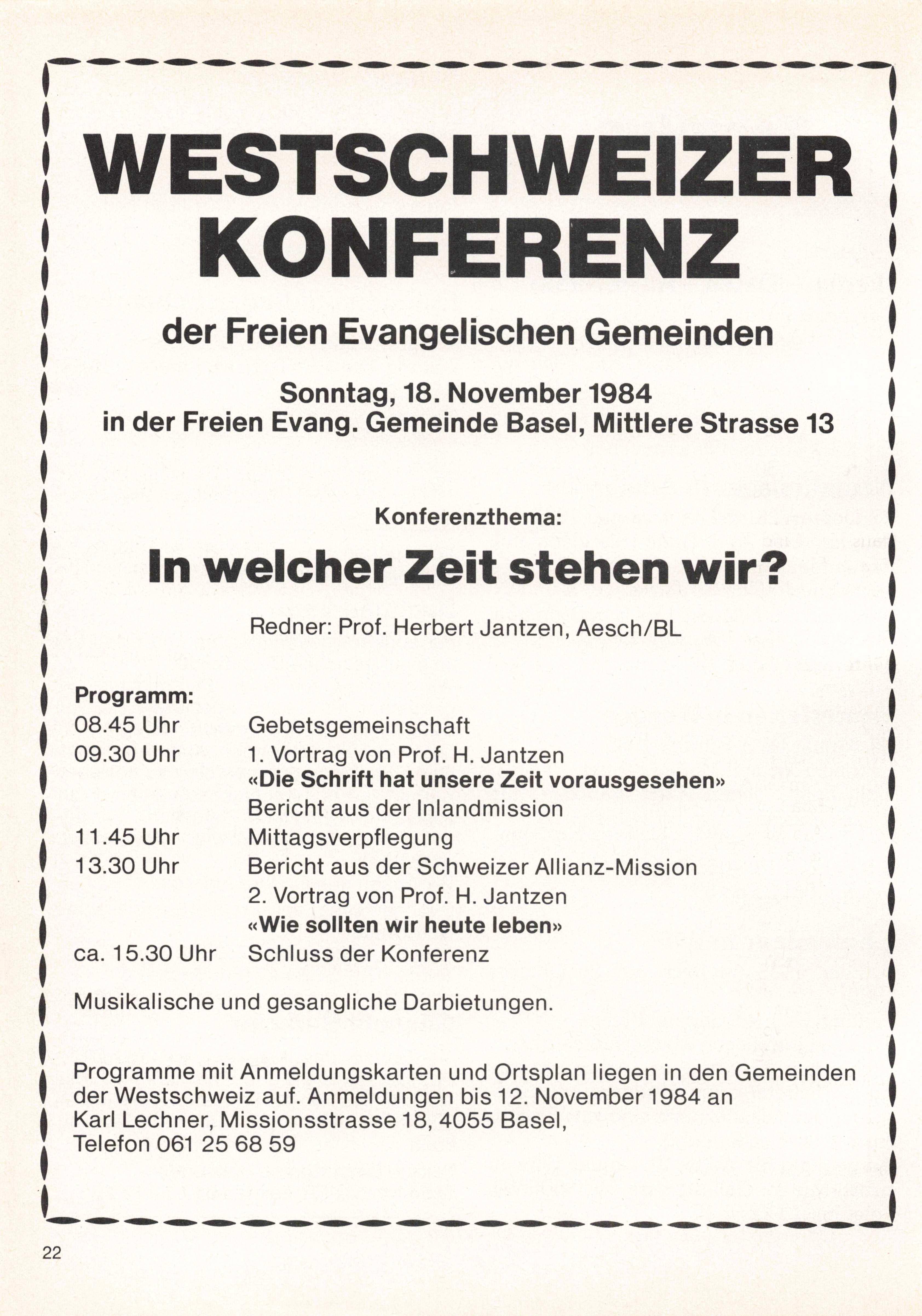 Programme mit Anmeldungskarten und Ortsplan liegen in den Gemeinden der Westschweiz auf. Anmeldungen bis 12. November 1984 an Karl Lechner, Missionsstrasse 18, 4055 Basel, Telefon 061 25 68 59