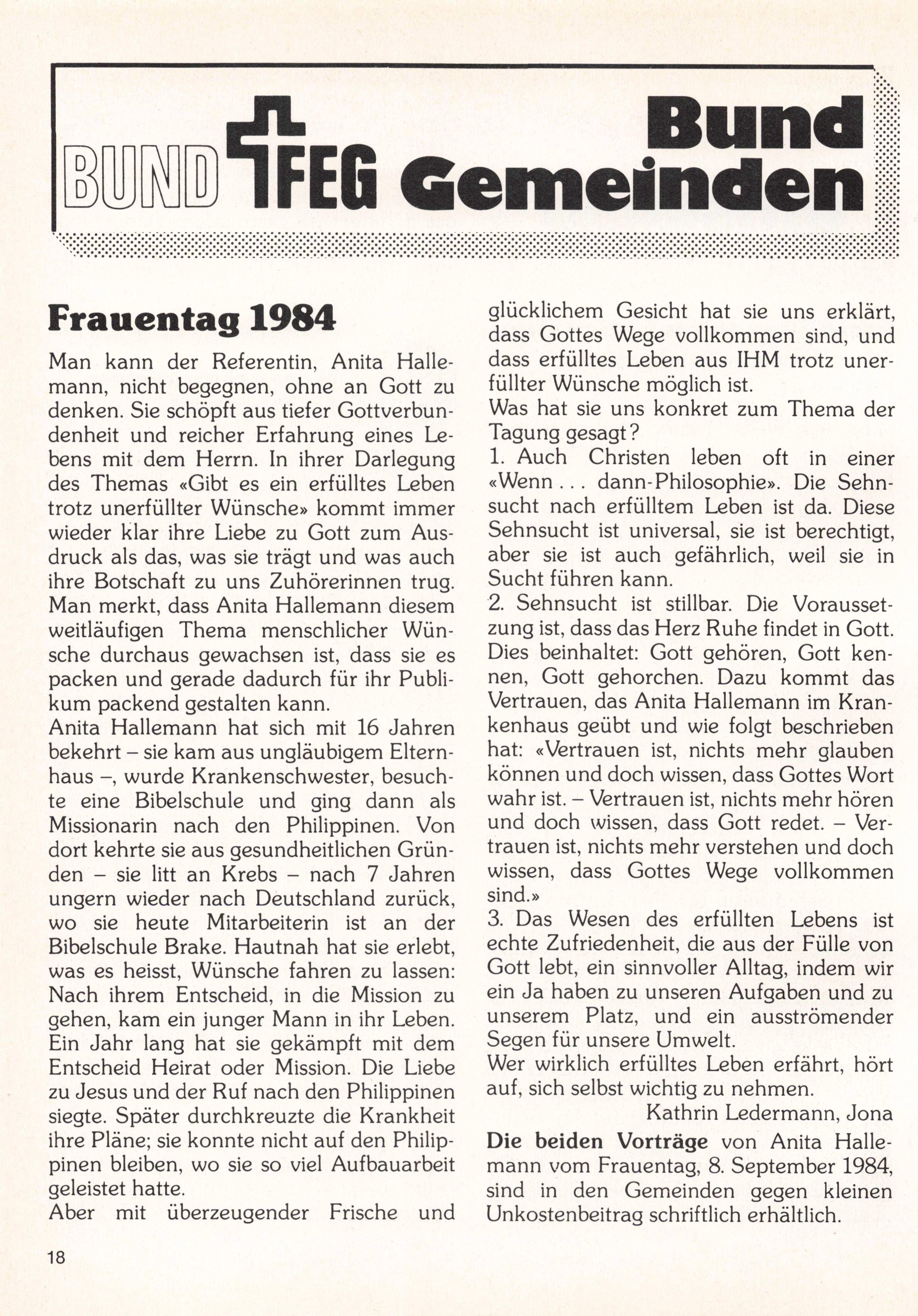 Kathrin Ledermann, Jona Die beiden Vorträge von Anita Halle mann vom Frauentag, 8. September 1984, sind in den Gemeinden gegen kleinen Unkostenbeitrag schriftlich erhältlich.