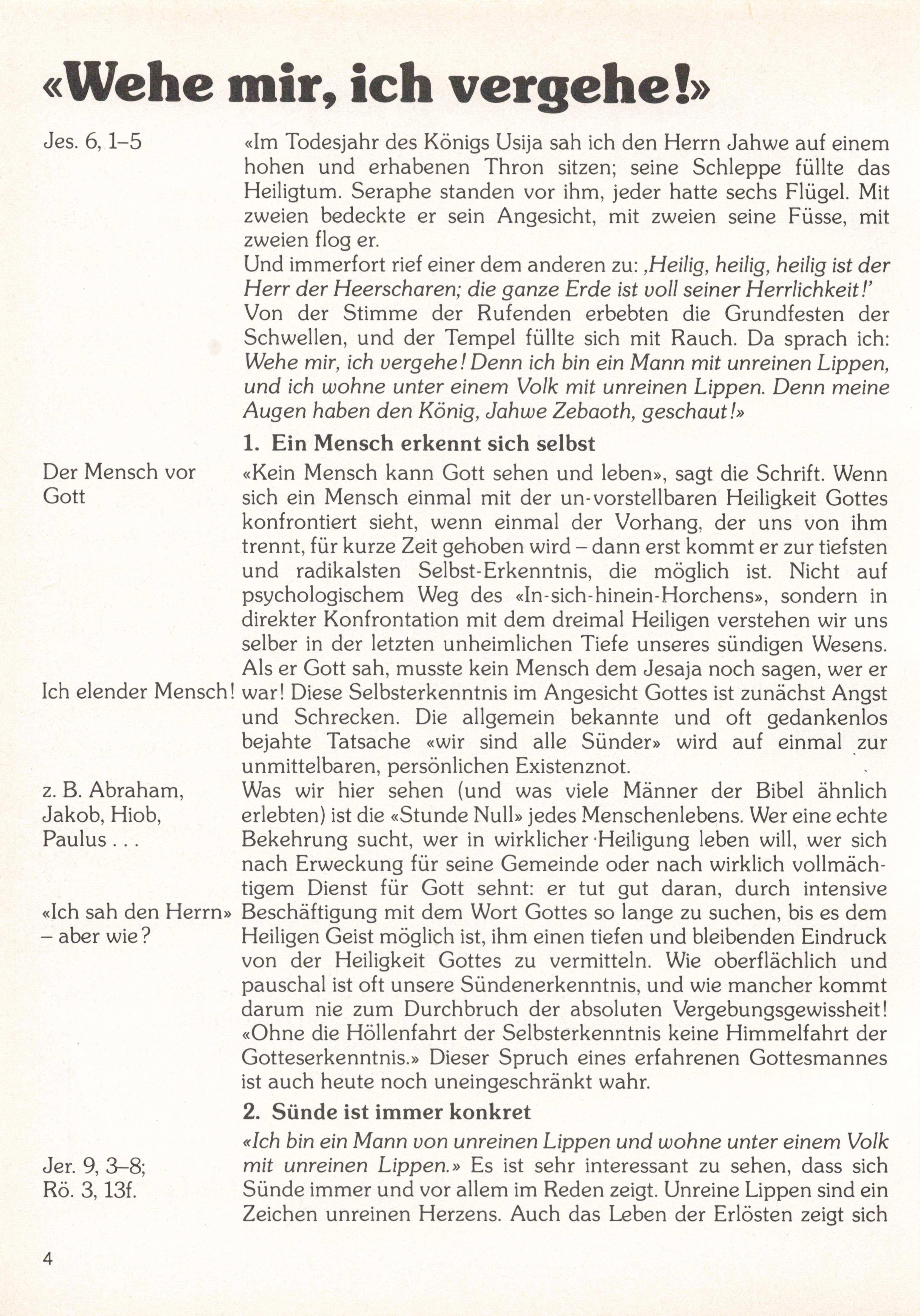 Der Mensch vor Gott «Kein Mensch kann Gott sehen und leben», sagt die Schrift. Wenn sich ein Mensch einmal mit der un-vorstellbaren Heiligkeit Gottes konfrontiert sieht, wenn einmal der Vorhang, der uns von ihm trennt, für kurze Zeit gehoben wird - dann erst kommt er zur tiefsten und radikalsten Selbst-Erkenntnis, die möglich ist. Nicht auf psychologischem Weg des «In-sich-hinein-Horchens», sondern in direkter Konfrontation mit dem dreimal Heiligen verstehen wir uns selber in der letzten unheimlichen Tiefe unseres sündigen Wesens. Als er Gott sah, musste kein Mensch dem Jesaja noch sagen, wer er Ich elender Mensch! war! Diese Selbsterkenntnis im Angesicht Gottes ist zunächst Angst und Schrecken. Die allgemein bekannte und oft gedankenlos bejahte Tatsache «wir sind alle Sünder» wird auf einmal zur unmittelbaren, persönlichen Existenznot. Was wir hier sehen (und was viele Männer der Bibel ähnlich erlebten) ist die «Stunde Null» jedes Menschenlebens. Wer eine echte Bekehrung sucht, wer in wirklicher Heiligung leben will, wer sich nach Erweckung für seine Gemeinde oder nach wirklich vollmäch tigem Dienst für Gott sehnt: er tut gut daran, durch intensive Beschäftigung mit dem Wort Gottes so lange zu suchen, bis es dem Heiligen Geist möglich ist, ihm einen tiefen und bleibenden Eindruck von der Heiligkeit Gottes zu vermitteln. Wie oberflächlich und pauschal ist oft unsere Sündenerkenntnis, und wie mancher kommt darum nie zum Durchbruch der absoluten Vergebungsgewissheit! «Ohne die Höllenfahrt der Selbsterkenntnis keine Himmelfahrt der