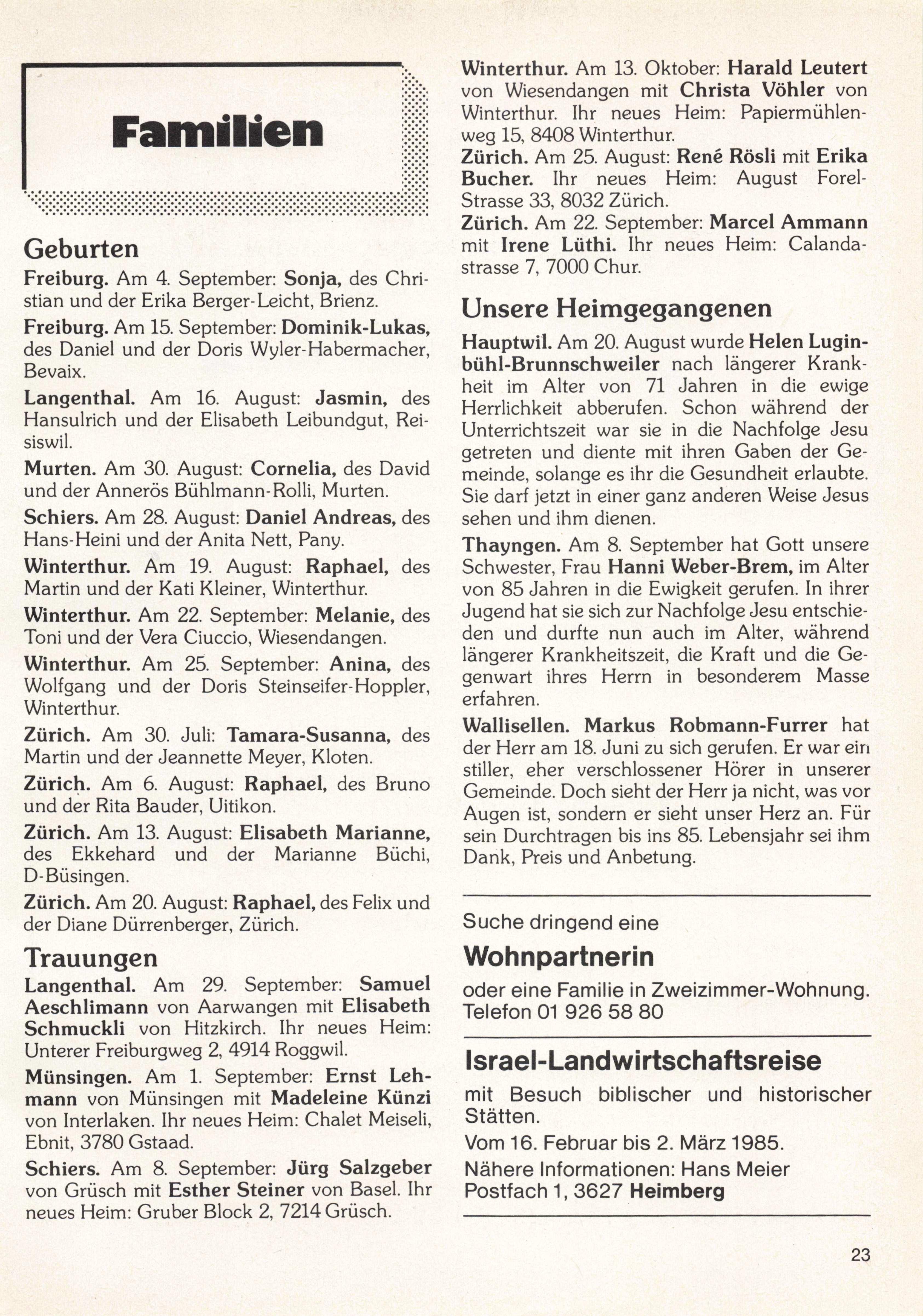 Langenthal. Am 29. September: Samuel Aeschlimann von Aarwangen mit Elisabeth Schmuckli von Hitzkirch. Ihr neues Heim: Unterer Freiburgweg 2, 4914 Roggwil. Münsingen. Am 1. September: Ernst Leh mann von Münsingen mit Madeleine Künzi von Interlaken. Ihr neues Heim: Chalet Meiseli, Ebnit, 3780 Gstaad.