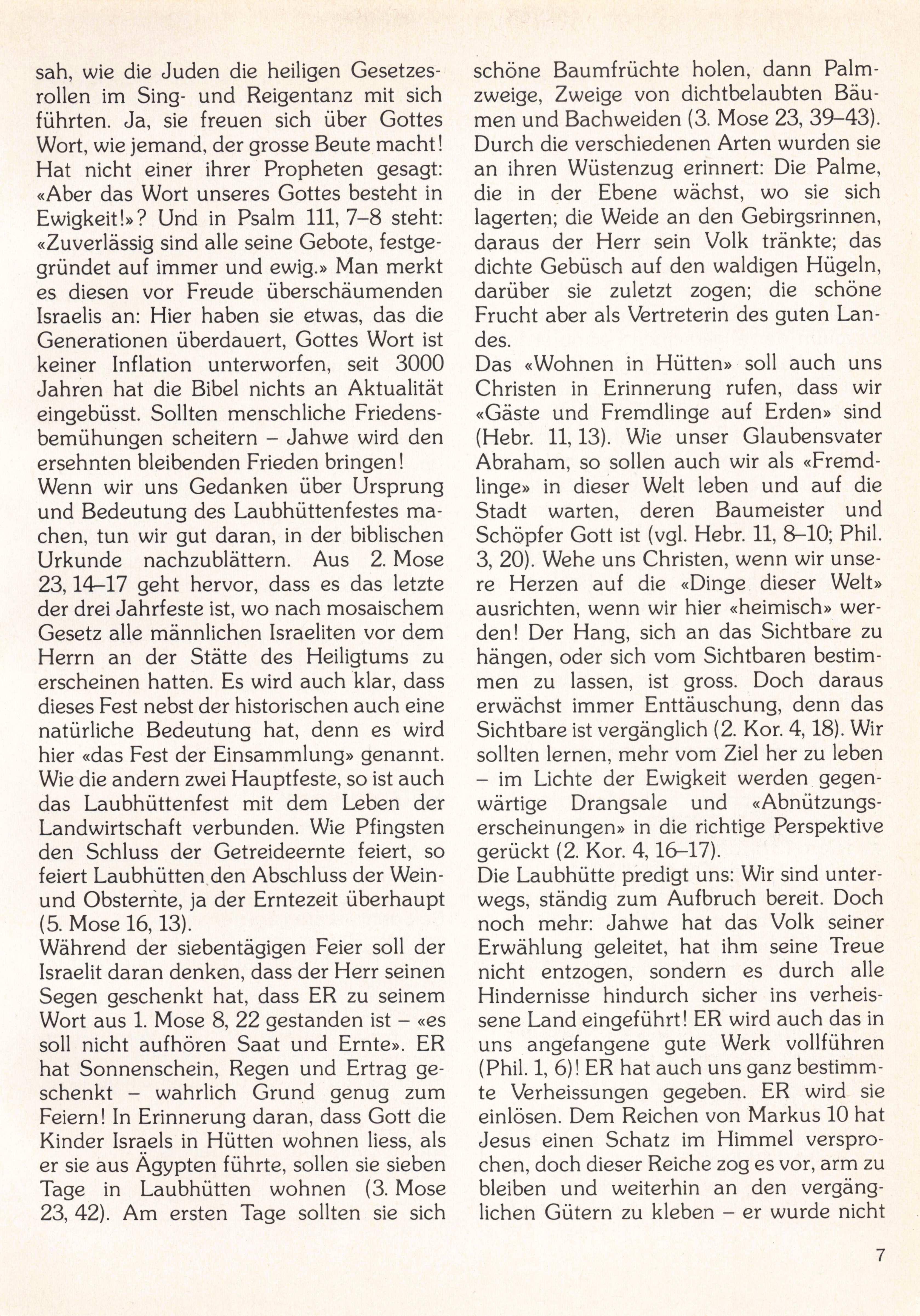 Wenn wir uns Gedanken über das Laub hüttenfest machen, dann ist auch das Studium der allgemeinen Festopfer inter essant. Man kommt auf eine Gesamtzahl von yOFarren, 14 Widdern, 98 Lämmern, 7 Ziegenböcken und 336 Zehntel Semmel mehl mit Öl - alle diese Zahlen lassen sich durch 7 dividieren. Die Siebenzahl liegt ja überhaupt den mosaischen Festzeiten zu grunde. Pro Jahr gab es 7 Festversamm lungen. Passah und Laubhütten dauern 7 Tage. Mit der «Sieben» ist auch die Grund idee der Ruhe verbunden. «Sabbat», ein Zurückführen, Erneuern und Wiederher stellen.