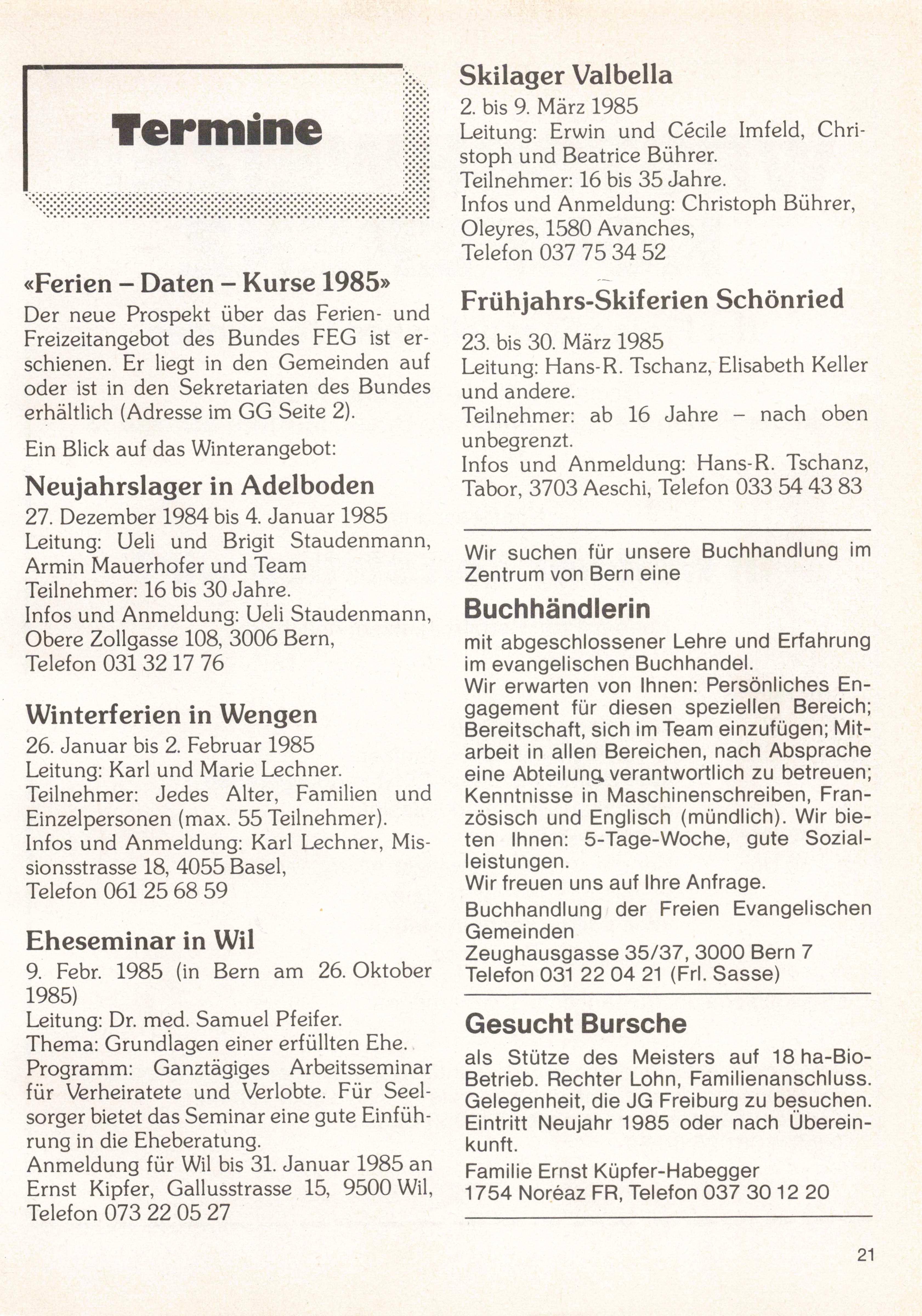 Leitung: Dr. med. Samuel Pfeifer. Thema: Grundlagen einer erfüllten Ehe. Programm: Ganztägiges Arbeitsseminar für Verheiratete und Verlobte. Für Seel sorger bietet das Seminar eine gute Einfüh rung in die Eheberatung. Anmeldung für Wil bis 31. Januar 1985 an Ernst Kipfer, Gallusstrasse 15, 9500 Wil, Telefon 073 22 05 27