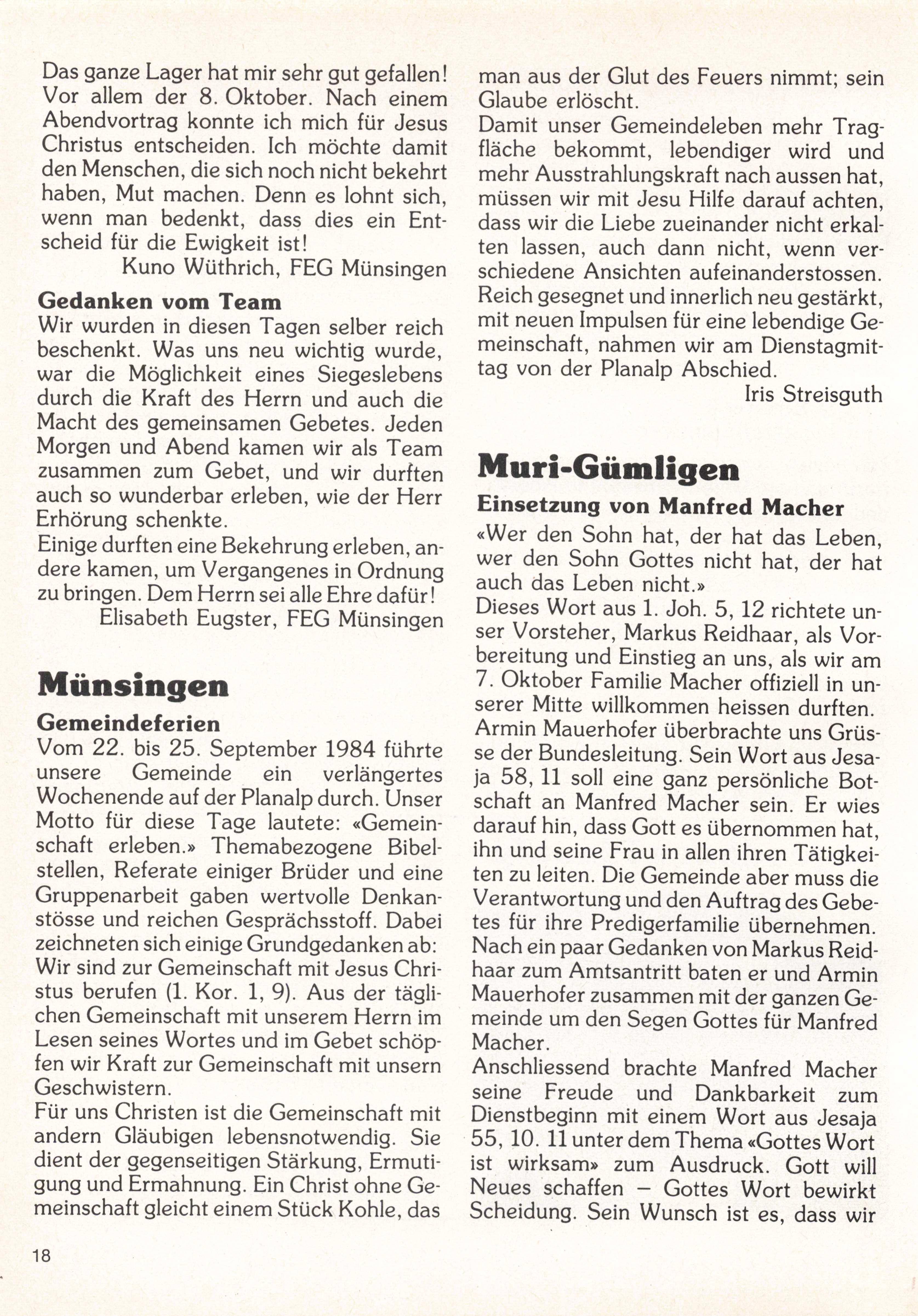 Manfred Macher, Hess-Strasse 8, 3073 Gümligen, Tel. 031 52 47 83 (FEG Gümligen)