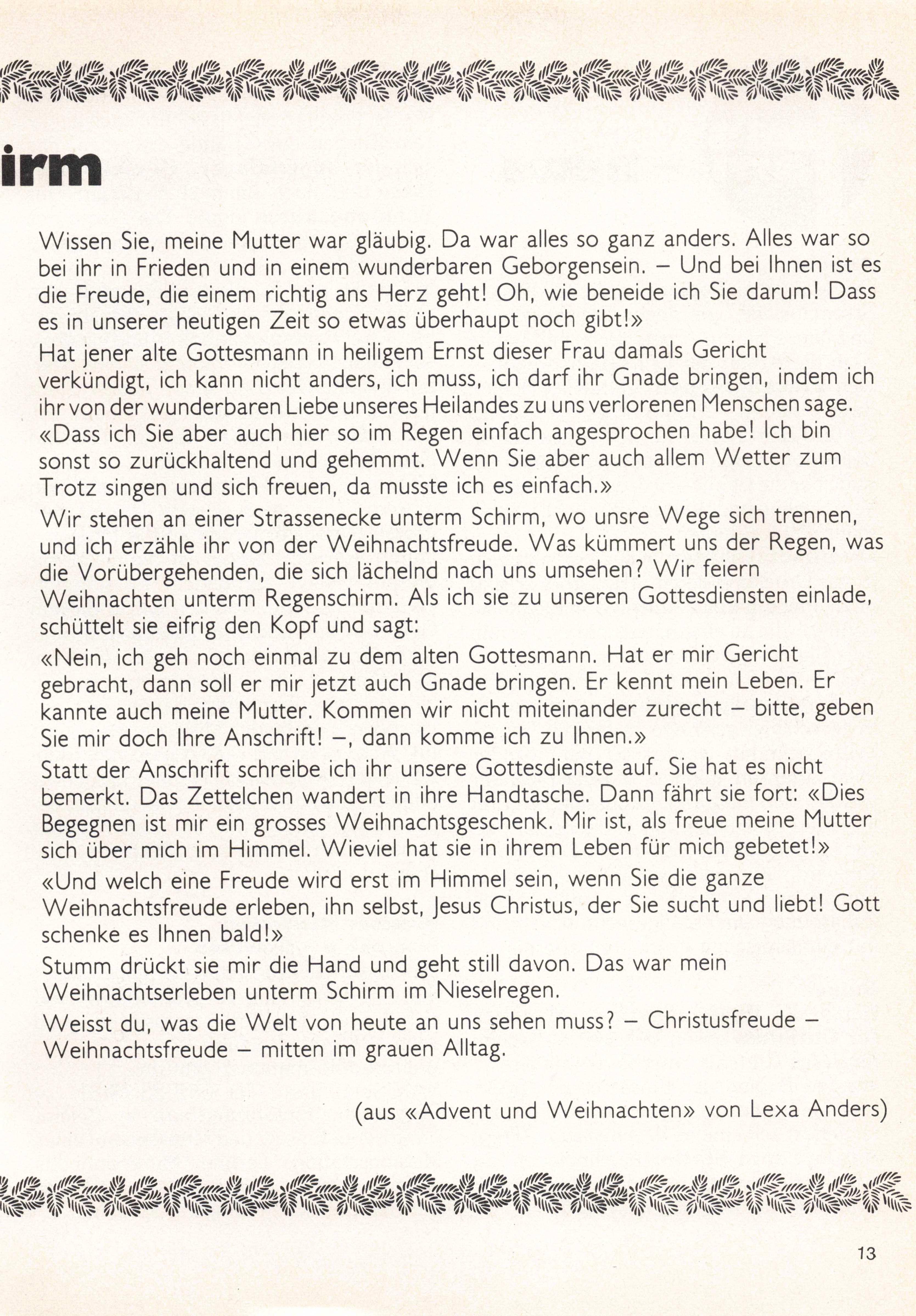 Im Unterrichtslager in Adelboden ist mir eine Sache wichtig geworden, ln diesem Lager habe ich mich bekehrt und durfte ei ne Wiedergeburt erleben. Ich durfte erle ben, dass Jesus in mein Leben kam. Nach her habe ich einen Bibelvers gemerkt, den ich besonders schön gefunden habe. Er steht in Galater 2, 20: «Und nicht mehr le be ich, sondern Christus lebt in mir.»