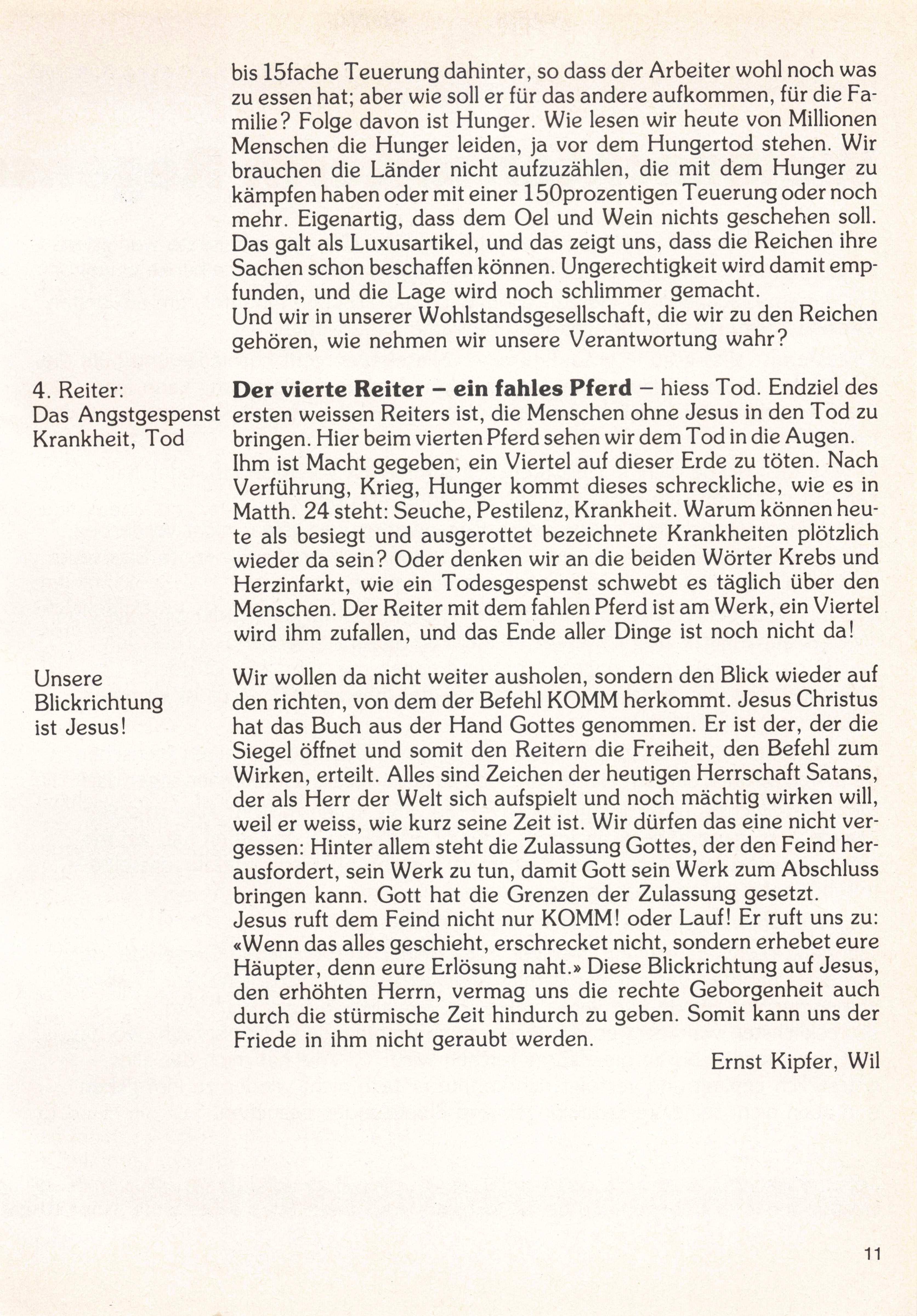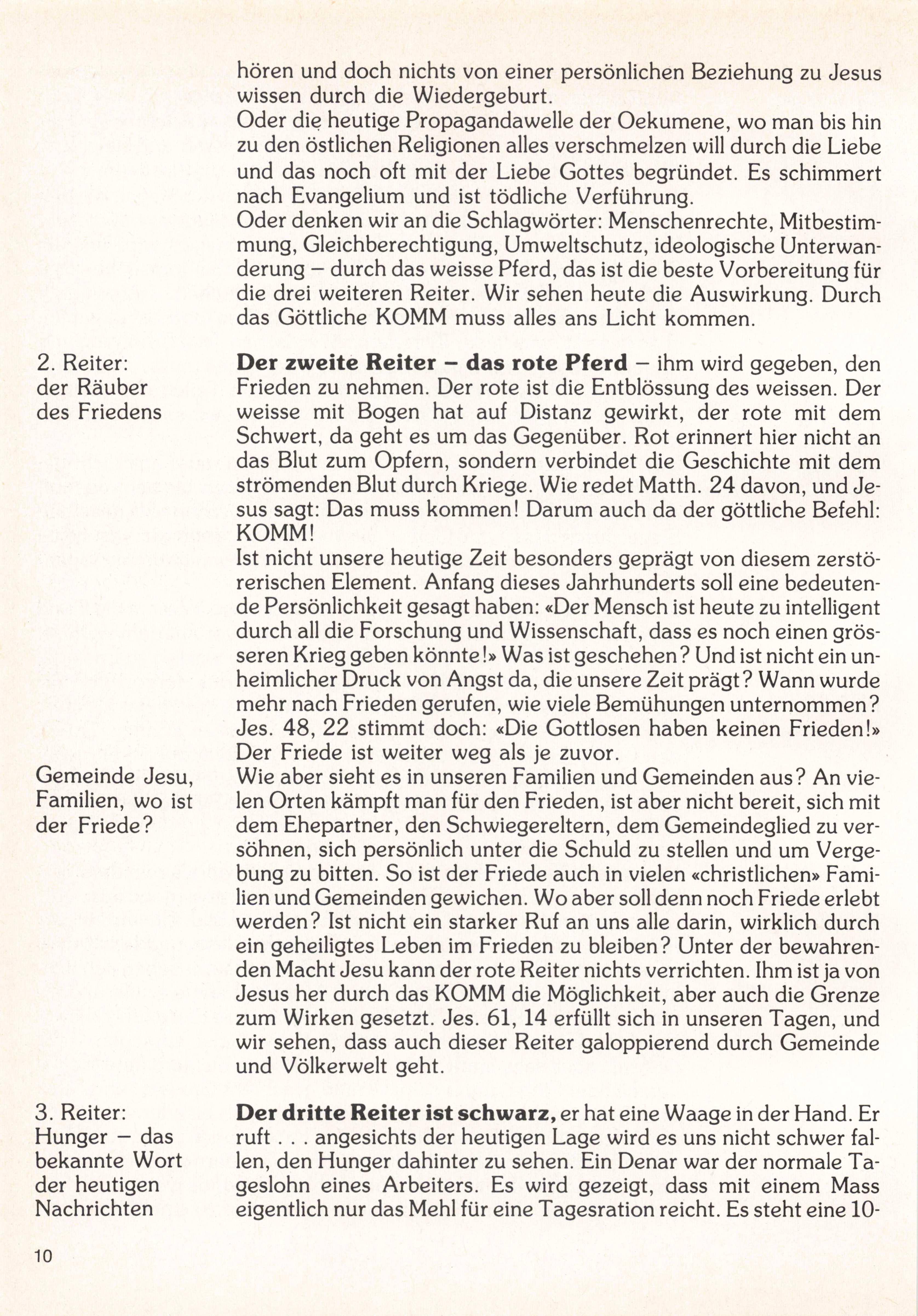 Ist nicht unsere heutige Zeit besonders geprägt von diesem zerstö rerischen Element. Anfang dieses Jahrhunderts soll eine bedeuten de Persönlichkeit gesagt haben: «Der Mensch ist heute zu intelligent durch all die Forschung und Wissenschaft, dass es noch einen grös seren Krieg geben könnte!» Was ist geschehen ? Und ist nicht ein un heimlicher Druck von Angst da, die unsere Zeit prägt? Wann wurde mehr nach Frieden gerufen, wie viele Bemühungen unternommen? Jes. 48, 22 stimmt doch: «Die Gottlosen haben keinen Frieden!» Der Friede ist weiter weg als je zuvor. Wie aber sieht es in unseren Familien und Gemeinden aus? An vie len Orten kämpft man für den Frieden, ist aber nicht bereit, sich mit dem Ehepartner, den Schwiegereltern, dem Gemeindeglied zu ver söhnen, sich persönlich unter die Schuld zu stellen und um Verge bung zu bitten. So ist der Friede auch in vielen «christlichen» Fami lien und Gemeinden gewichen. Wo aber soll denn noch Friede erlebt werden? Ist nicht ein starker Ruf an uns alle darin, wirklich durch ein geheiligtes Leben im Frieden zu bleiben? Unter der bewahren den Macht Jesu kann der rote Reiter nichts verrichten. Ihm ist ja von Jesus her durch das KOMM die Möglichkeit, aber auch die Grenze zum Wirken gesetzt. Jes. 61,14 erfüllt sich in unseren Tagen, und wir sehen, dass auch dieser Reiter galoppierend durch Gemeinde und Völkerwelt geht.