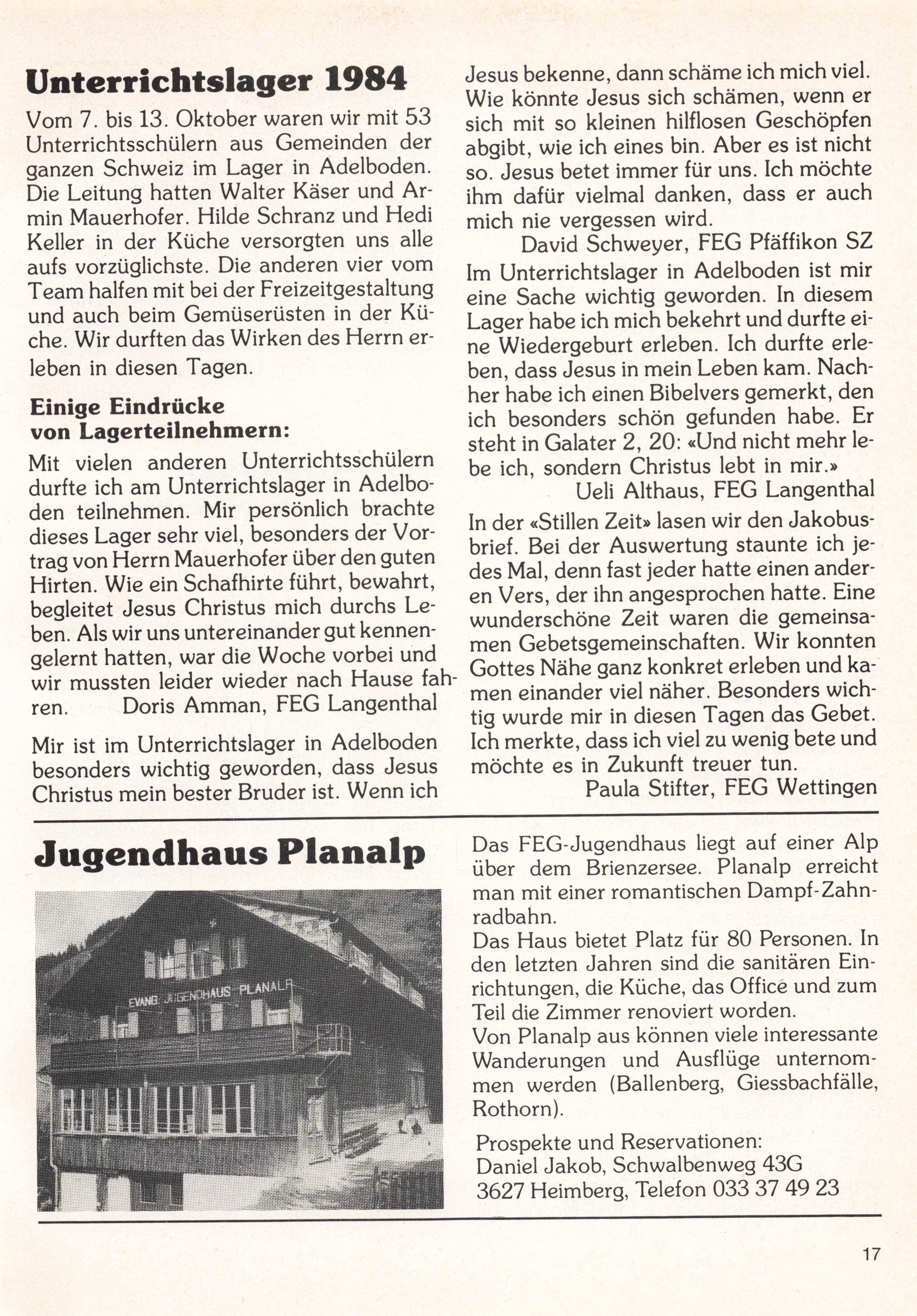 Vom 22. bis 25. September 1984 führte verlängertes Gemeinde unsere Wochenende auf der Planalp durch. Unser Motto für diese Tage lautete; «Gemein schaft erleben.» Themabezogene Bibel stellen, Referate einiger Brüder und eine Gruppenarbeit gaben wertvolle Denkanstösse und reichen Gesprächsstoff. Dabei zeichneten sich einige Grundgedanken ab: Wir sind zur Gemeinschaft mit Jesus Chri stus berufen (1. Kor. 1, 9). Aus der tägli chen Gemeinschaft mit unserem Herrn im Lesen seines Wortes und im Gebet schöp fen wir Kraft zur Gemeinschaft mit unsern Geschwistern.