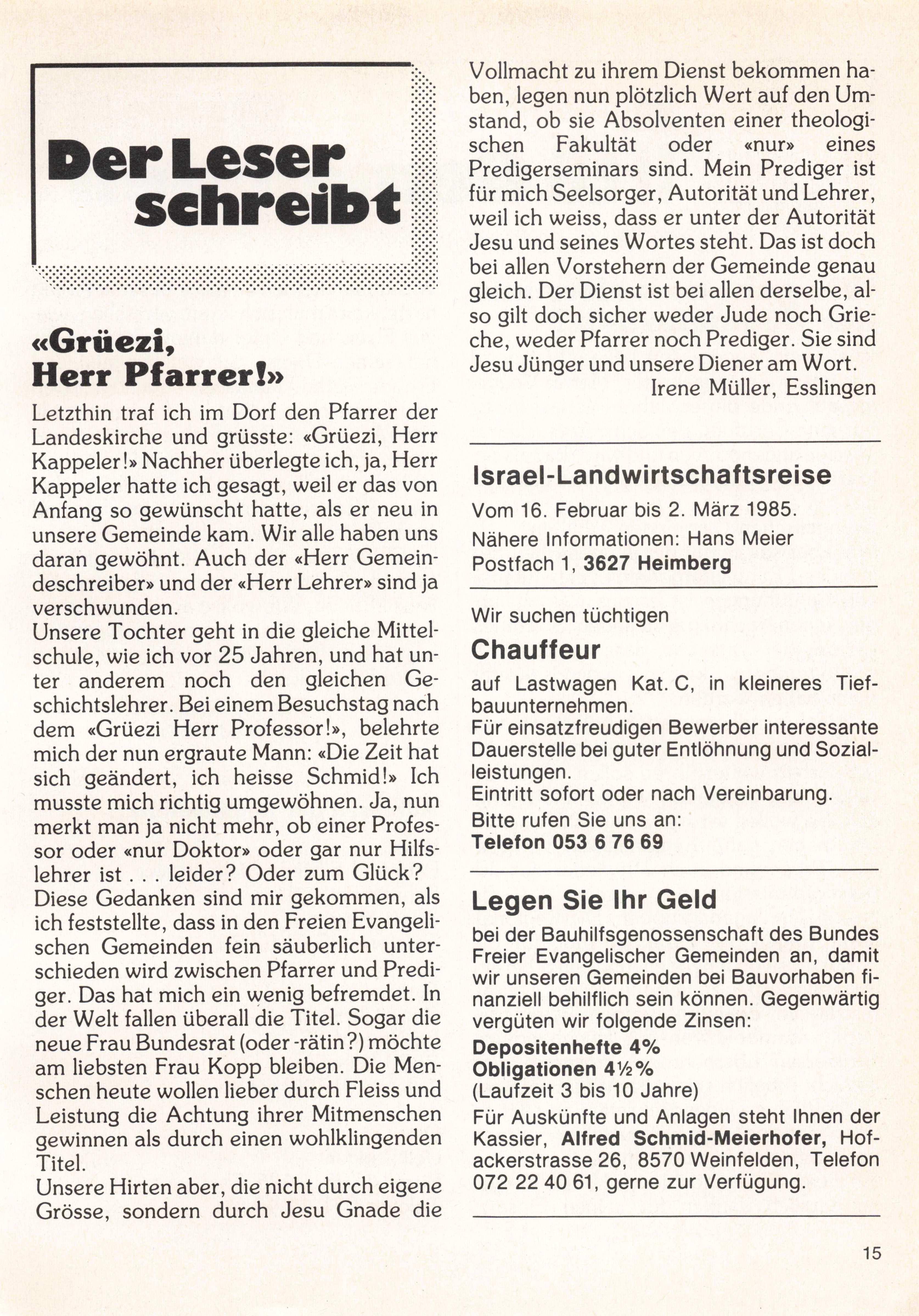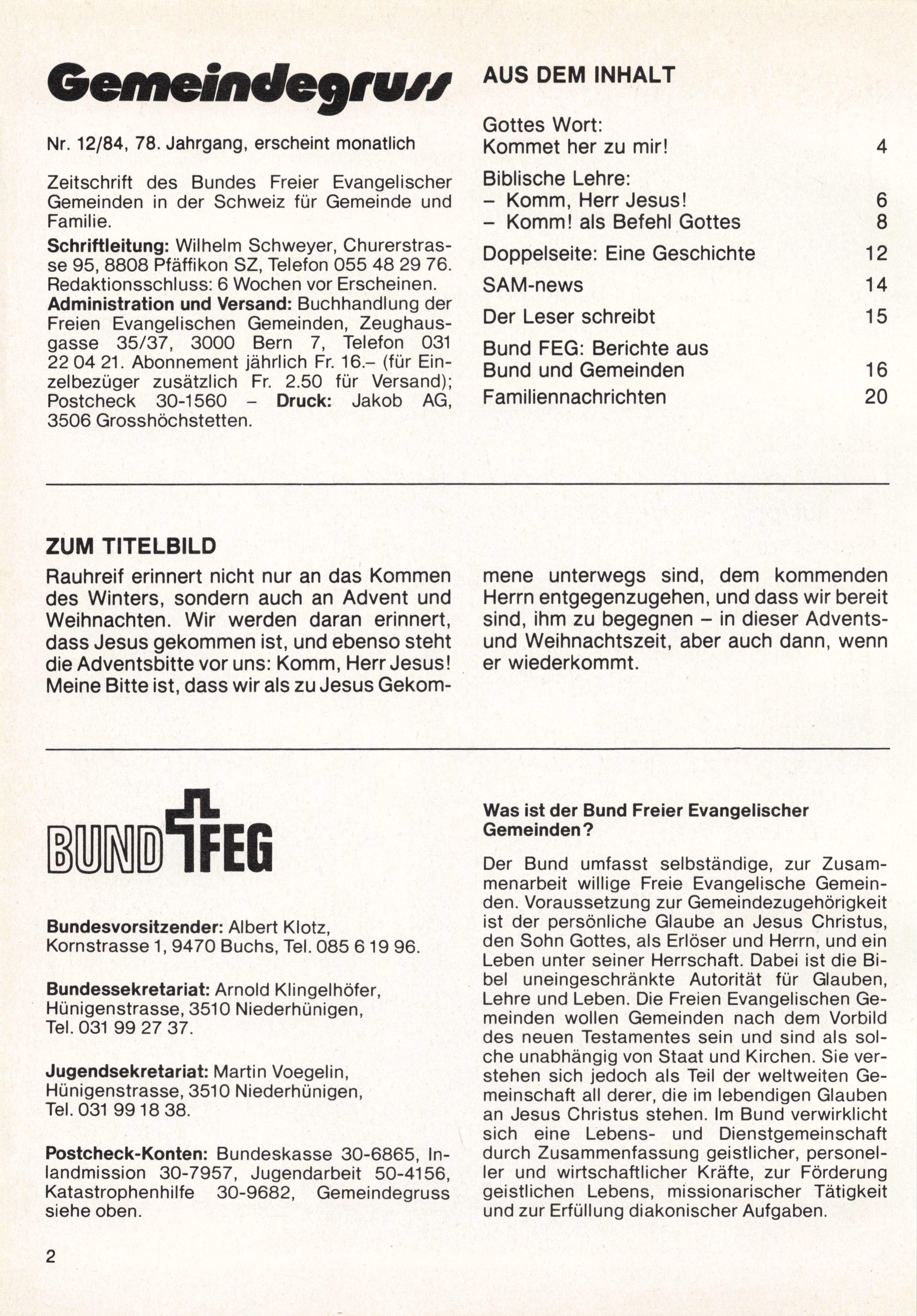 Schriftleitung: Wilhelm Schweyer, Churerstrasse 95, 8808 Pfäffikon SZ, Telefon 055 48 29 76. Redaktionsschluss: 6 Wochen vor Erscheinen. Administration und Versand: Buchhandlung der Freien Evangelischen Gemeinden, Zeughaus gasse 35/37, 3000 Bern 7, Telefon 031 22 04 21. Abonnement jährlich Fr. 16.- (für Ein zelbezüger zusätzlich Fr. 2.50 für Versand); Postcheck 30-15603506 Grosshöchstetten.