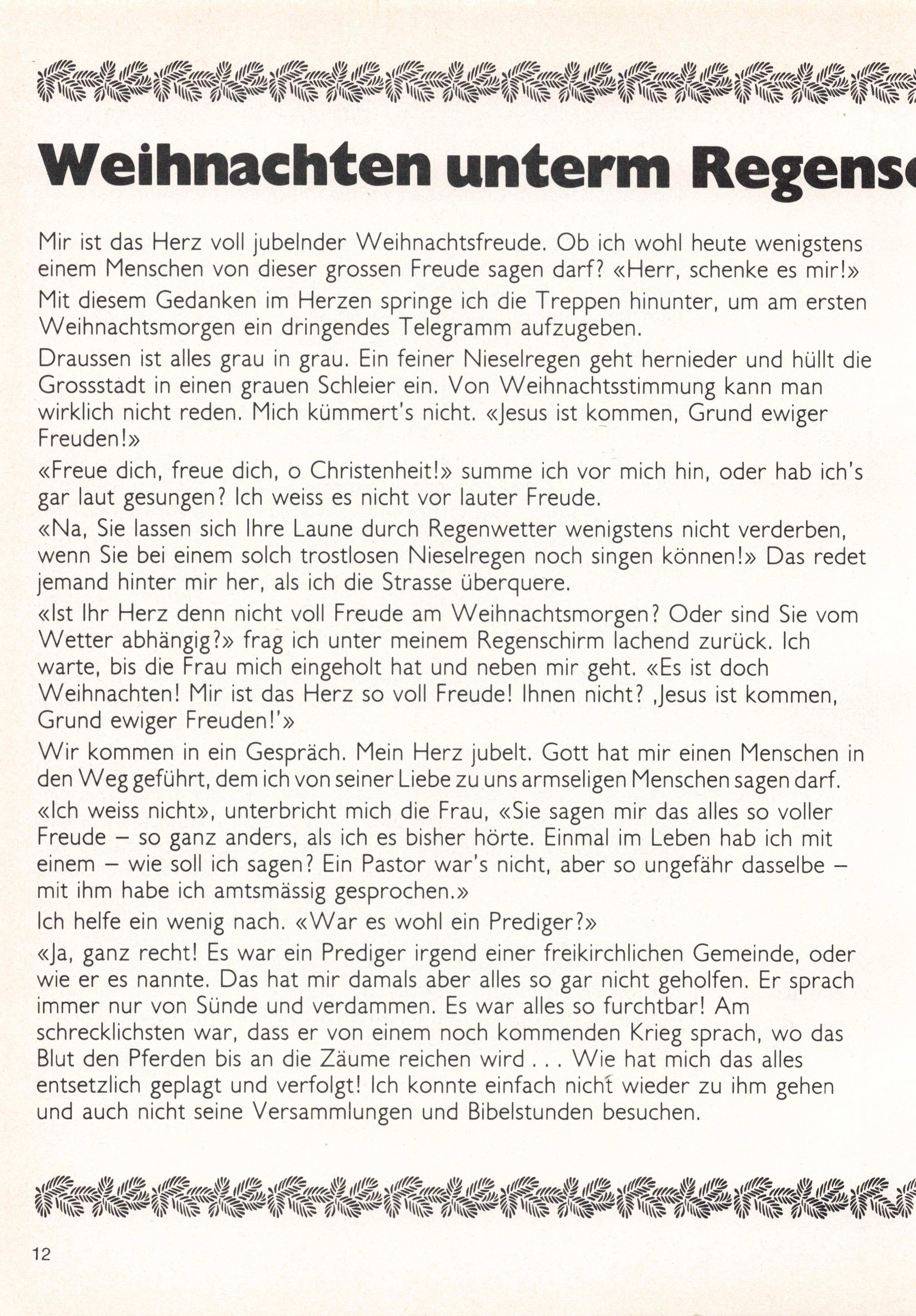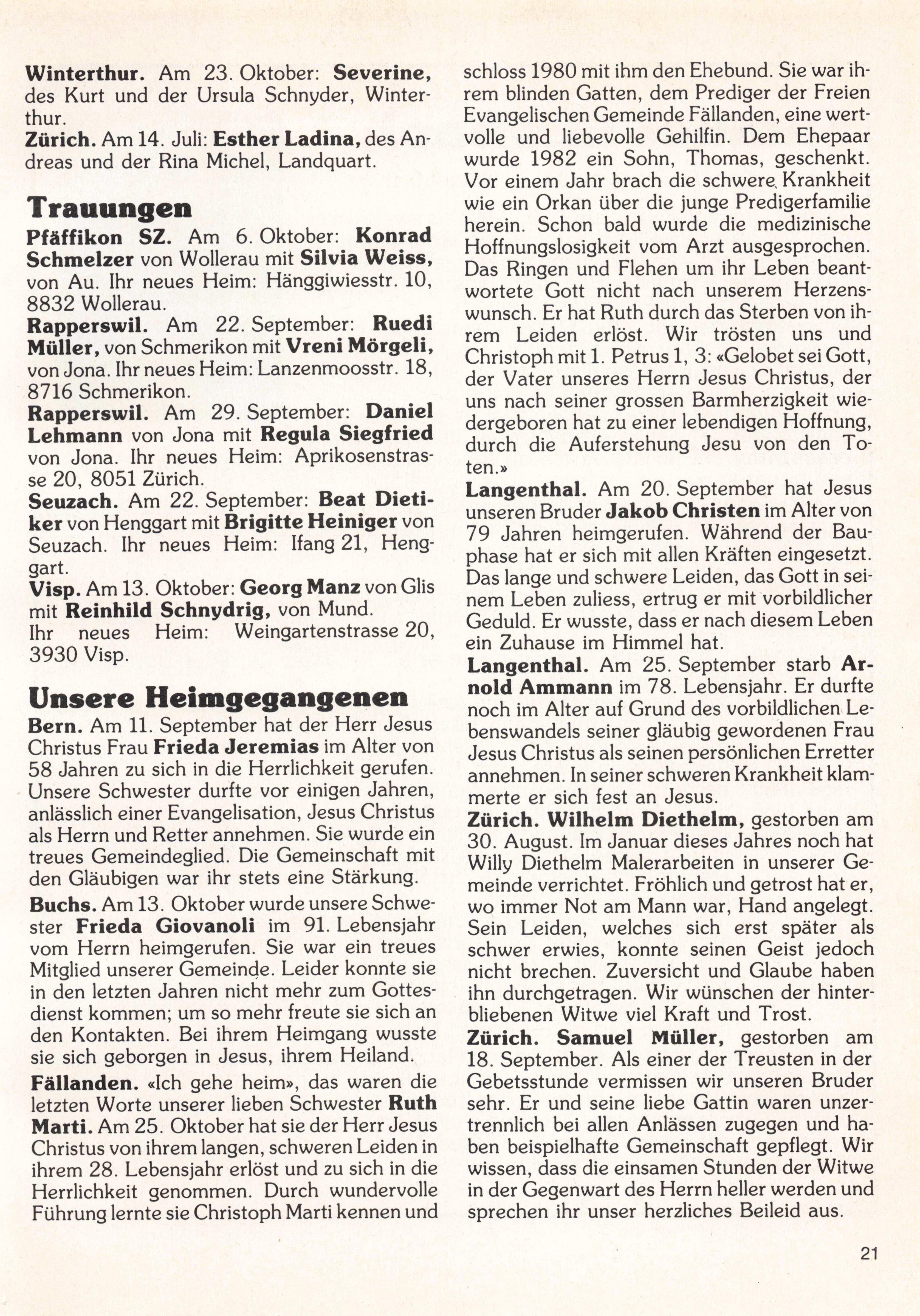 Bern. Am 11. September hat der Herr Jesus Christus Frau Frieda Jeremias im Alter von 58 Jahren zu sich in die Herrlichkeit gerufen. Unsere Schwester durfte vor einigen Jahren, anlässlich einer Evangelisation, Jesus Christus als Herrn und Retter annehmen. Sie wurde ein treues Gemeindeglied. Die Gemeinschaft mit den Gläubigen war ihr stets eine Stärkung. Buchs. Am 13. Oktober wurde unsere Schwe ster Frieda Giovanoli im 91. Lebensjahr vom Herrn heimgerufen. Sie war ein treues Mitglied unserer Gemeinde. Leider konnte sie in den letzten Jahren nicht mehr zum Gottes dienst kommen; um so mehr freute sie sich an den Kontakten. Bei ihrem Heimgang wusste sie sich geborgen in Jesus, ihrem Heiland. Fällanden. «Ich gehe heim», das waren die letzten Worte unserer lieben Schwester Ruth Marti. Am 25. Oktober hat sie der Herr Jesus Christus von ihrem langen, schweren Leiden in ihrem 28. Lebensjahr erlöst und zu sich in die Herrlichkeit genommen. Durch wundervolle Führung lernte sie Christoph Marti kennen und