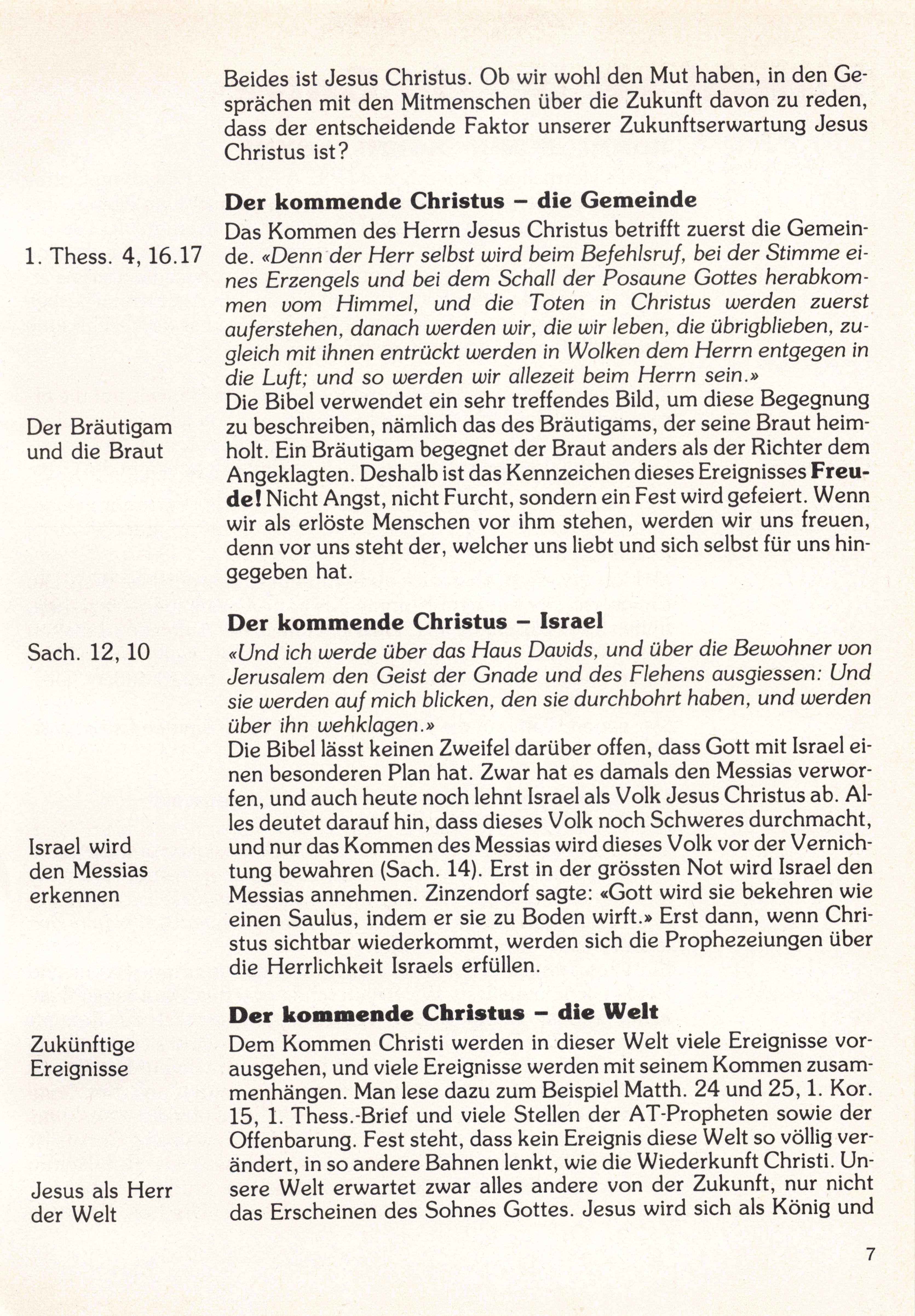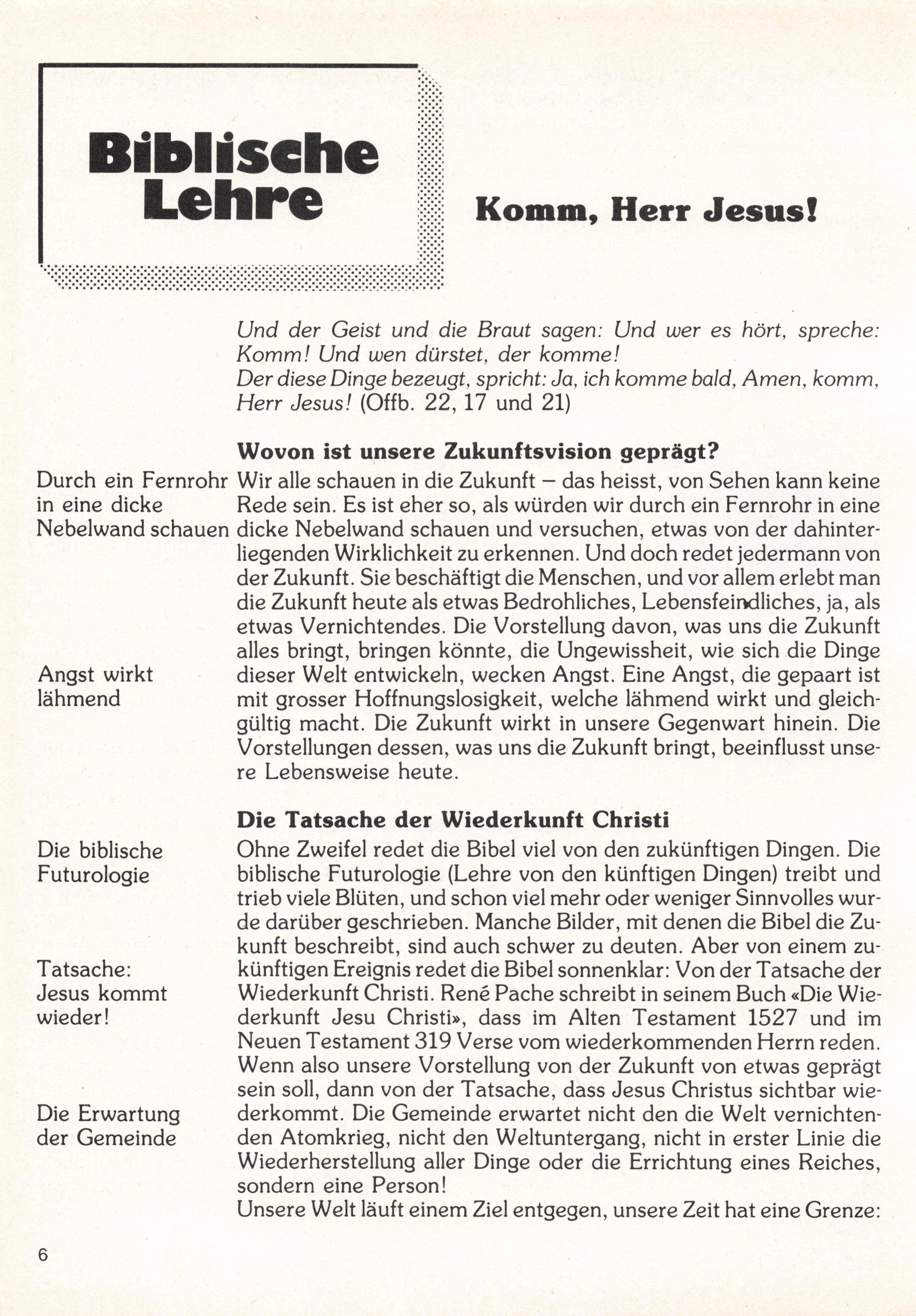 Ohne Zweifel redet die Bibel viel von den zukünftigen Dingen. Die biblische Futurologie (Lehre von den künftigen Dingen) treibt und trieb viele Blüten, und schon viel mehr oder weniger Sinnvolles wur de darüber geschrieben. Manche Bilder, mit denen die Bibel die Zu kunft beschreibt, sind auch schwer zu deuten. Aber von einem zu künftigen Ereignis redet die Bibel sonnenklar: Von der Tatsache der Wiederkunft Christi. Rene Fache schreibt in seinem Buch «Die Wie derkunft Jesu Christi», dass im Alten Testament 1527 und im Neuen Testament 319 Verse vom wiederkommenden Herrn reden. Wenn also unsere Vorstellung von der Zukunft von etwas geprägt sein soll, dann von der Tatsache, dass Jesus Christus sichtbar wie derkommt. Die Gemeinde erwartet nicht den die Welt vernichten den Atomkrieg, nicht den Weltuntergang, nicht in erster Linie die Wiederherstellung aller Dinge oder die Errichtung eines Reiches, sondern eine Person!