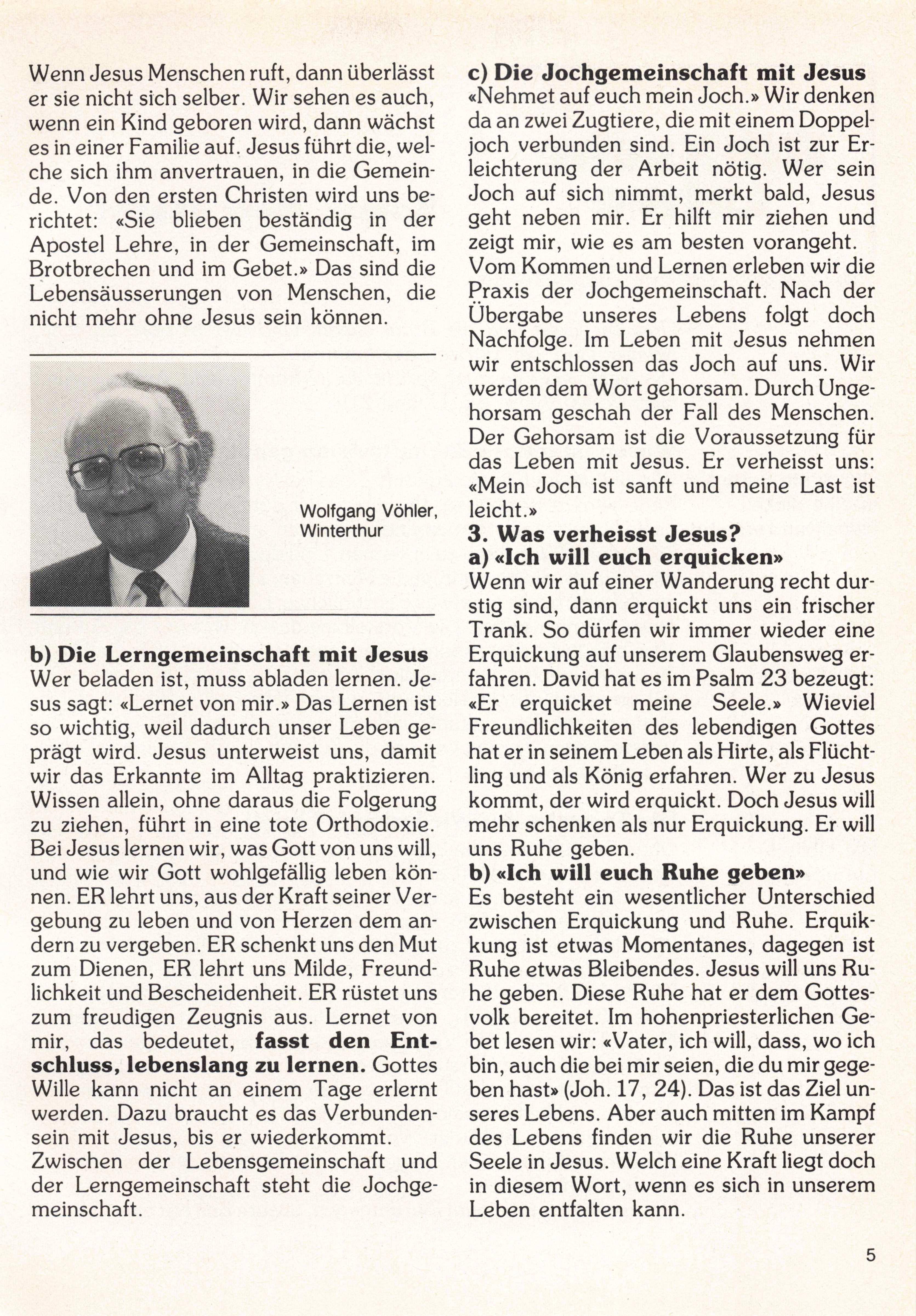 b) Die Lerngemeinschaft mit Jesus Wer beladen ist, muss abladen lernen. Je sus sagt: «Lernet von mir.» Das Lernen ist so wichtig, weil dadurch unser Leben ge prägt wird. Jesus unterweist uns, damit wir das Erkannte im Alltag praktizieren. Wissen allein, ohne daraus die Folgerung zu ziehen, führt in eine tote Orthodoxie. Bei Jesus lernen wir, was Gott von uns will, und wie wir Gott wohlgefällig leben kön nen. ER lehrt uns, aus der Kraft seiner Ver gebung zu leben und von Herzen dem an dern zu vergeben. ER schenkt uns den Mut zum Dienen, ER lehrt uns Milde, Freund lichkeit und Bescheidenheit. ER rüstet uns zum freudigen Zeugnis aus. Lernet von mir, das bedeutet, fasst den Ent schluss, lebenslang zu lernen. Gottes Wille kann nicht an einem Tage erlernt werden. Dazu braucht es das Verbunden sein mit Jesus, bis er wiederkommt. Zwischen der Lebensgemeinschaft und der Lerngemeinschaft steht die Jochge meinschaft.