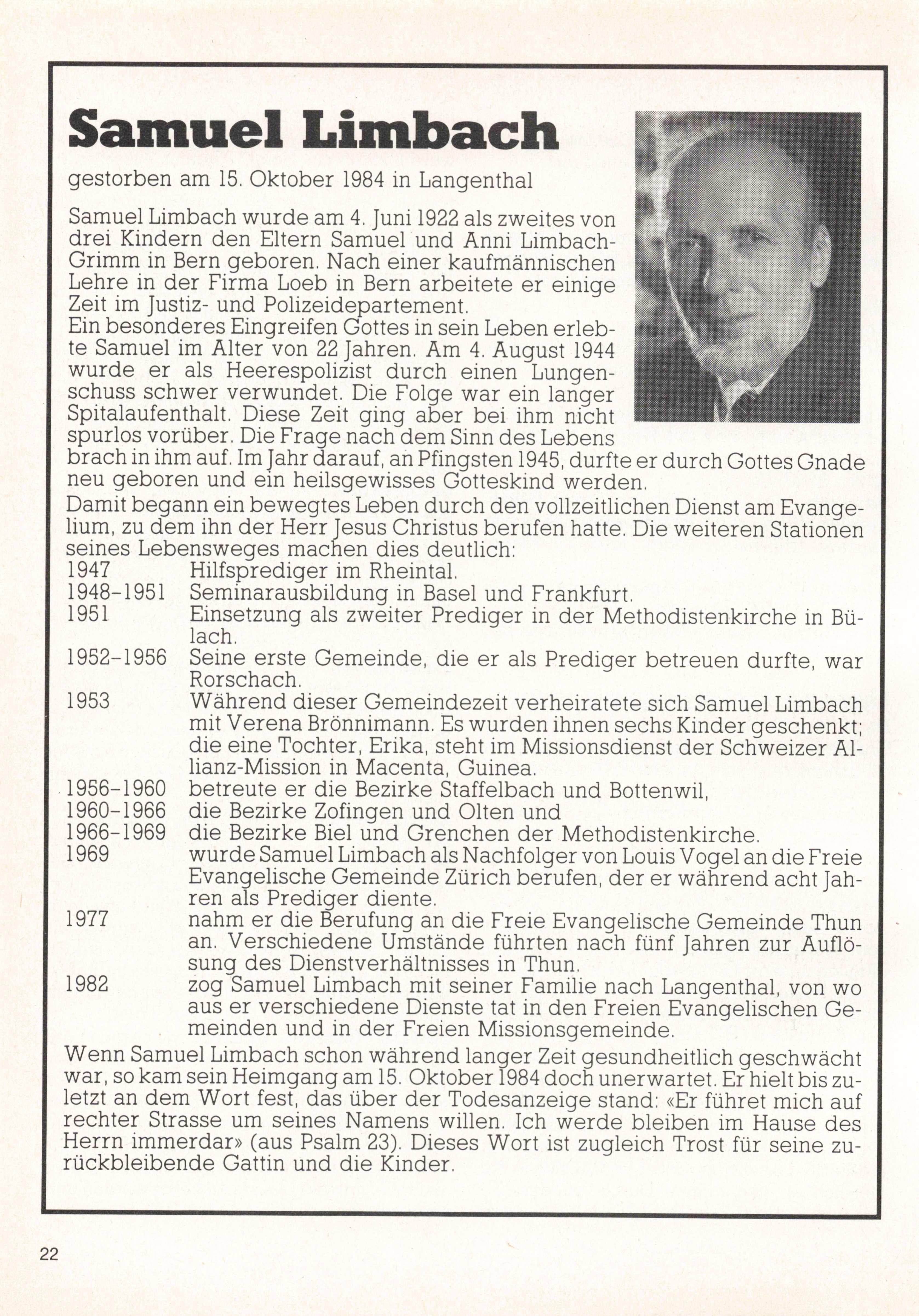 Während dieser Gemeindezeit verheiratete sich Samuel Limbach mit Verena Brönnimann. Es wurden ihnen sechs Kinder geschenkt; die eine Tochter, Erika, steht im Missionsdienst der Schweizer Al lianz-Mission in Macenta, Guinea, betreute er die Bezirke Staffelbach und Bottenwil, die Bezirke Zofingen und Olten und die Bezirke Biel und Grenchen der Methodistenkirche, wurde Samuel Limbach als Nachfolger von Louis Vogel an die Freie Evangelische Gemeinde Zürich berufen, der er während acht Jah ren als Prediger diente, nahm er die Berufung an die Freie Evangelische Gemeinde Thun an. Verschiedene Umstände führten nach fünf Jahren zur Auflö sung des Dienstverhältnisses in Thun, zog Samuel Limbach mit seiner Familie nach Langenthal, von wo aus er verschiedene Dienste tat in den Freien Evangelischen Ge meinden und in der Freien Missionsgemeinde. Wenn Samuel Limbach schon während langer Zeit gesundheitlich geschwächt war, so kam sein Heimgang am 15. Oktober 1984 doch unerwartet. Er hielt bis zu letzt an dem Wort fest, das über der Todesanzeige stand: «Er führet mich auf rechter Strasse um seines Namens willen. Ich werde bleiben im Hause des Herrn immerdar» (aus Psalm 23). Dieses Wort ist zugleich Trost für seine zu rückbleibende Gattin und die Kinder.
