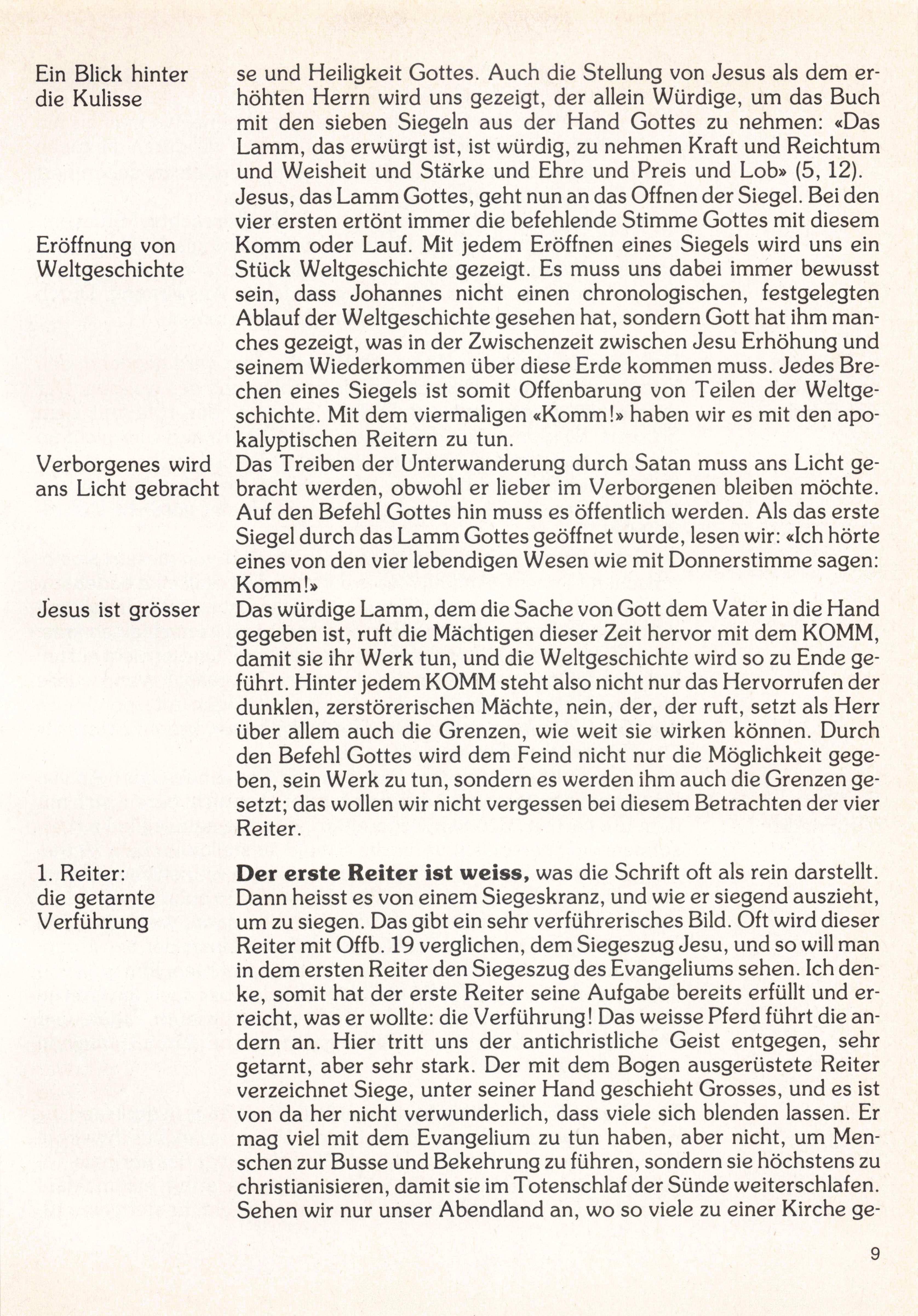 se und Heiligkeit Gottes. Auch die Stellung von Jesus als dem er höhten Herrn wird uns gezeigt, der allein Würdige, um das Buch mit den sieben Siegeln aus der Hand Gottes zu nehmen: «Das Lamm, das erwürgt ist, ist würdig, zu nehmen Kraft und Reichtum und Weisheit und Stärke und Ehre und Preis und Lob» (5, 12). Jesus, das Lamm Gottes, geht nun an das Offnen der Siegel. Bei den vier ersten ertönt immer die befehlende Stimme Gottes mit diesem Komm oder Lauf. Mit jedem Eröffnen eines Siegels wird uns ein Stück Weltgeschichte gezeigt. Es muss uns dabei immer bewusst sein, dass Johannes nicht einen chronologischen, festgelegten Ablauf der Weltgeschichte gesehen hat, sondern Gott hat ihm man ches gezeigt, was in der Zwischenzeit zwischen Jesu Erhöhung und seinem Wiederkommen über diese Erde kommen muss. Jedes Bre chen eines Siegels ist somit Offenbarung von Teilen der Weltge schichte. Mit dem viermaligen «Komm!» haben wir es mit den apo kalyptischen Reitern zu tun.