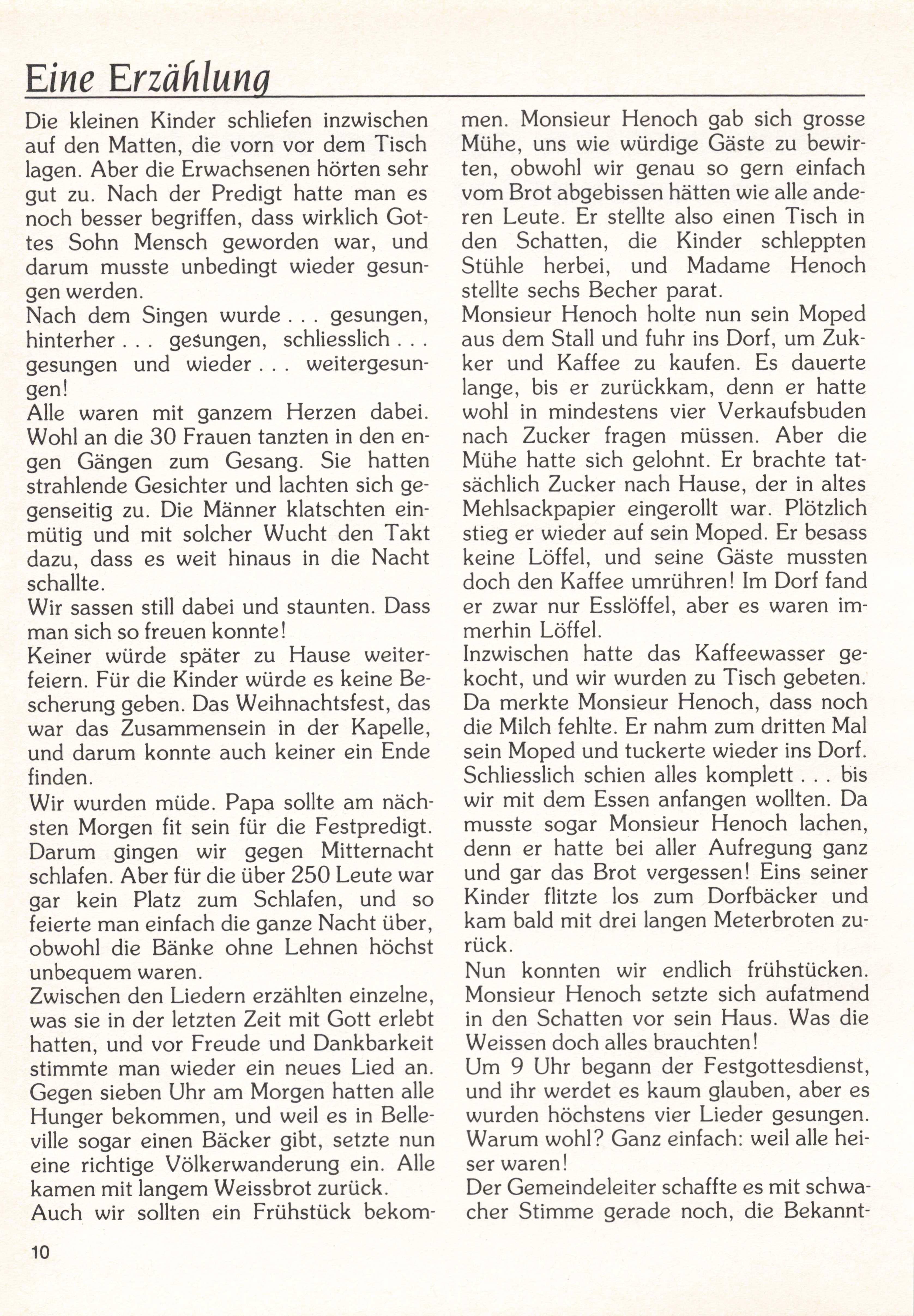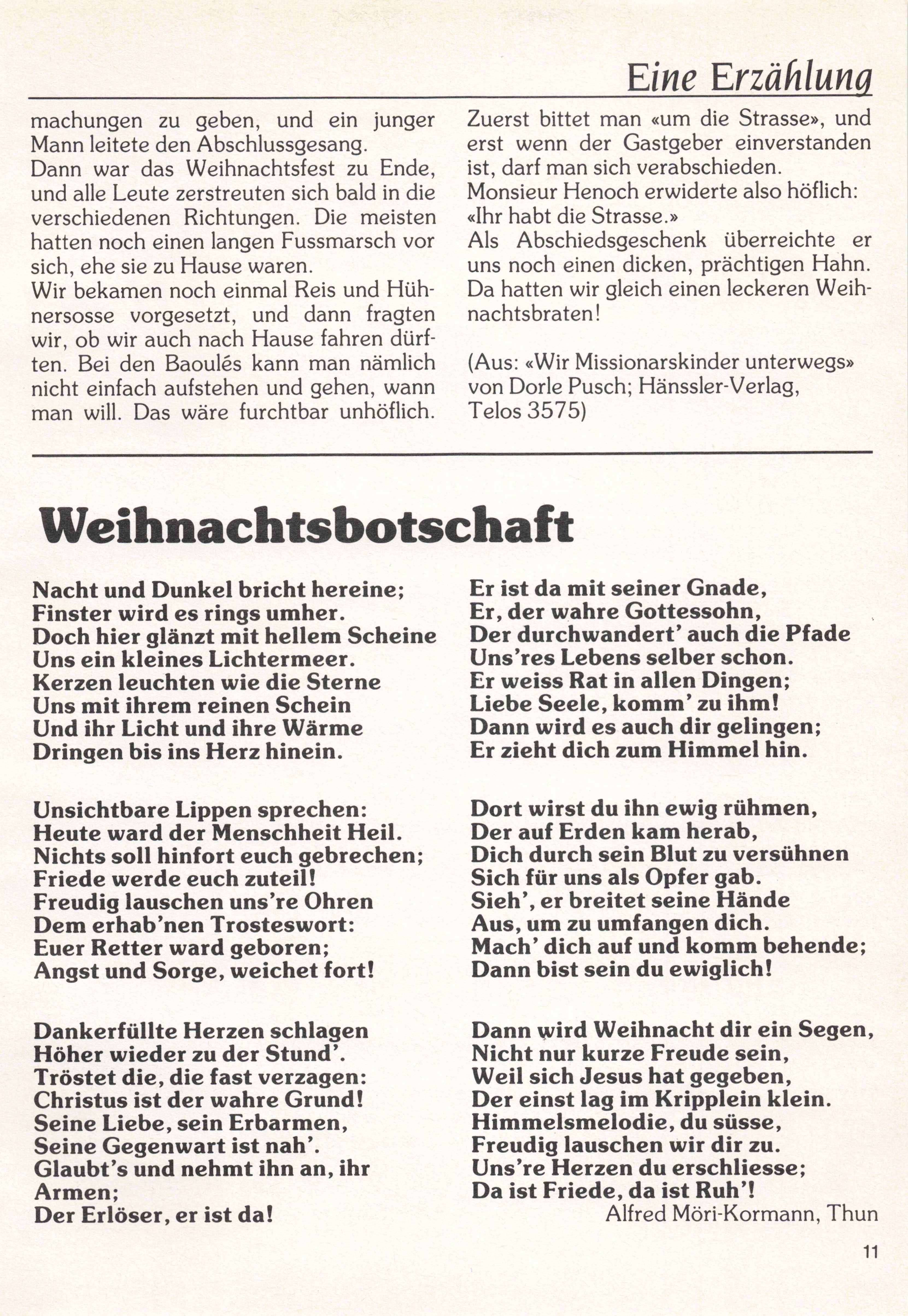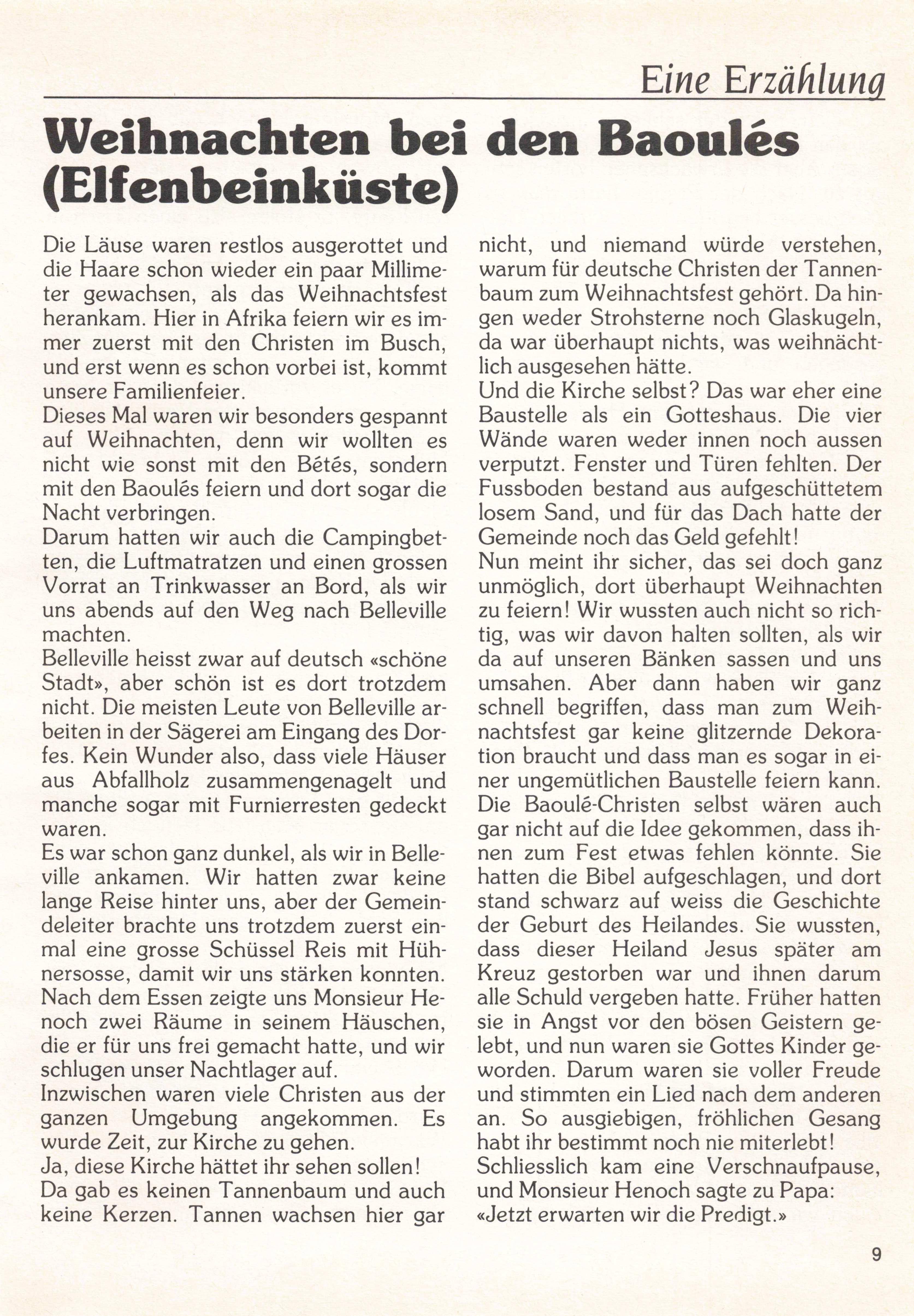 Die Läuse waren restlos ausgerottet und die Haare schon wieder ein paar Millime ter gewachsen, als das Weihnachtsfest herankam. Hier in Afrika feiern wir es im mer zuerst mit den Christen im Busch, und erst wenn es schon vorbei ist, kommt unsere Familienfeier.