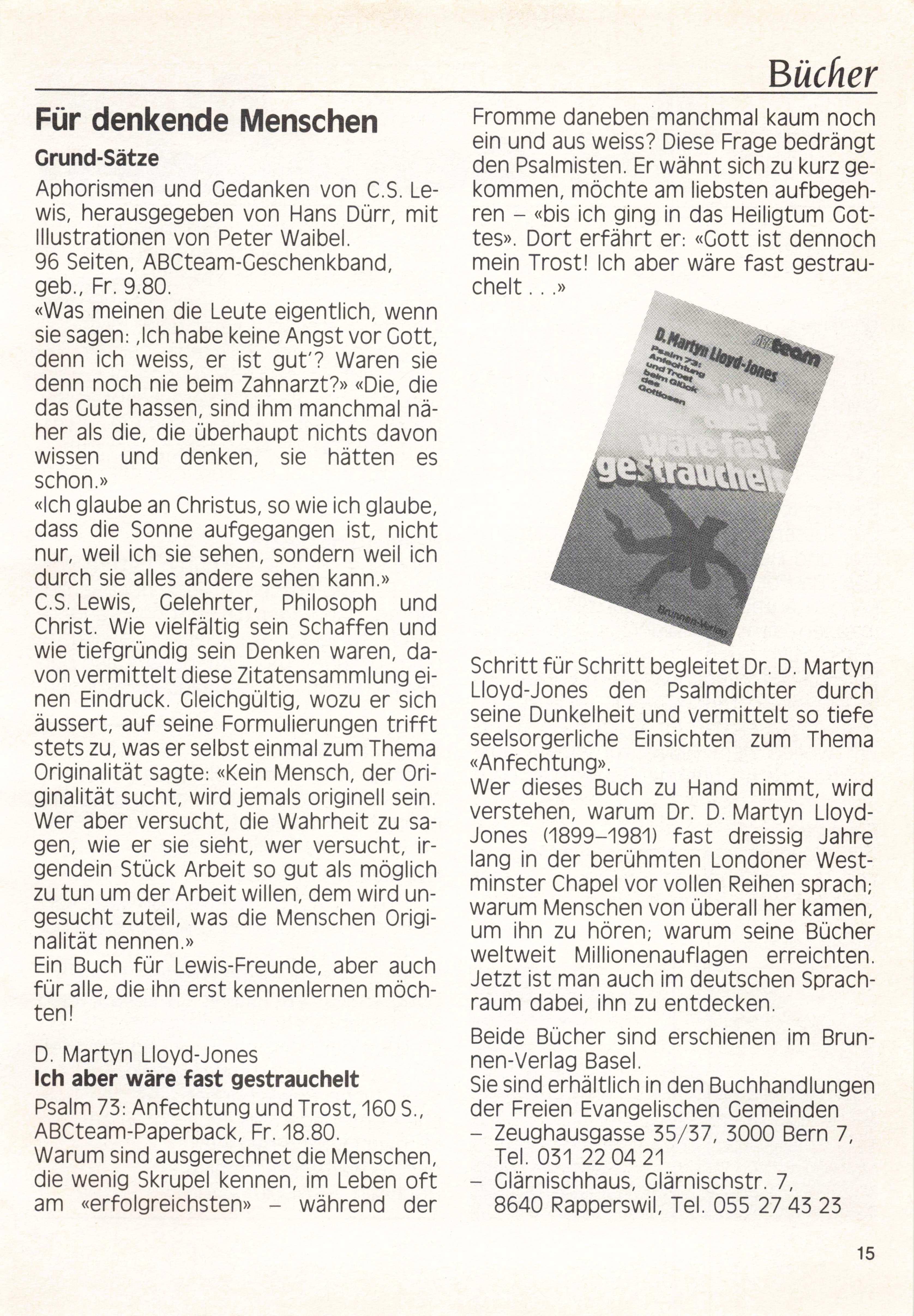 Administration und Versand: Buchhand lung der Freien Evangelischen Gemeinden, Zeughausgasse 35/37, 3000 Bern 7, Telefon 031 22 04 21. Abonnement jährlich Fr. 16.(für Einzelbezüger zusätzlich Fr. 2.50 für Versand); Postcheck 30-1560Jakob AG, 3506 Grosshöchstetten.