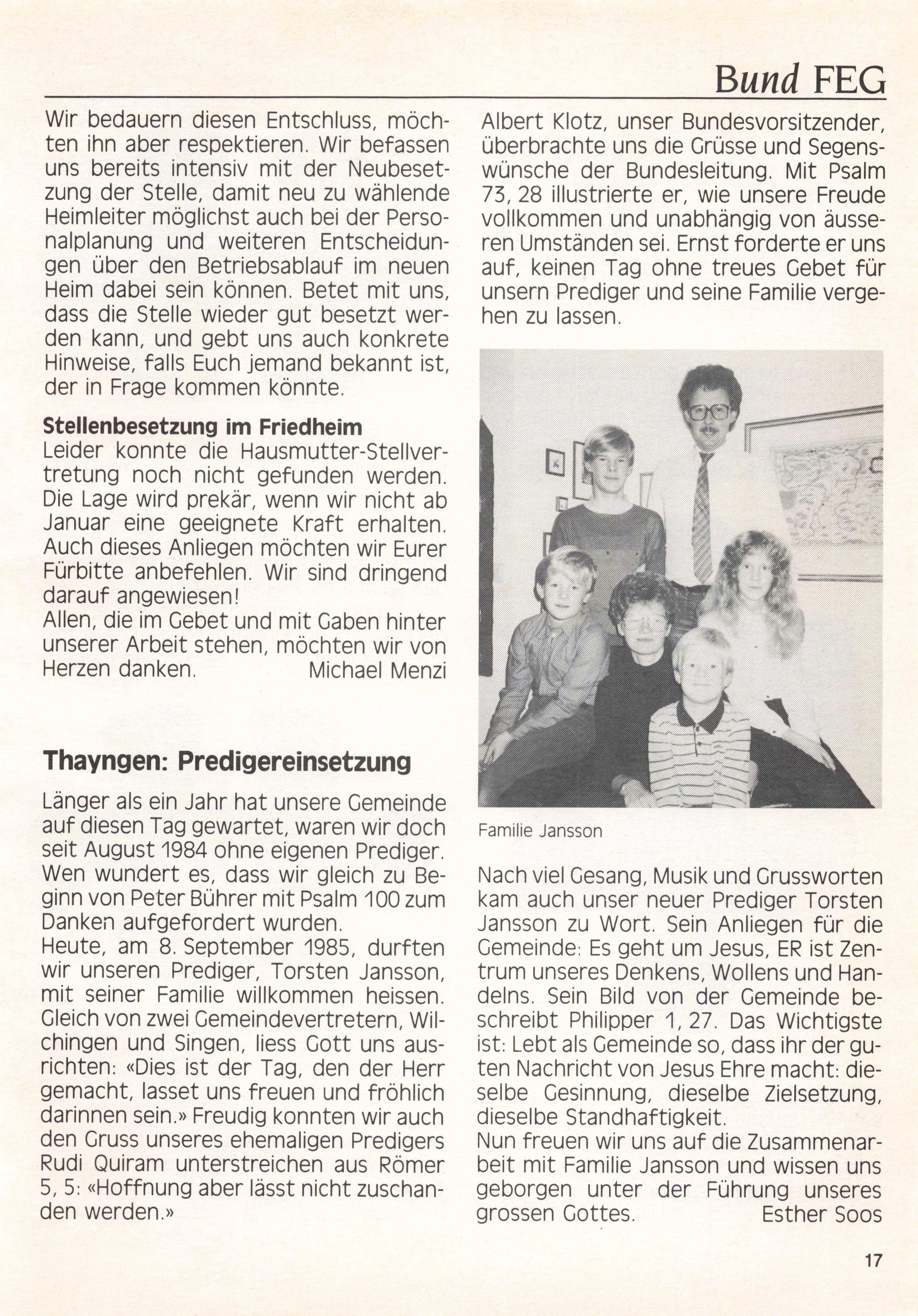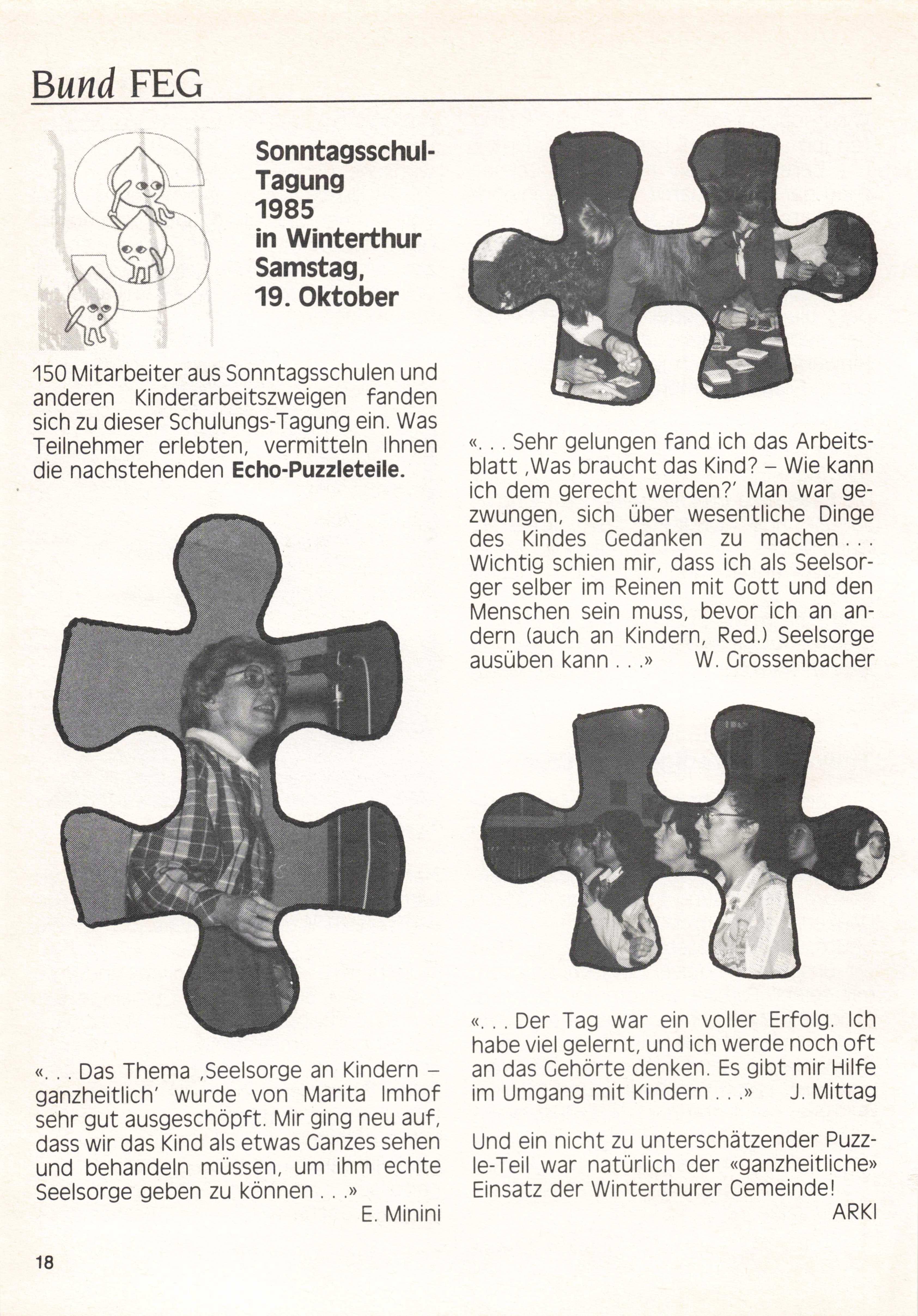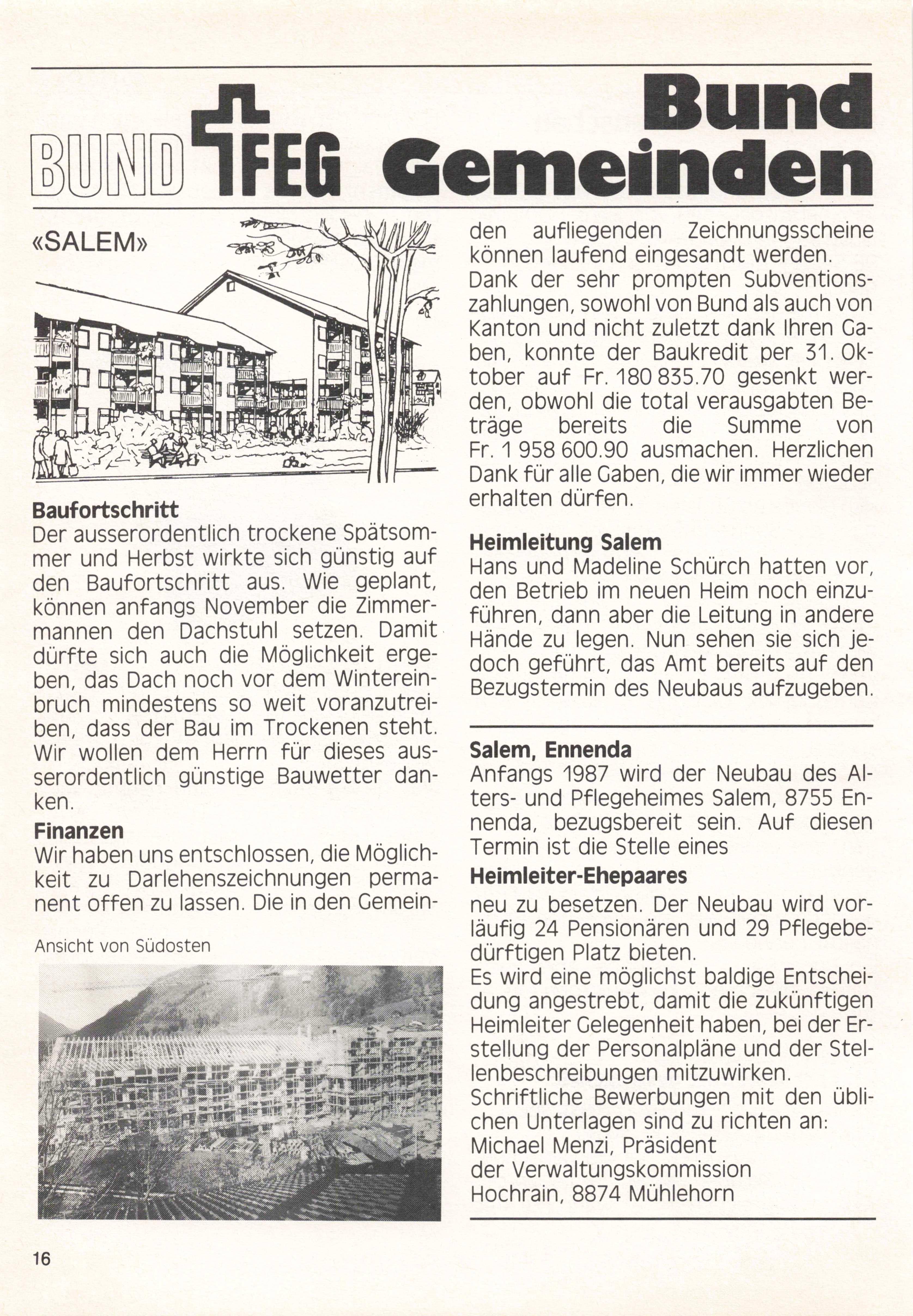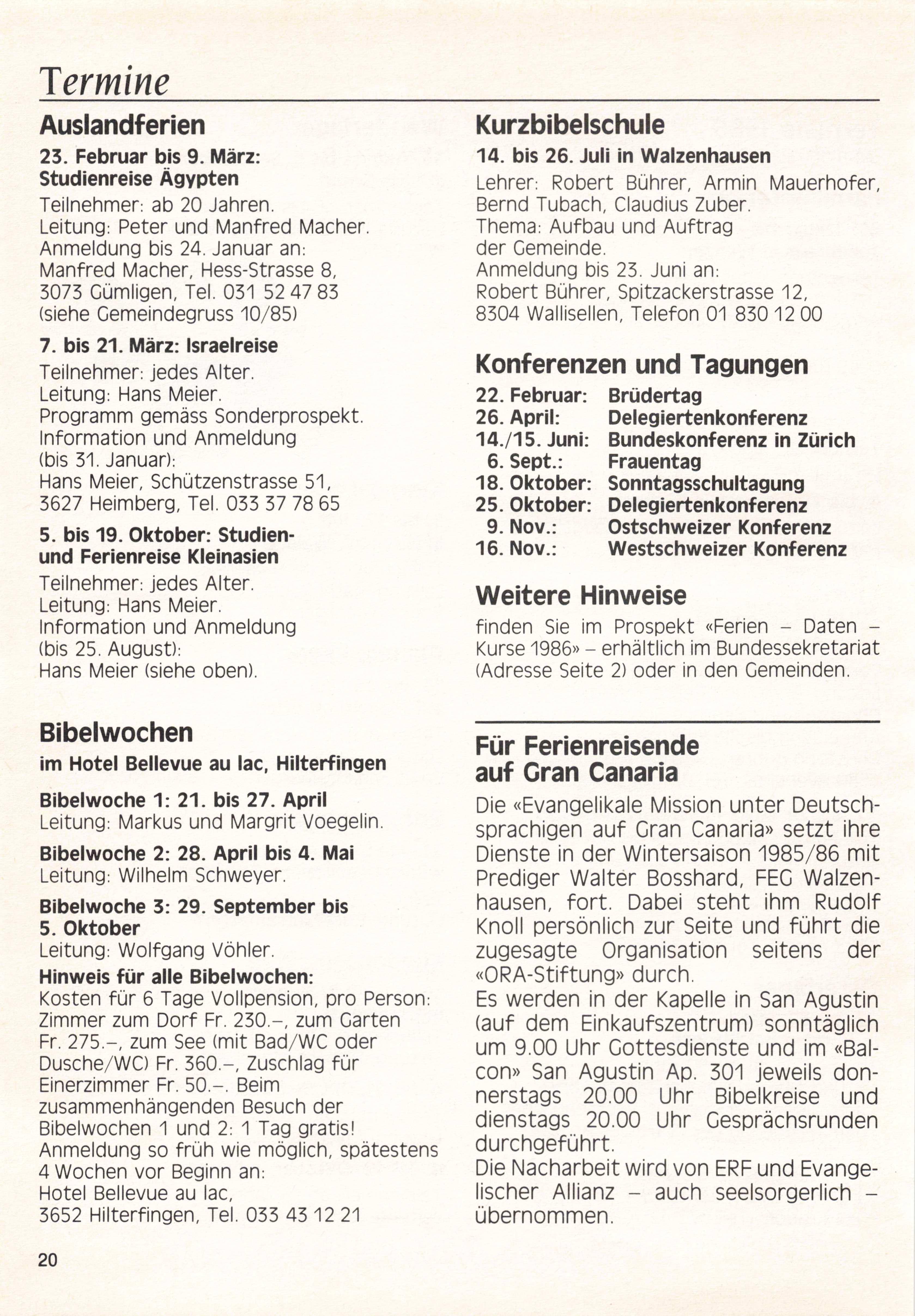 Die «Evangelikale Mission unter Deutsch sprachigen auf Gran Canaria» setzt ihre Dienste in der Wintersaison 1985/86 mit Prediger Walter Bosshard, FEG Walzen hausen, fort. Dabei steht ihm Rudolf Knoll persönlich zur Seite und führt die zugesagte Organisation seitens der «ORA-Stiftung» durch.