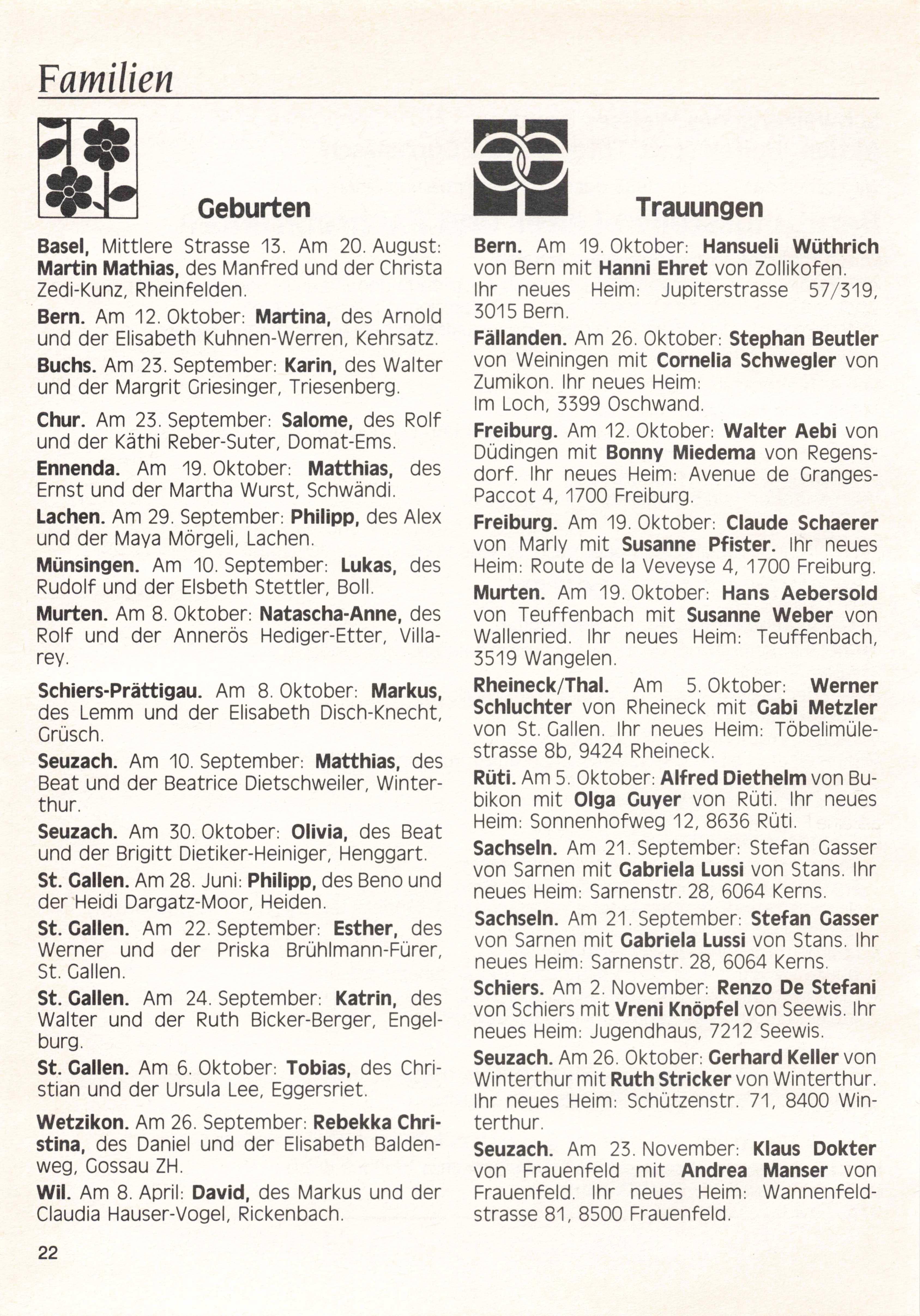 Chur. Am 23. September: Salome, des Rolf und der Käthi Reber-Suter, Domat-Ems. Ennenda. Am 19. Oktober: Matthias, des Ernst und der Martha Wurst, Schwand!. Lachen. Am 29. September: Philipp, des Alex und der Maya Mörgeli, Lachen. Münsingen. Am 10. September: Lukas, des Rudolf und der Elsbeth Stettier, Boll. Murten. Am 8. Oktober: Natascha-Anne, des Rolf und der Annerös Hediger-Etter, Villarey.