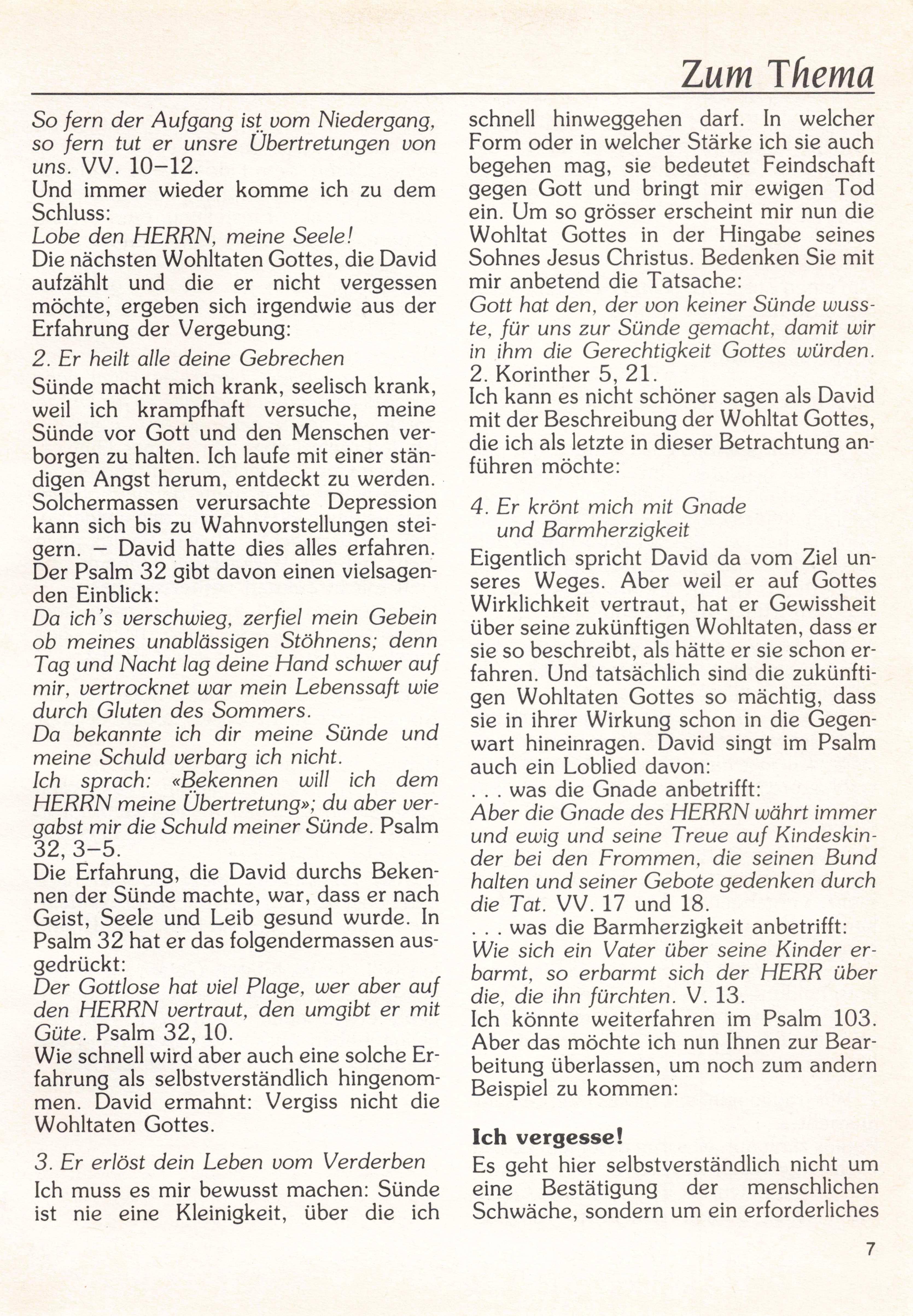 Diese Wohltat Gottes erkenne ich als den Schlüssel für alle änderen. - Zunächst er kenne ich, dass Gott in der Sendung sei nes Sohnes Jesus Christus auf die Erde die Trennung überwand, die durch den Sündenfall der ersten Menschen zwischen uns allen und Gott besteht. Dann aber ist mir bewusst geworden, dass ich Sünde nicht einfach nur als Zustand der Tren nung verstehen kann, sondern dass ich als Sünder in einem lebens- und verhaltensmässigen Gegensatz zu Gott handle, wo durch ich immer mehr Schuld auf mich lade. - Als ich Gott erklärte, dass mein Zustand und meine Aktivitäten der Sünde mir leid tun und dass ich sie bereue, sagte er mir seine Vergebung zu und erfüllte mein Gewissen mit Erieden und Gewiss heit der Vergebung. Wie David kann ich Gott darob anbeten und dankbar bezeu gen: