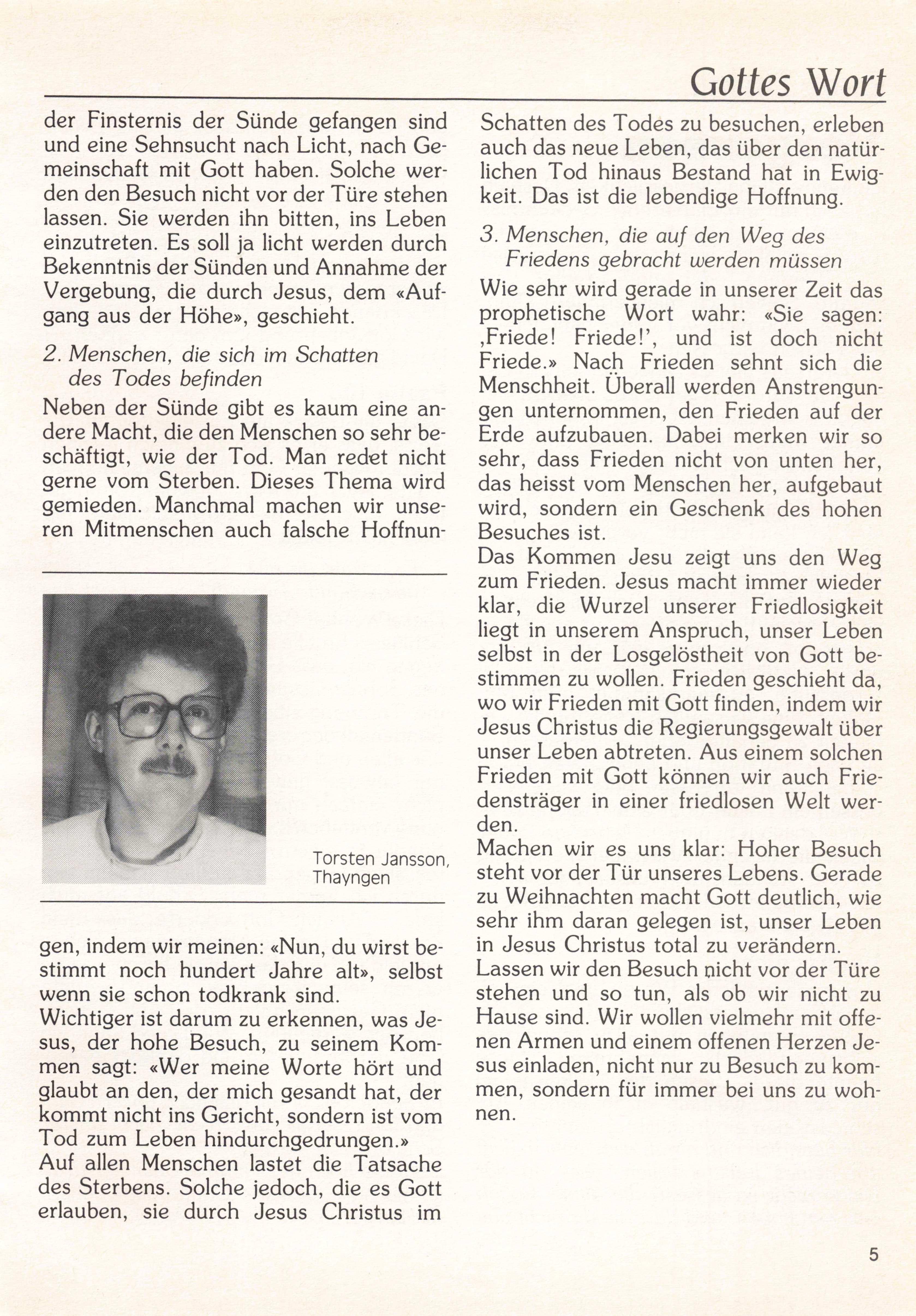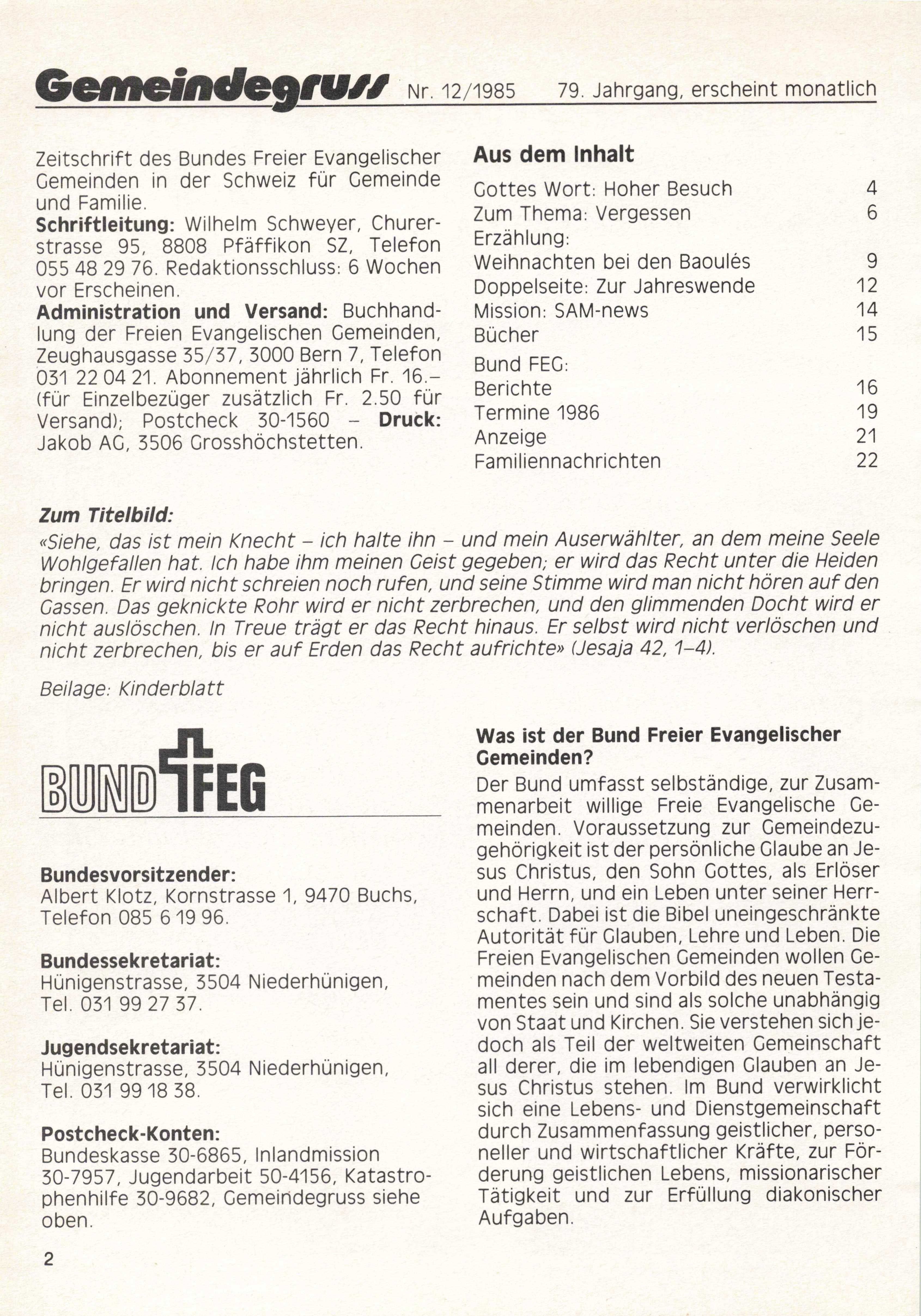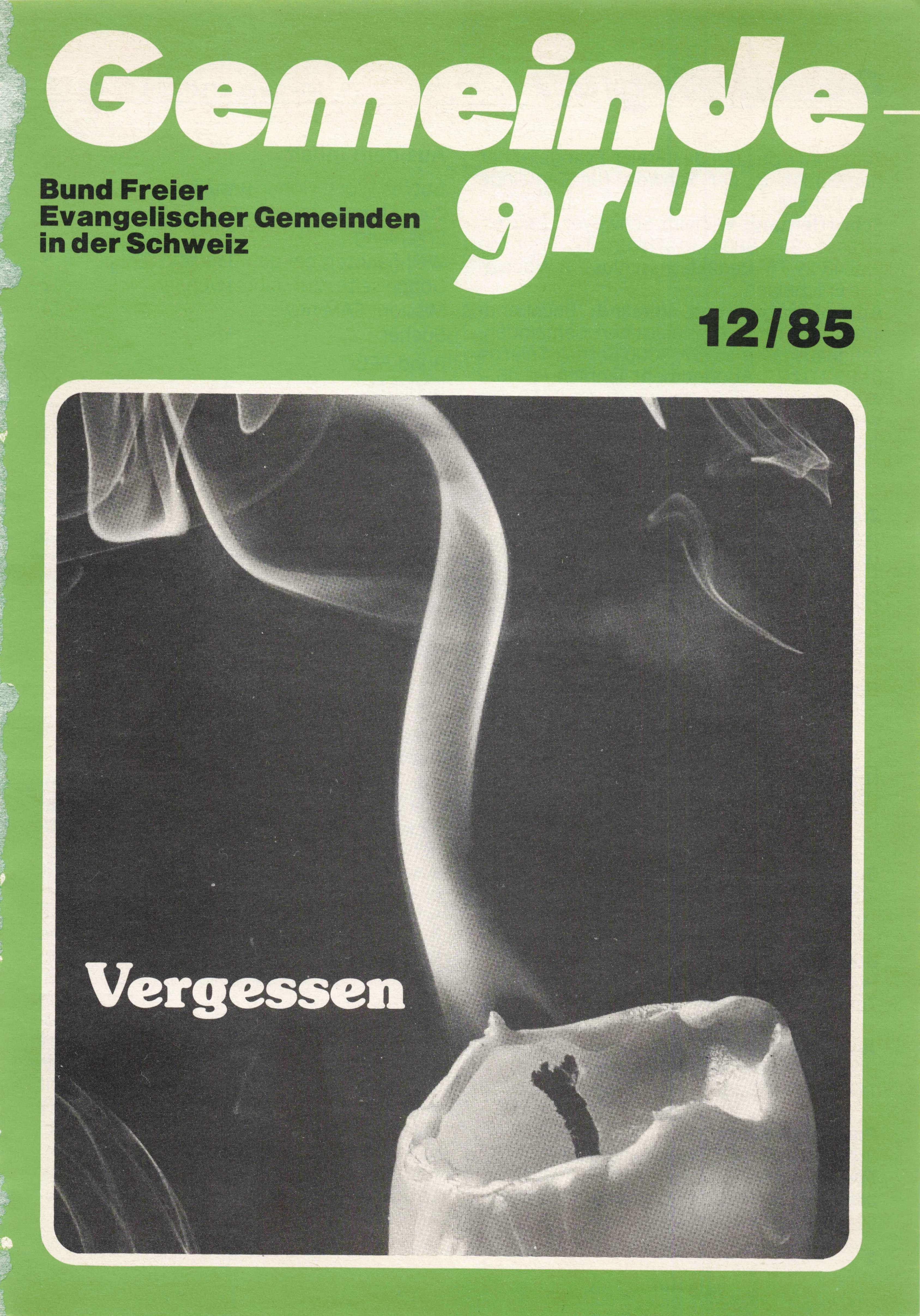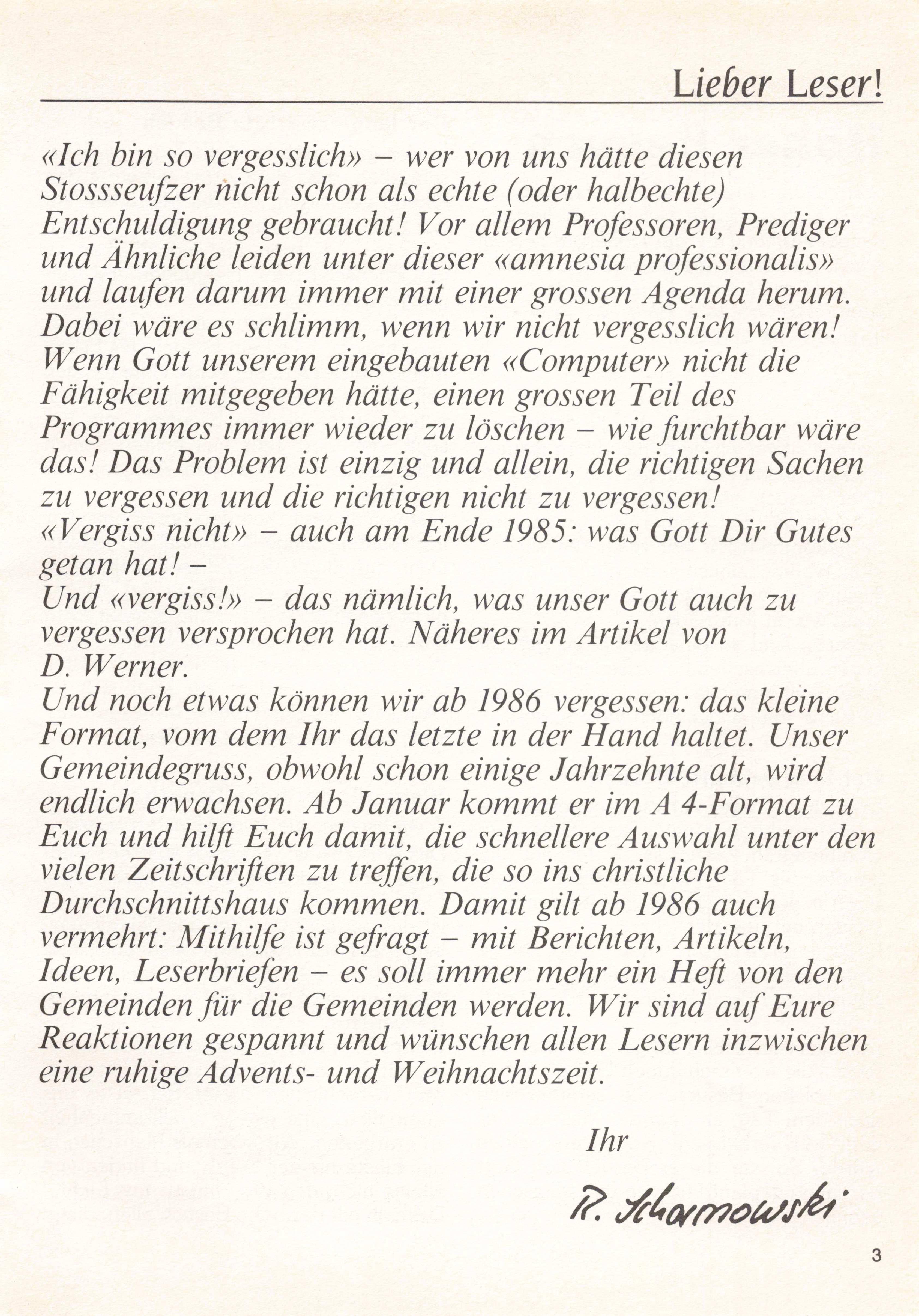 Und noch etwas können wir ab 1986 vergessen: das kleine Format, vom dem Ihr das letzte in der Hand haltet. Unser Gemeindegruss, obwohl schon einige Jahrzehnte alt, wird endlich erwachsen. Ab Januar kommt er im A 4-Format zu Euch und hilft Euch damit, die schnellere Auswahl unter den vielen Zeitschriften zu treffen, die so ins christliche Durchschnittshaus kommen. Damit gilt ab 1986 auch vermehrt: Mithilfe ist gefragt - mit Berichten, Artikeln, Ideen, Leserbriefen - es soll immer mehr ein Heft von den Gemeinden für die Gemeinden werden. Wir sind auf Eure Reaktionen gespannt und wünschen allen Lesern inzwischen eine ruhige Advents- und Weihnachtszeit. Ihr