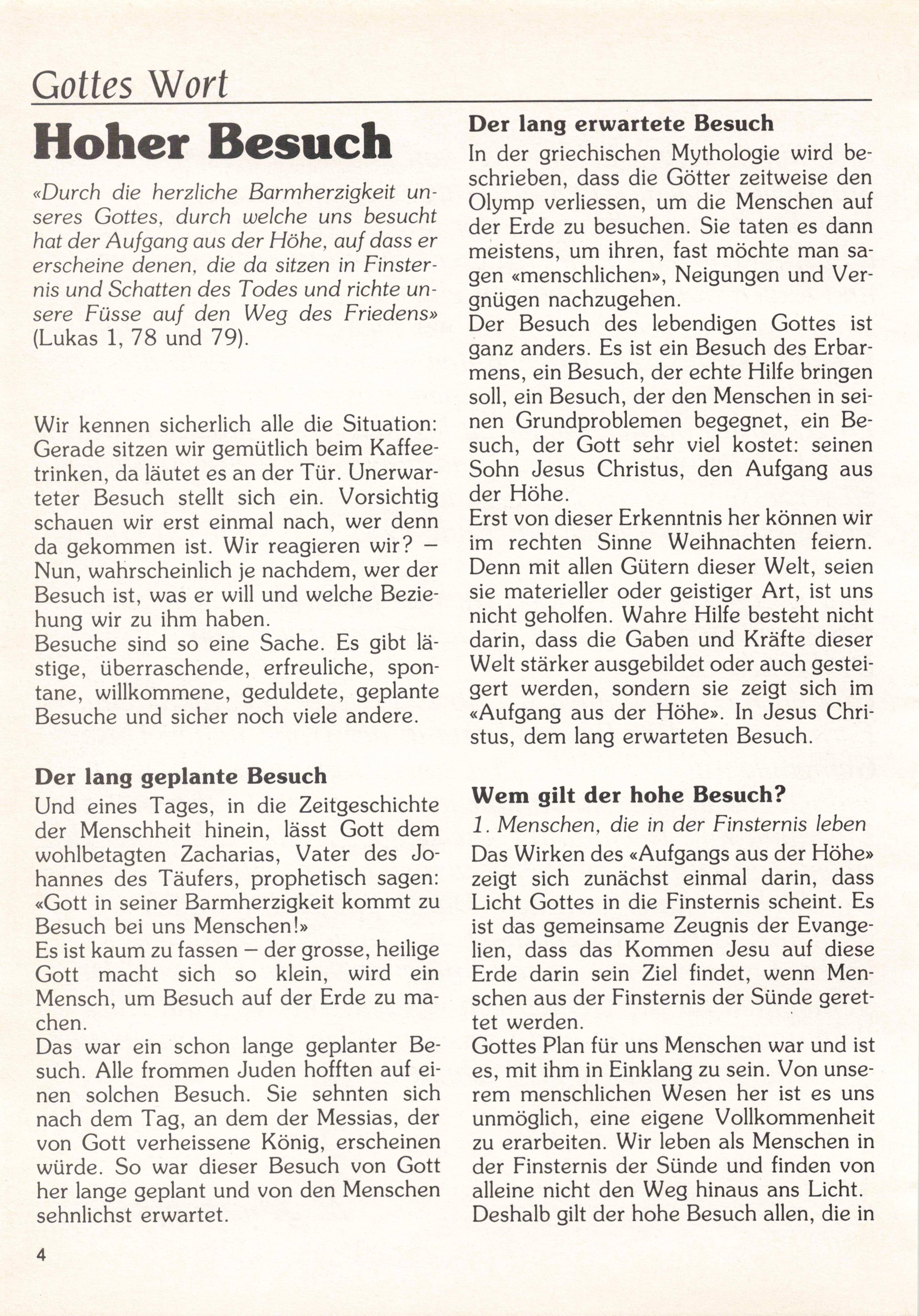 Der Besuch des lebendigen Gottes ist ganz anders. Es ist ein Besuch des Erbar mens, ein Besuch, der echte Hilfe bringen soll, ein Besuch, der den Menschen in sei nen Grundproblemen begegnet, ein Be such, der Gott sehr viel kostet: seinen Sohn Jesus Christus, den Aufgang aus der Höhe.