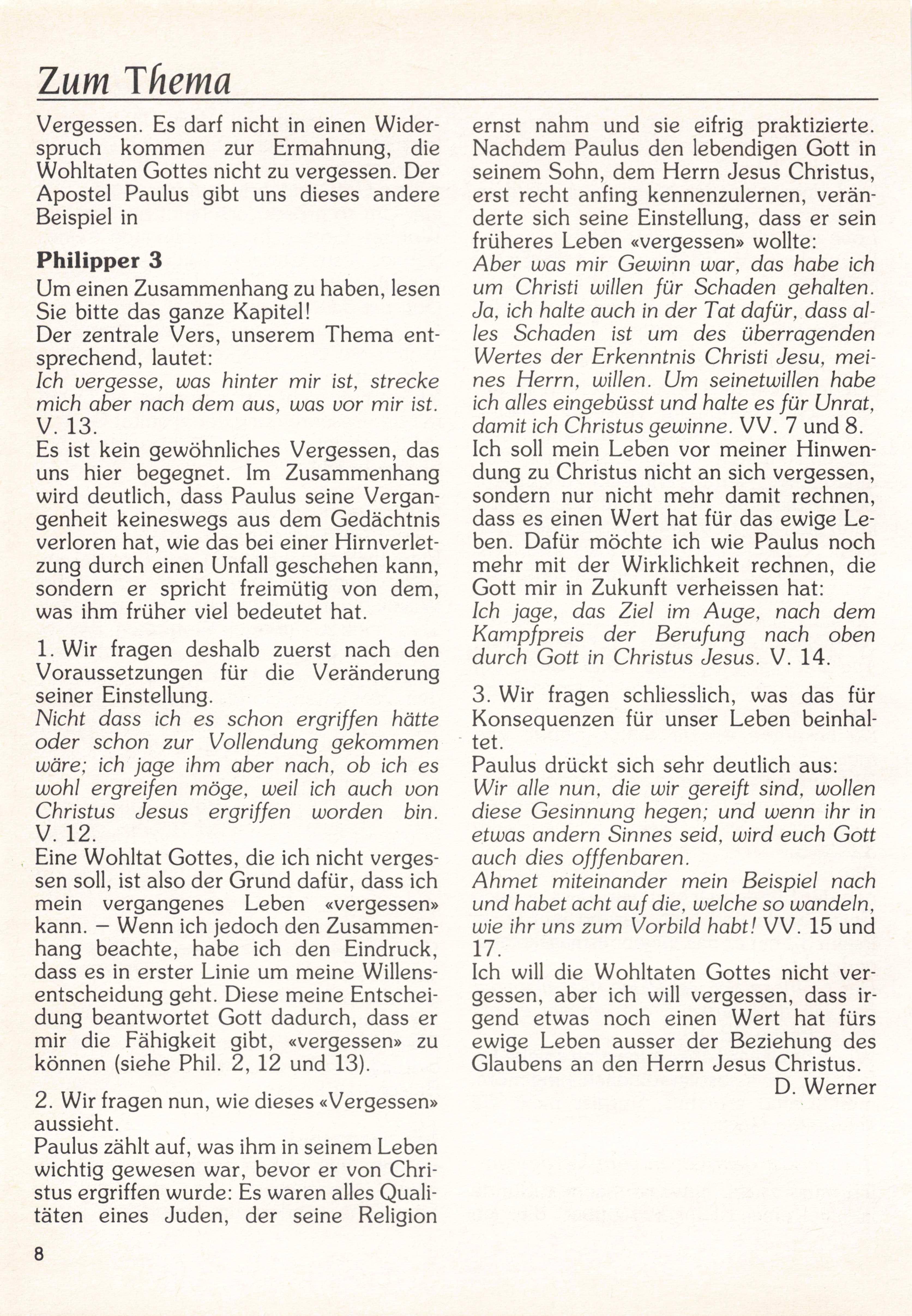 Eine Wohltat Gottes, die ich nicht verges sen soll, ist also der Grund dafür, dass ich mein vergangenes Leben «vergessen» kann. — Wenn ich jedoch den Zusammen hang beachte, habe ich den Eindruck, dass es in erster Linie um meine Willens entscheidung geht. Diese meine Entschei dung beantwortet Gott dadurch, dass er mir die Fähigkeit gibt, «vergessen» zu können (siehe Phil. 2, 12 und 13).