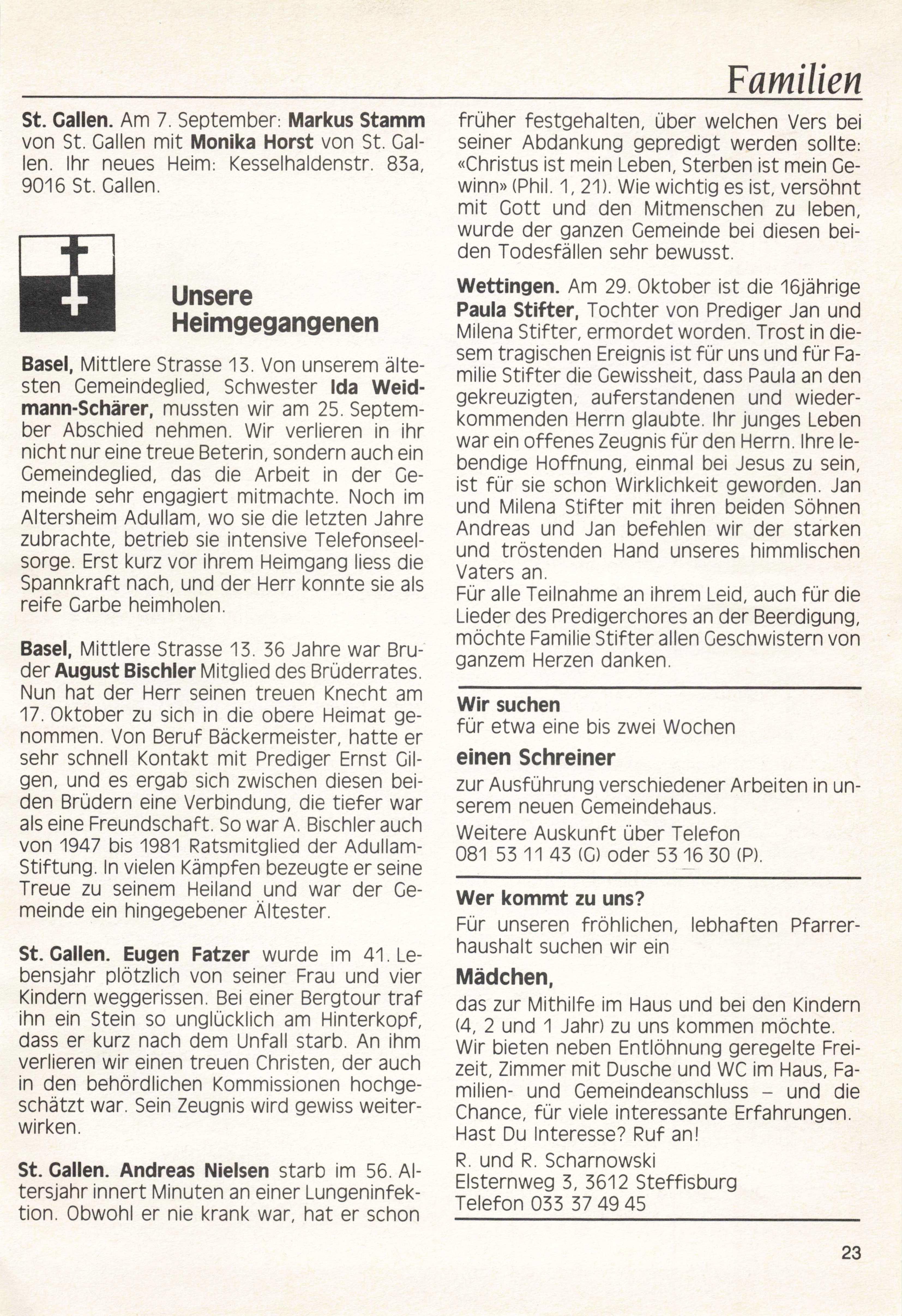 Basel, Mittlere Strasse 13. 36 Jahre war Bru der August Bischler Mitglied des Brüderrates. Nun hat der Herr seinen treuen Knecht am 17. Oktober zu sich in die obere Heimat ge nommen. Von Beruf Bäckermeister, hatte er sehr schnell Kontakt mit Prediger Ernst Gil gen, und es ergab sich zwischen diesen bei den Brüdern eine Verbindung, die tiefer war als eine Freundschaft. So war A. Bischler auch von 1947 bis 1981 Ratsmitglied der AdullamStiftung. In vielen Kämpfen bezeugte er seine Treue zu seinem Heiland und war der Ge meinde ein hingegebener Ältester.