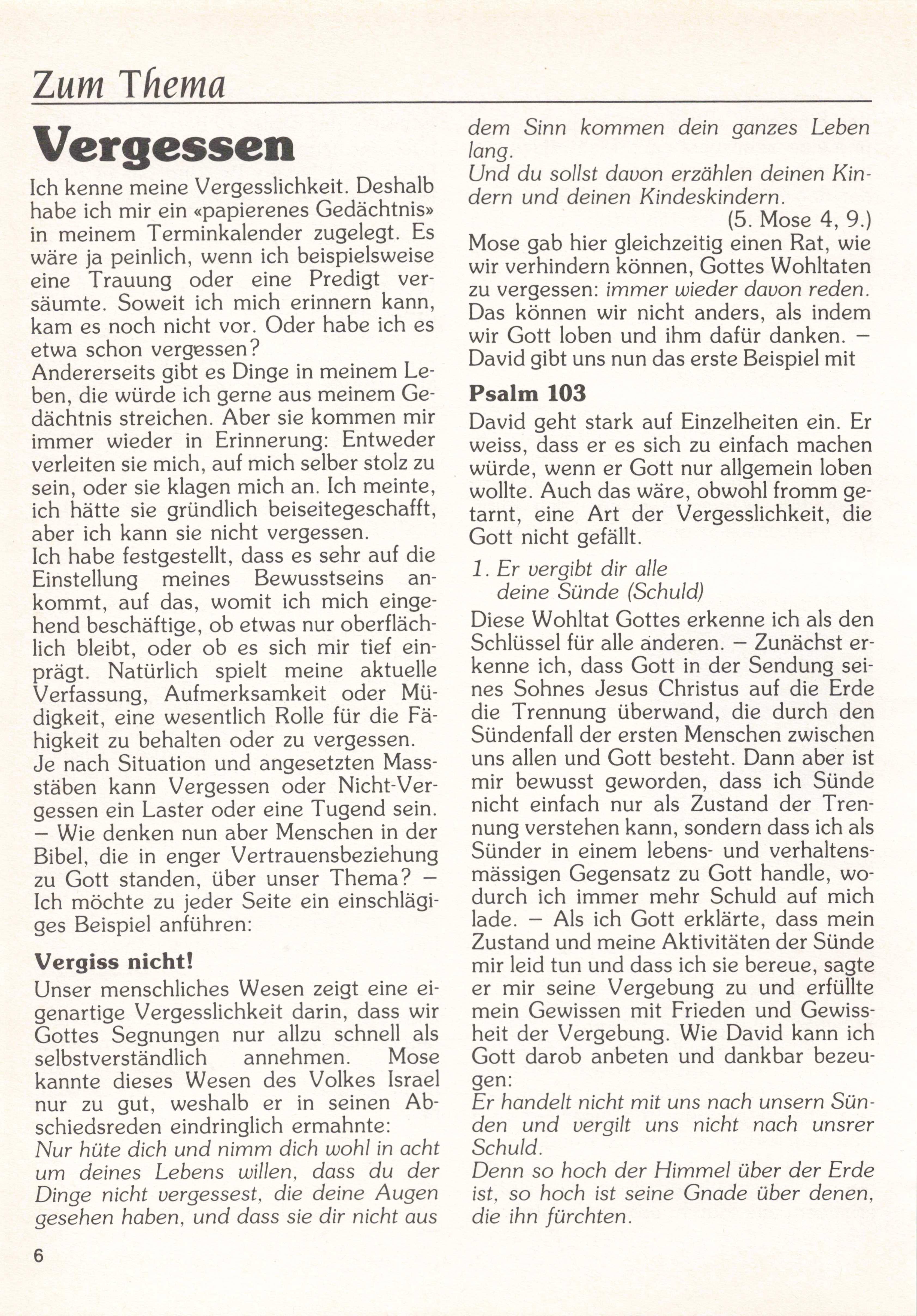 Ich kenne meine Vergesslichkeit. Deshalb habe ich mir ein «papierenes Gedächtnis» in meinem Terminkalender zugelegt. Es wäre ja peinlich, wenn ich beispielsweise eine Trauung oder eine Predigt ver säumte. Soweit ich mich erinnern kann, kam es noch nicht vor. Oder habe ich es etwa schon vergessen? Andererseits gibt es Dinge in meinem Le ben, die würde ich gerne aus meinem Ge dächtnis streichen. Aber sie kommen mir immer wieder in Erinnerung; Entweder verleiten sie mich, auf mich selber stolz zu sein, oder sie klagen mich an. Ich meinte, ich hätte sie gründlich beiseitegeschafft, aber ich kann sie nicht vergessen. Ich habe festgestellt, dass es sehr auf die Einstellung meines Bewusstseins an kommt, auf das, womit ich mich einge hend beschäftige, ob etwas nur oberfläch lich bleibt, oder ob es sich mir tief ein prägt. Natürlich spielt meine aktuelle Verfassung, Aufmerksamkeit oder Mü digkeit, eine wesentlich Rolle für die Eähigkeit zu behalten oder zu vergessen. Je nach Situation und angesetzten Massstäben kann Vergessen oder Nicht-Vergessen ein Laster oder eine Tugend sein. - Wie denken nun aber Menschen in der Bibel, die in enger Vertrauensbeziehung zu Gott standen, über unser Thema?Ich möchte zu jeder Seite ein einschlägi ges Beispiel anführen: