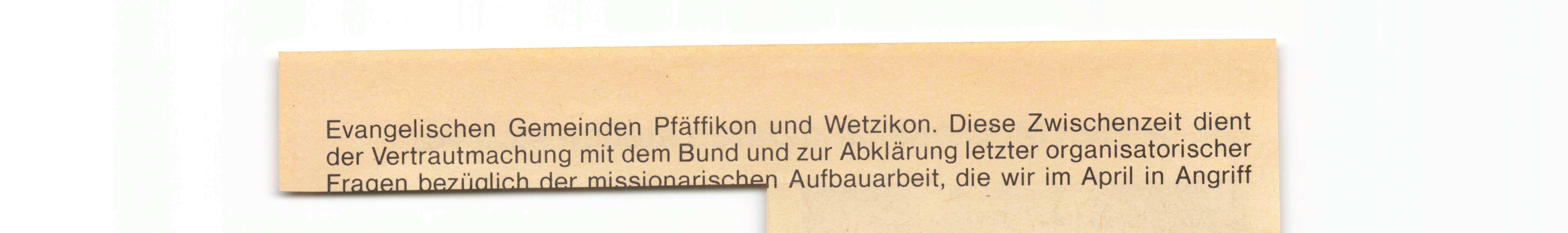 Wetzikon. Am 25. November: Micha Samuel, des Christoph und der Karen Häsler, Wetzikon. Wetzikon. Am 5. Dezember: Jaira, des Rudolf und der Liselotte Scheurer, Wetzikon. Wetzikon. Am 27. Dezember: Rahel, des Reinhard und der Annette Hertig, Gibswil. Winterthur. Am 11. Januar: Joel, des Roger und der Christine Tachron, Winterthur. Winterthur. Am 12. Januar: David Felix, des Oskar und der Maria Zollinger, Altikon ZH.