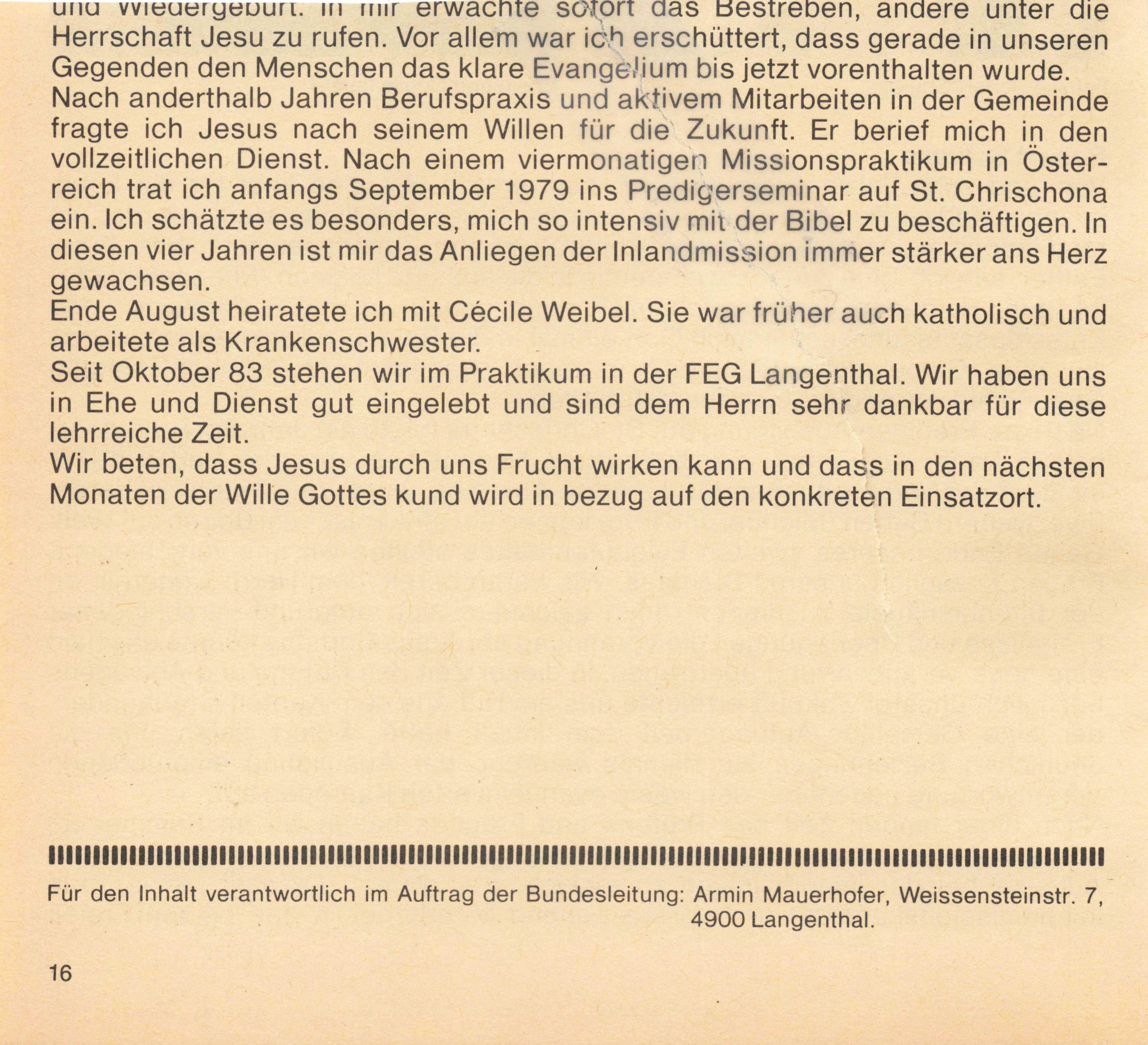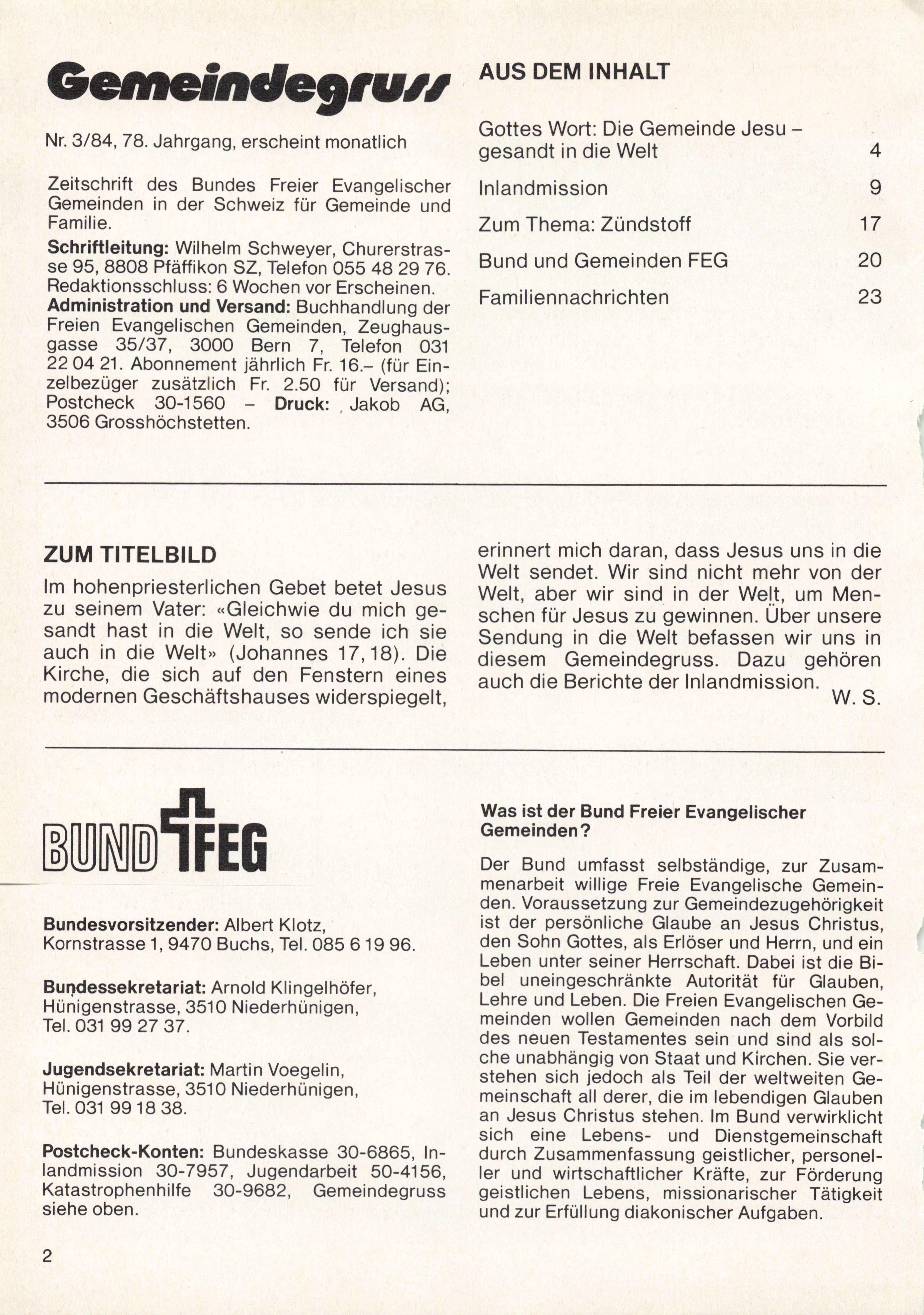 Schriftleitung: Wilhelm Schweyer, Churerstrasse 95, 8808 Pfäffikon SZ, Telefon 055 48 29 76. Redaktionsschluss: 6 Wochen vor Erscheinen. Administration und Versand: Buchhandlung der Freien Evangelischen Gemeinden, Zeughaus gasse 35/37, 3000 Bern 7, Telefon 031 22 04 21. Abonnement jährlich Fr. 16.- (für Ein zelbezüger zusätzlich Fr. 2.50 für Versand); Postcheck 30-15603506 Grosshöchstetten. 9