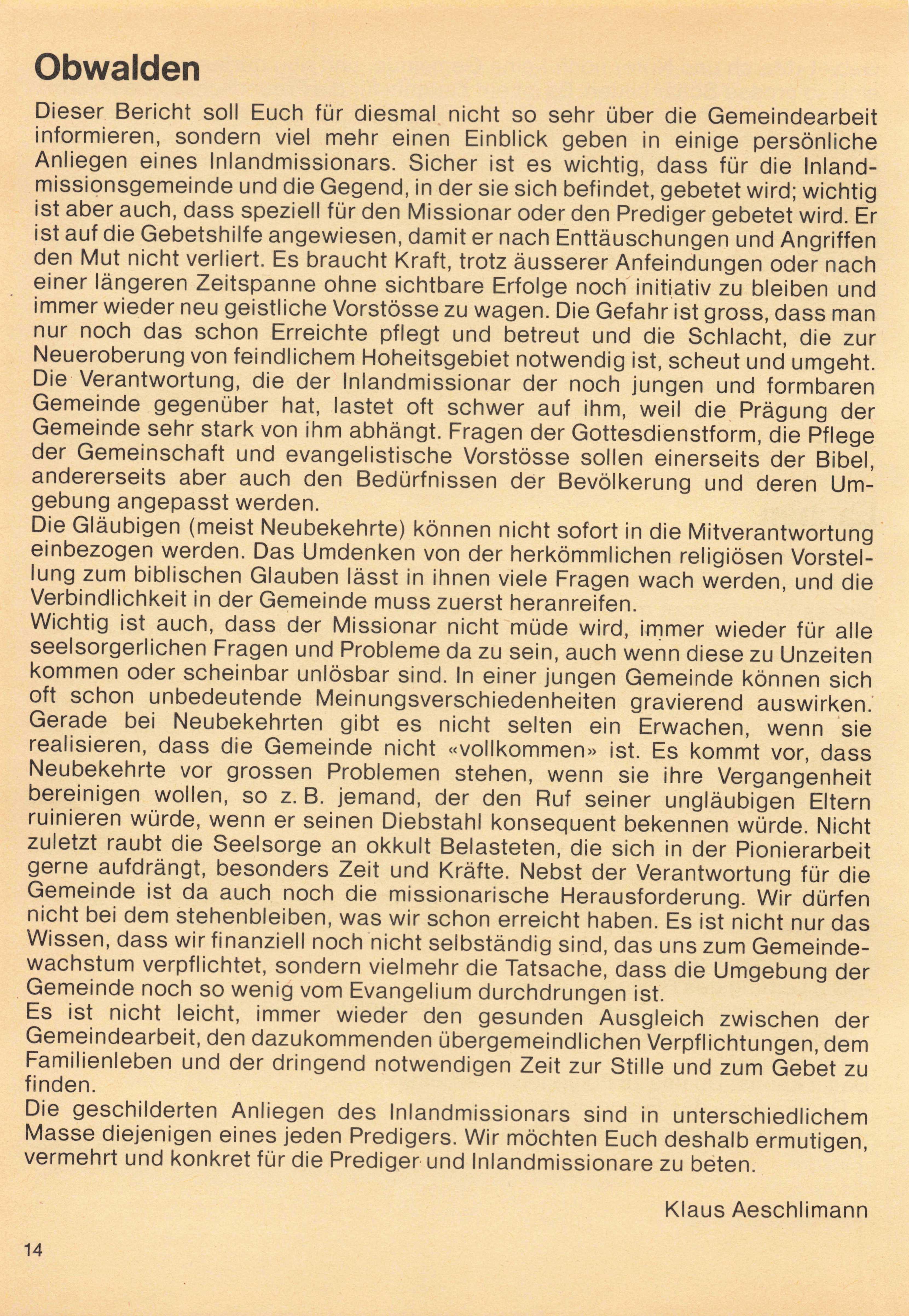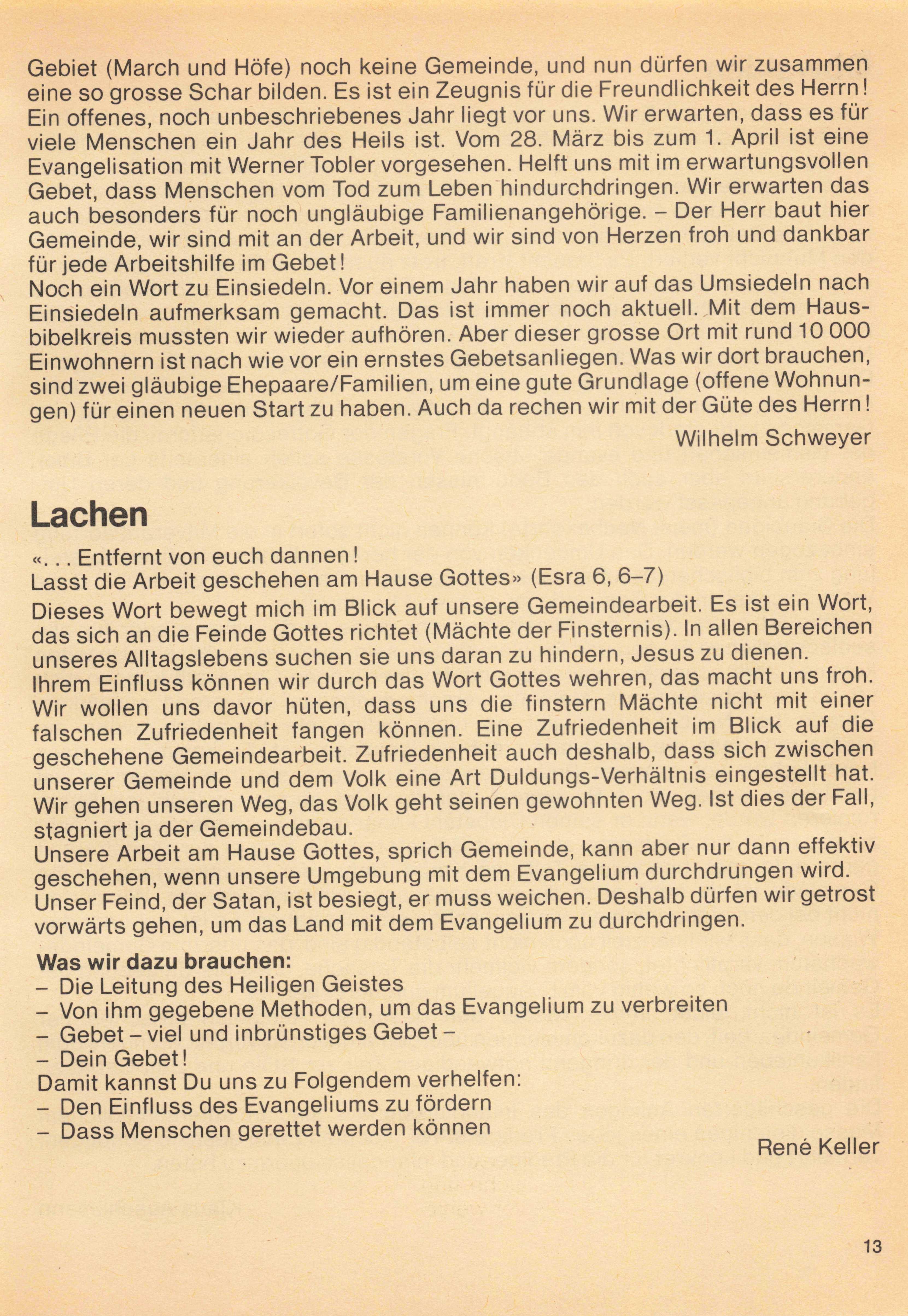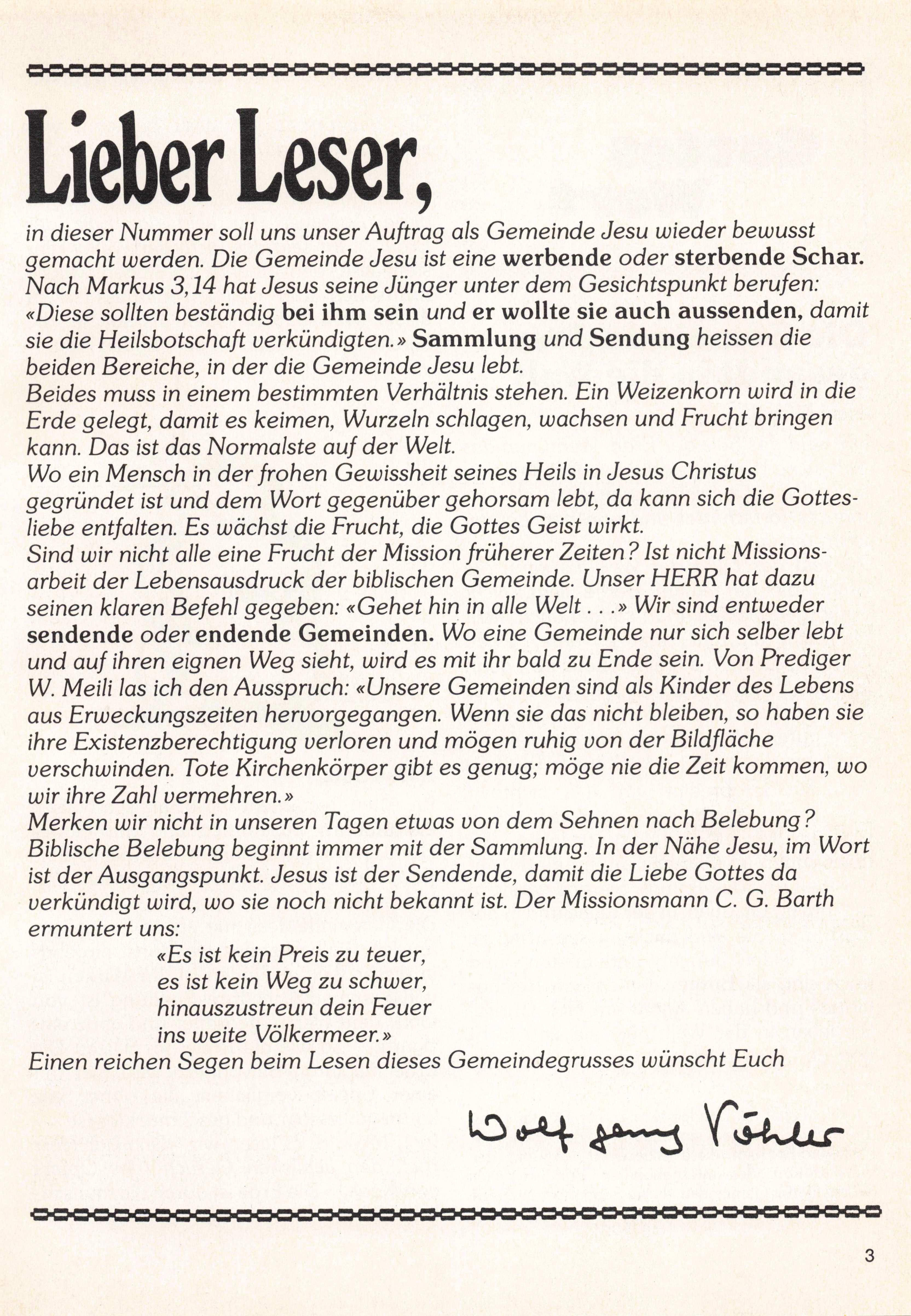 in dieser Nummer soll uns unser Auftrag als Gemeinde Jesu wieder bewusst gemacht werden. Die Gemeinde Jesu ist eine werbende oder sterbende Schar. Nach Markus 3,14 hat Jesus seine Jünger unter dem Gesichtspunkt berufen: «Diese sollten beständig bei ihm sein und er wollte sie auch aussenden, damit sie die Heilsbotschaft verkündigten.» Sammlung und Sendung heissen die beiden Bereiche, in der die Gemeinde Jesu lebt. Beides muss in einem bestimmten Verhältnis stehen. Ein Weizenkorn wird in die Erde gelegt, damit es keimen, Wurzeln schlagen, wachsen und Frucht bringen kann. Das ist das Normalste auf der Welt. Wo ein Mensch in der frohen Gewissheit seines Heils in Jesus Christus gegründet ist und dem Wort gegenüber gehorsam lebt, da kann sich die Gottes liebe entfalten. Es wächst die Frucht, die Gottes Geist wirkt. Sind wir nicht alle eine Frucht der Mission früherer Zeiten ? Ist nicht Missions arbeit der Lebensausdruck der biblischen Gemeinde. Unser HERR hat dazu seinen klaren Befehl gegeben: «Gehet hin in alle Welt...» Wir sind entweder sendende oder endende Gemeinden. Wo eine Gemeinde nur sich selber lebt und auf ihren eignen Weg sieht, wird es mit ihr bald zu Ende sein. Von Prediger W. Meili las ich den Ausspruch: «Unsere Gemeinden sind als Kinder des Lebens aus Erweckungszeiten hervorgegangen. Wenn sie das nicht bleiben, so haben sie ihre Existenzberechtigung verloren und mögen ruhig von der Bildfläche verschwinden. Tote Kirchenkörper gibt es genug; möge nie die Zeit kommen, wo wir ihre Zahl vermehren.»