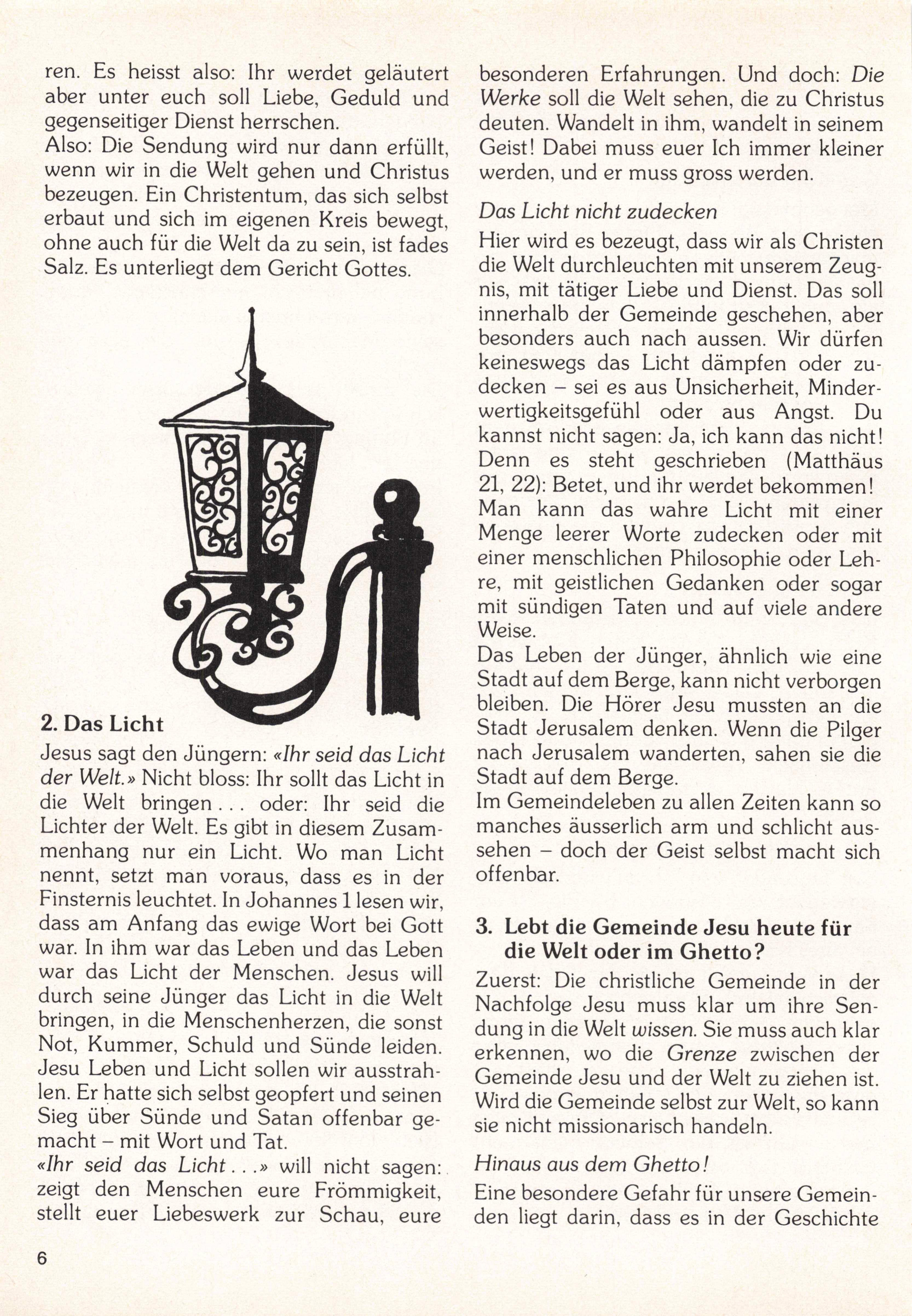 Jesus sagt den Jüngern: «Ihr seid das Licht der Welt.» Nicht bloss: Ihr sollt das Licht in die Welt bringen.. oder: Ihr seid die Lichter der Welt. Es gibt in diesem Zusam menhang nur ein Licht. Wo man Licht nennt, setzt man voraus, dass es in der Finsternis leuchtet. In Johannes 1 lesen wir, dass am Anfang das ewige Wort bei Gott war. In ihm war das Leben und das Leben war das Licht der Menschen. Jesus will durch seine Jünger das Licht in die Welt bringen, in die Menschenherzen, die sonst Not, Kummer, Schuld und Sünde leiden. Jesu Leben und Licht sollen wir ausstrah len. Er hatte sich selbst geopfert und seinen Sieg über Sünde und Satan offenbar ge macht - mit Wort und Tat.