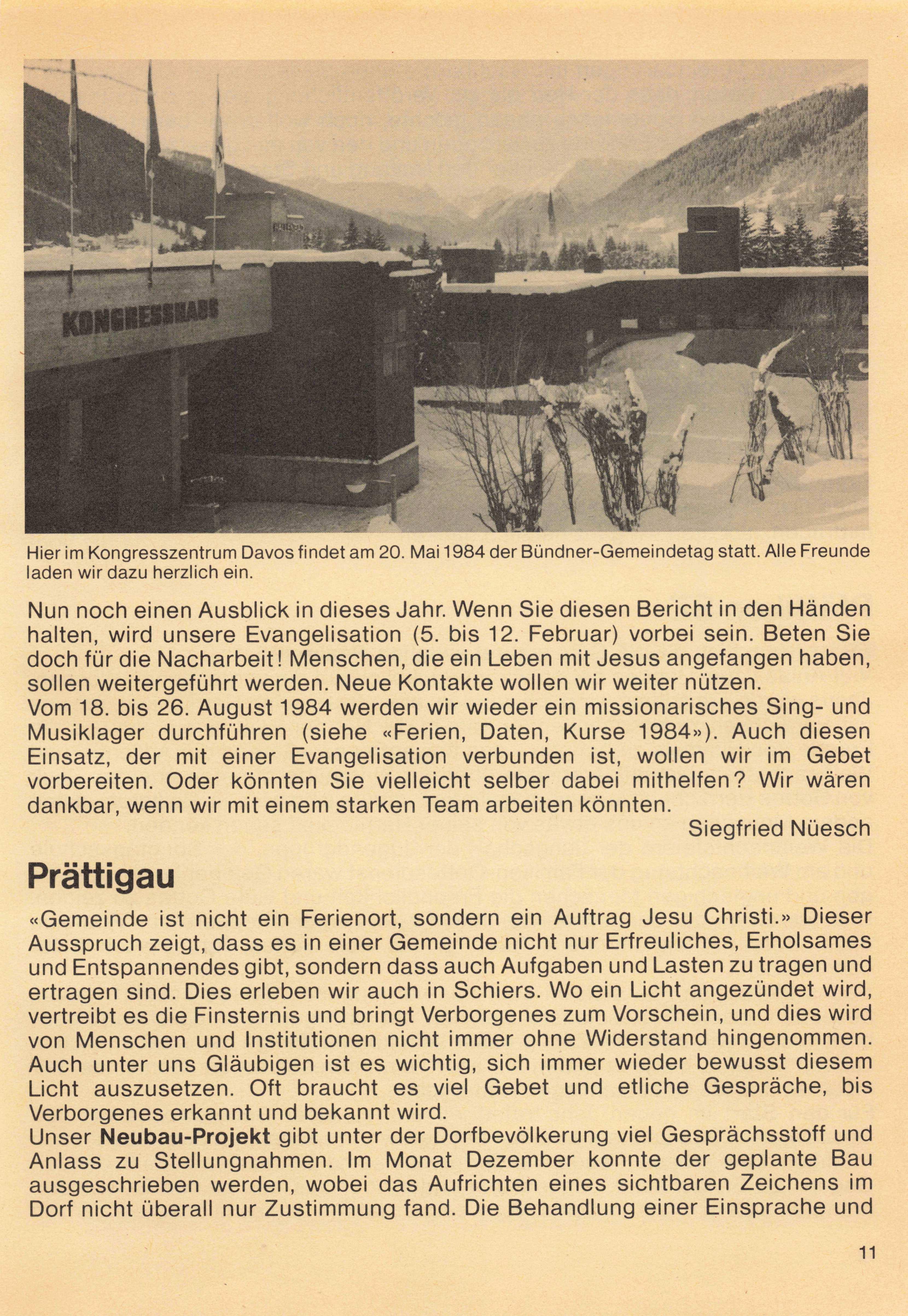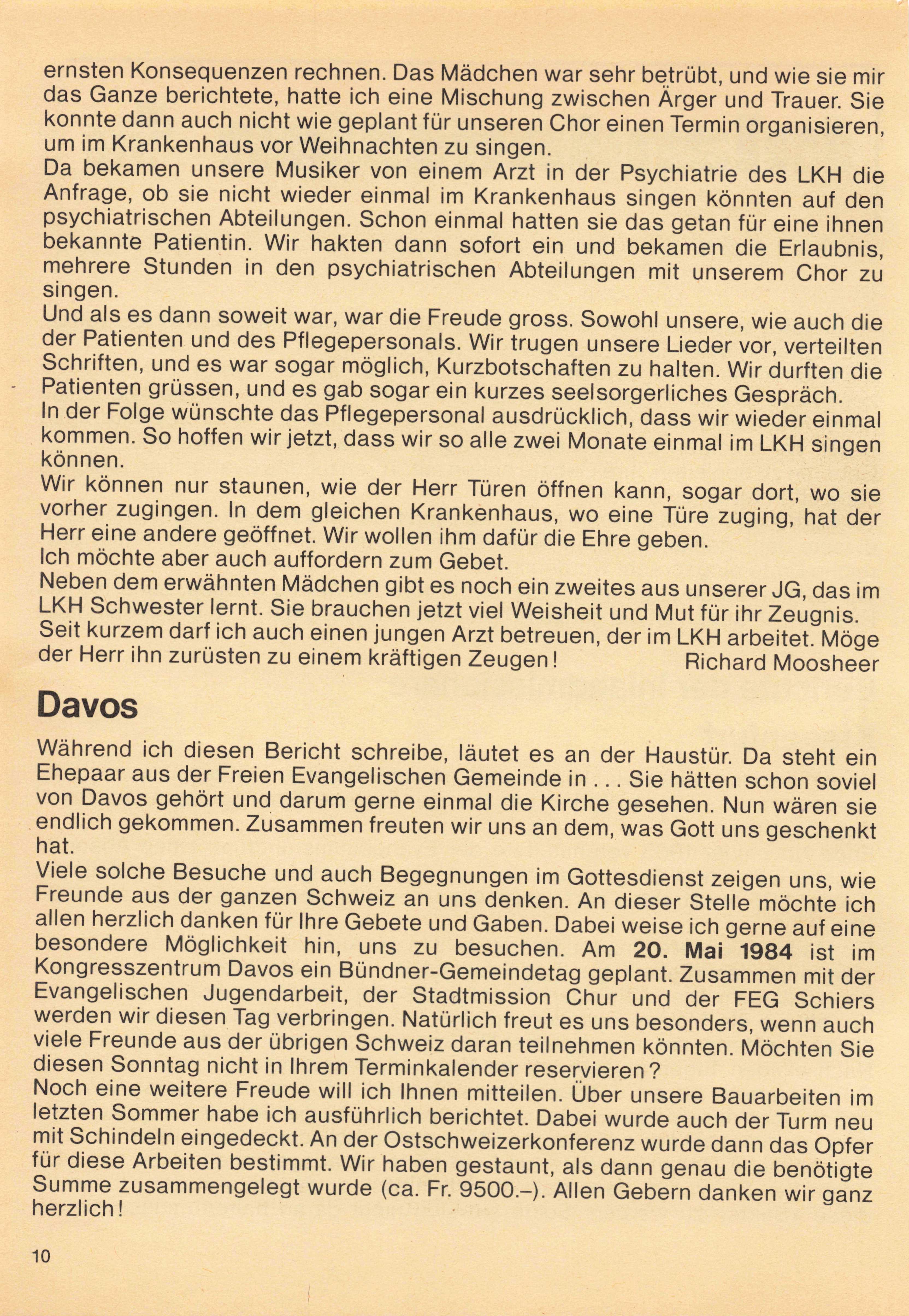 Viele solche Besuche und auch Begegnungen im Gottesdienst zeigen uns, wie Freunde aus der ganzen Schweiz an uns denken. An dieser Stelle möchte ich allen herzlich danken für Ihre Gebete und Gaben. Dabei weise ich gerne auf eine besondere Möglichkeit hin, uns zu besuchen. Am 20. Mai 1984 ist im Kongresszentrum Davos ein Bündner-Gemeindetag geplant. Zusammen mit der Evangelischen Jugendarbeit, der Stadtmission Chur und der FEG Schiers werden wir diesen Tag verbringen. Natürlich freut es uns besonders wenn auch viele Freunde aus der übrigen Schweiz daran teilnehmen könnten. Möchten Sie diesen Sonntag nicht in Ihrem Terminkalender reservieren? Noch eine weitere Freude will ich Ihnen mitteilen. Über unsere Bauarbeiten im letzten Sommer habe ich ausführlich berichtet. Dabei wurde auch der Turm neu mit Schindeln eingedeckt. An der Ostschweizerkonferenz wurde dann das Opfer für diese Arbeiten bestimmt. Wir haben gestaunt, als dann genau die benötigte Summe zusammengelegt wurde (ca. Fr. 9500.-). Allen Gebern danken wir ganz herzlich!