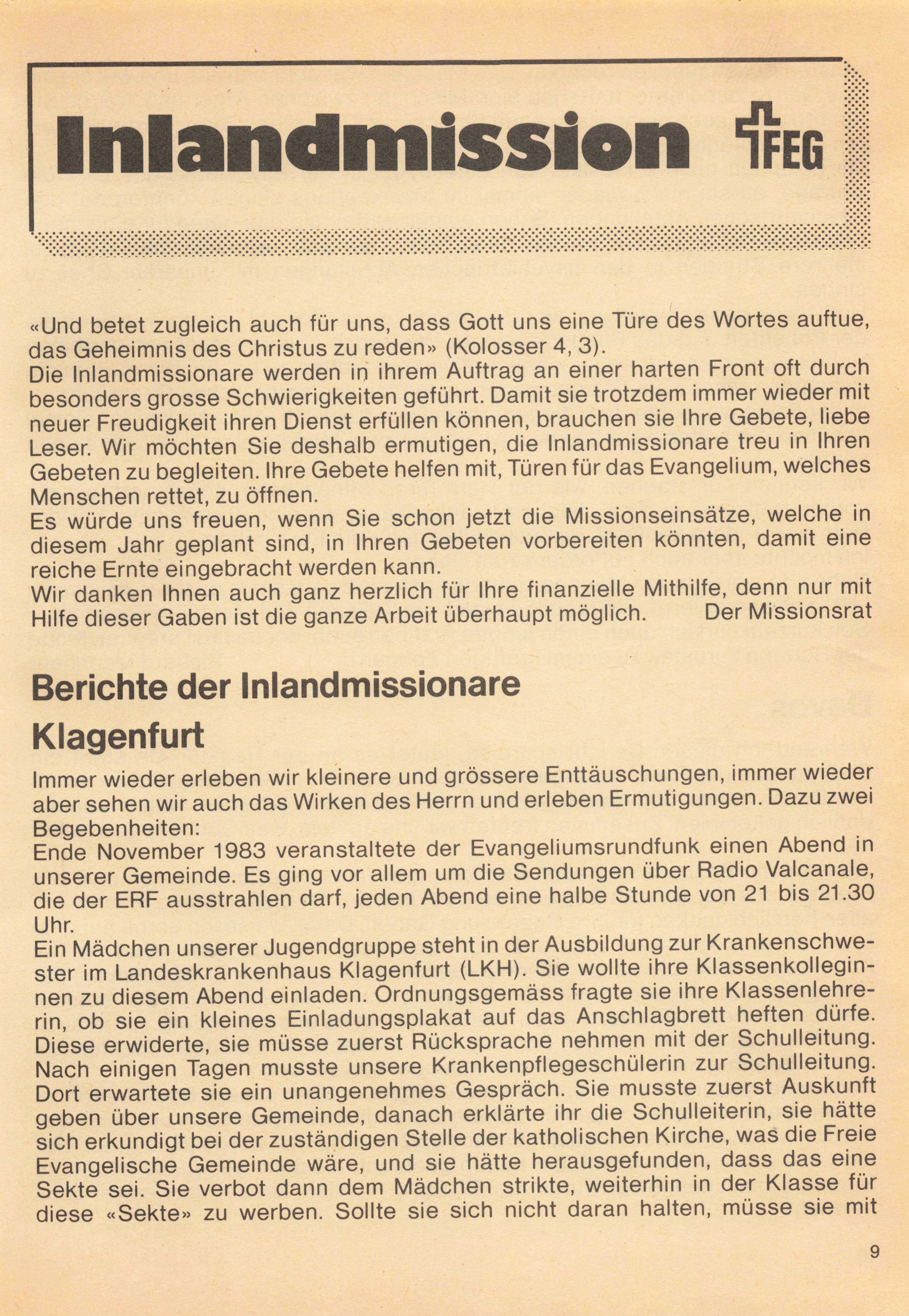 «Und betet zugleich auch für uns, dass Gott uns eine Türe des Wortes auftue, das Geheimnis des Christus zu reden» (Kolosser 4, 3). Die Inlandmissionare werden in ihrem Auftrag an einer harten Front oft durch besonders grosse Schwierigkeiten geführt. Damit sie trotzdem immer wieder mit neuer Freudigkeit ihren Dienst erfüllen können, brauchen sie Ihre Gebete, liebe Leser. Wir möchten Sie deshalb ermutigen, die Inlandmissionare treu in Ihren Gebeten zu begleiten. Ihre Gebete helfen mit, Türen für das Evangelium, welches Menschen rettet, zu öffnen. Es würde uns freuen, wenn Sie schon jetzt die Missionseinsätze, welche in diesem Jahr geplant sind, in Ihren Gebeten vorbereiten könnten, damit eine reiche Ernte eingebracht werden kann. Wir danken Ihnen auch ganz herzlich für Ihre finanzielle Mithilfe, denn nur mit Hilfe dieser Gaben ist die ganze Arbeit überhaupt möglich. Der Missionsrat