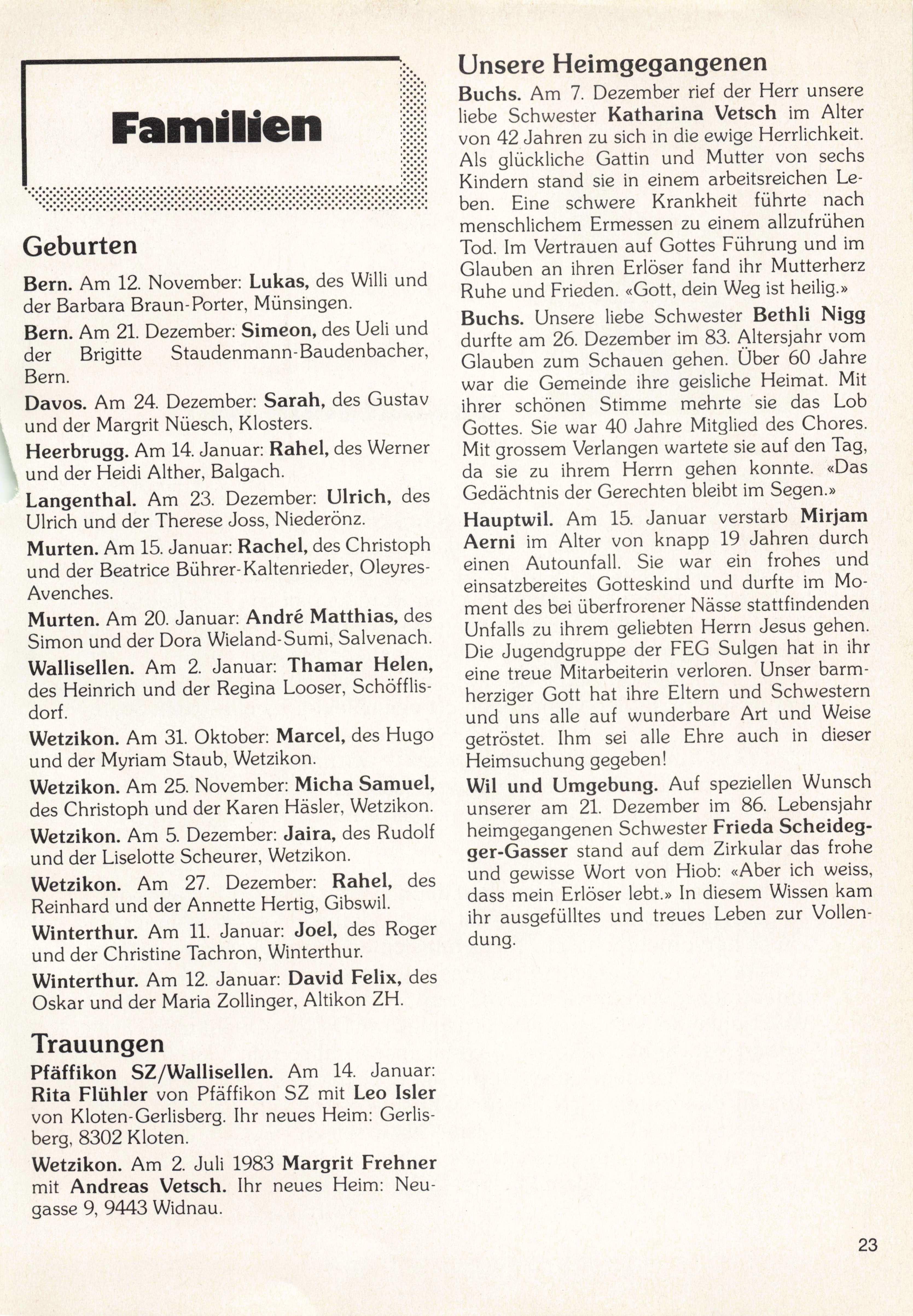 Buchs. Unsere liebe Schwester Bethli Nigg durfte am 26. Dezember im 83. Altersjahr vom Glauben zum Schauen gehen. Über 60 Jahre die Gemeinde ihre geisliche Heimat. Mit der Bern. Davos. Am 24. Dezember: Sarah, des Gustav und der Margrit Nüesch, Klosters. Heerbrugg. Am 14. Januar: Rahel, des Werner und der Heidi Alther, Balgach. war ihrer schönen Stimme mehrte sie das Lob Gottes. Sie war 40 Jahre Mitglied des Chores. Mit grossem Verlangen wartete sie auf den Tag, da sie zu ihrem Herrn gehen konnte. «Das Gedächtnis der Gerechten bleibt im Segen.» Langenthal. Am 23. Dezember; Ulrich, des Ulrich und der Therese Joss, Niederönz.