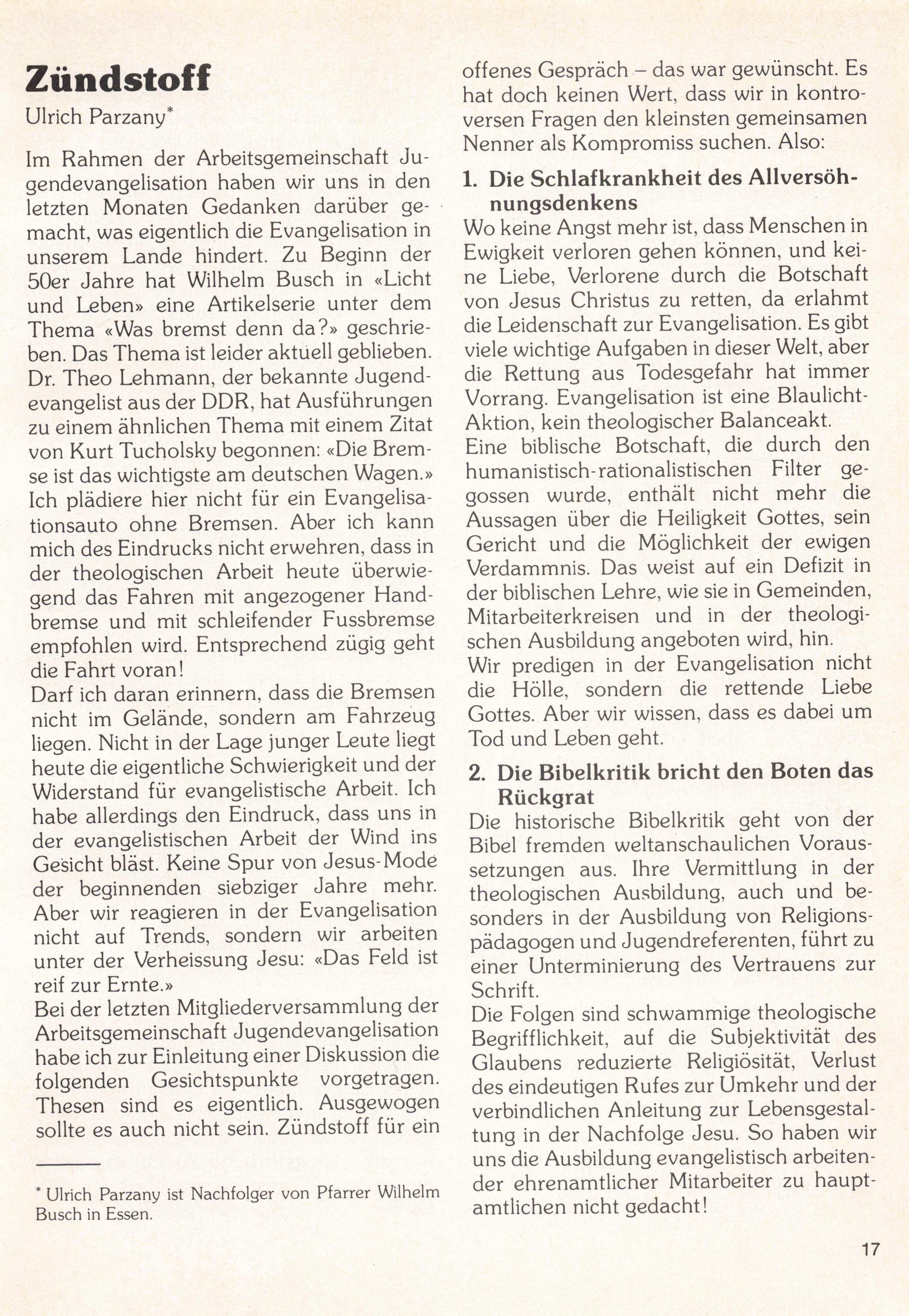 dererseits besteht unter Theologen wenig Bereitschaft, evangelistische Dienste zu tun. Die Aufgabe erscheint unseriös, zu einseitig. Differenziertheit erscheint wichti ger als Klarheit.