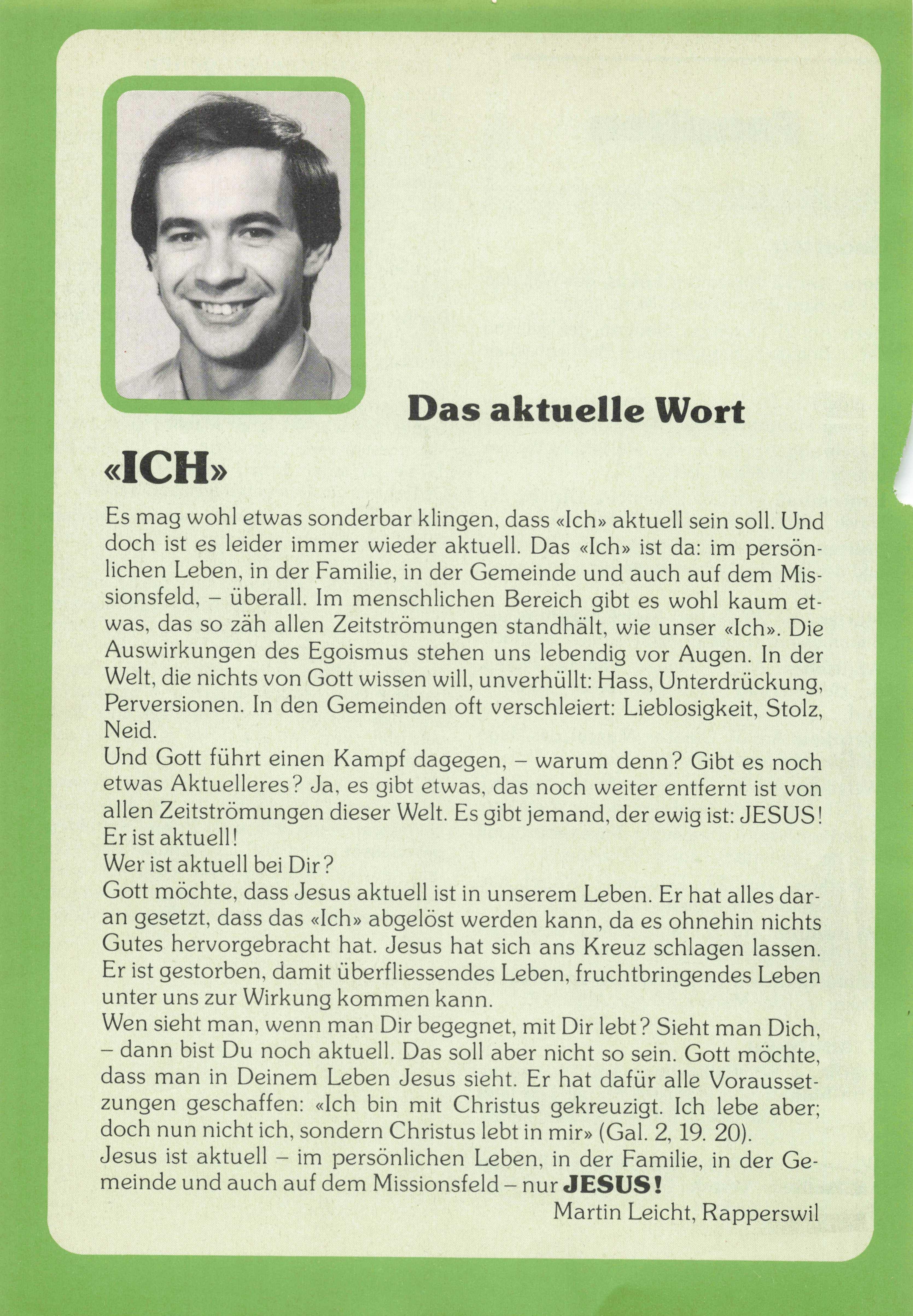 Es mag wohl etwas sonderbar klingen, dass «Ich» aktuell sein soll. Und doch ist es leider immer wieder aktuell. Das «Ich» ist da: im persön lichen Leben, in der Familie, in der Gemeinde und auch auf dem Mis sionsfeld, - überall. Im menschlichen Bereich gibt es wohl kaum et was, das so zäh allen Zeitströmungen standhält, wie unser «Ich». Die Auswirkungen des Egoismus stehen uns lebendig vor Augen. In der Welt, die nichts von Gott wissen will, unverhüllt: Hass, Unterdrückung, Perversionen. In den Gemeinden oft verschleiert: Lieblosigkeit, Stolz Neid.