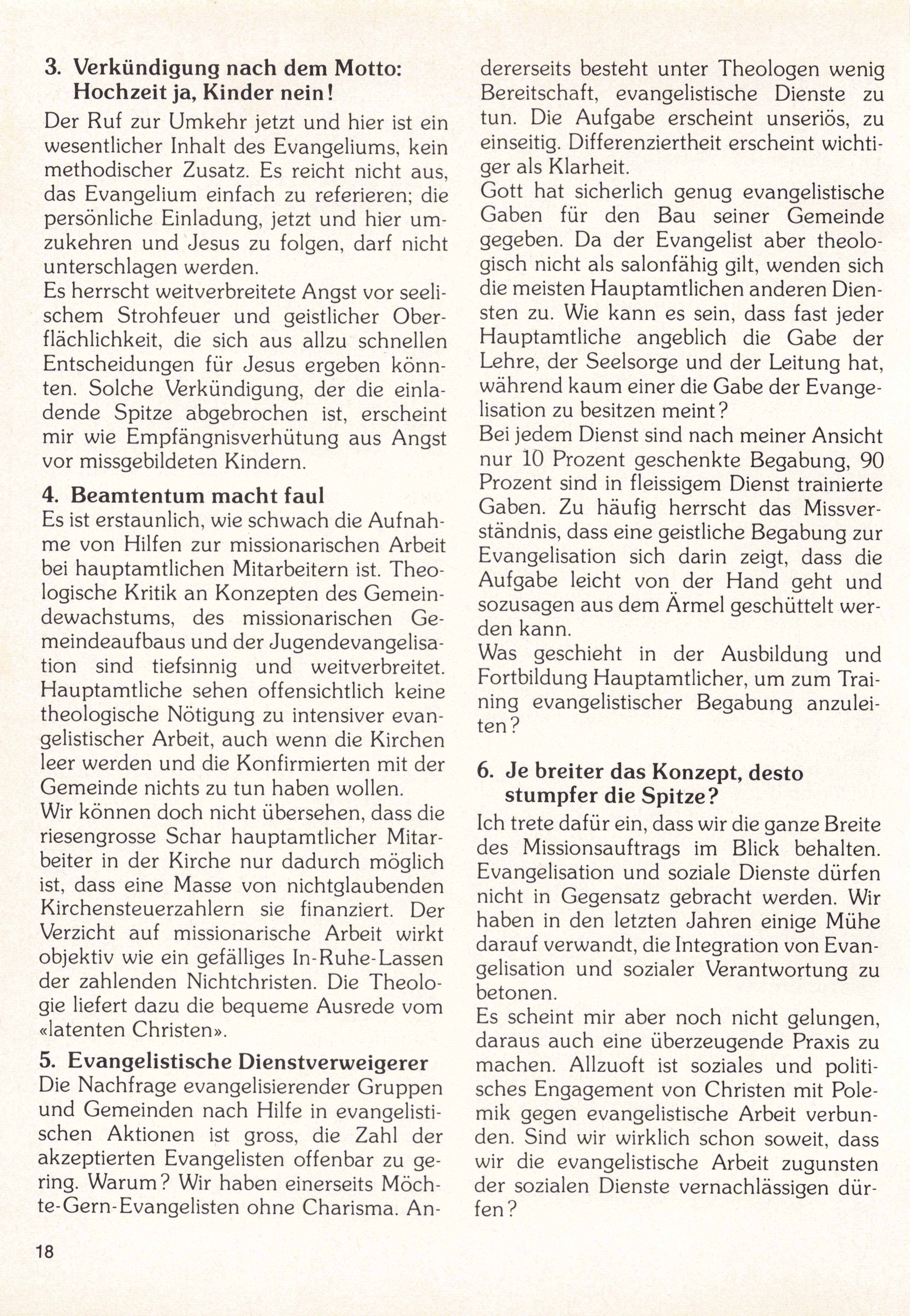 4. Beamtentum macht faul Es ist erstaunlich, wie schwach die Aufnah me von Hilfen zur missionarischen Arbeit bei hauptamtlichen Mitarbeitern ist. Theo logische Kritik an Konzepten des Gemein dewachstums, des missionarischen Gemeindeaufbaus und der Jugendevangelisa tion sind tiefsinnig und weitverbreitet. Hauptamtliche sehen offensichtlich keine theologische Nötigung zu intensiver evangelistischer Arbeit, auch wenn die Kirchen leer werden und die Konfirmierten mit der Gemeinde nichts zu tun haben wollen. Wir können doch nicht übersehen, dass die riesengrosse Schar hauptamtlicher Mitar beiter in der Kirche nur dadurch möglich ist, dass eine Masse von nichtglaubenden Kirchensteuerzahlern sie finanziert. Der Verzicht auf missionarische Arbeit wirkt objektiv wie ein gefälliges In-Ruhe-Lassen der zahlenden Nichtchristen. Die Theolo gie liefert dazu die bequeme Ausrede vom «latenten Christen».