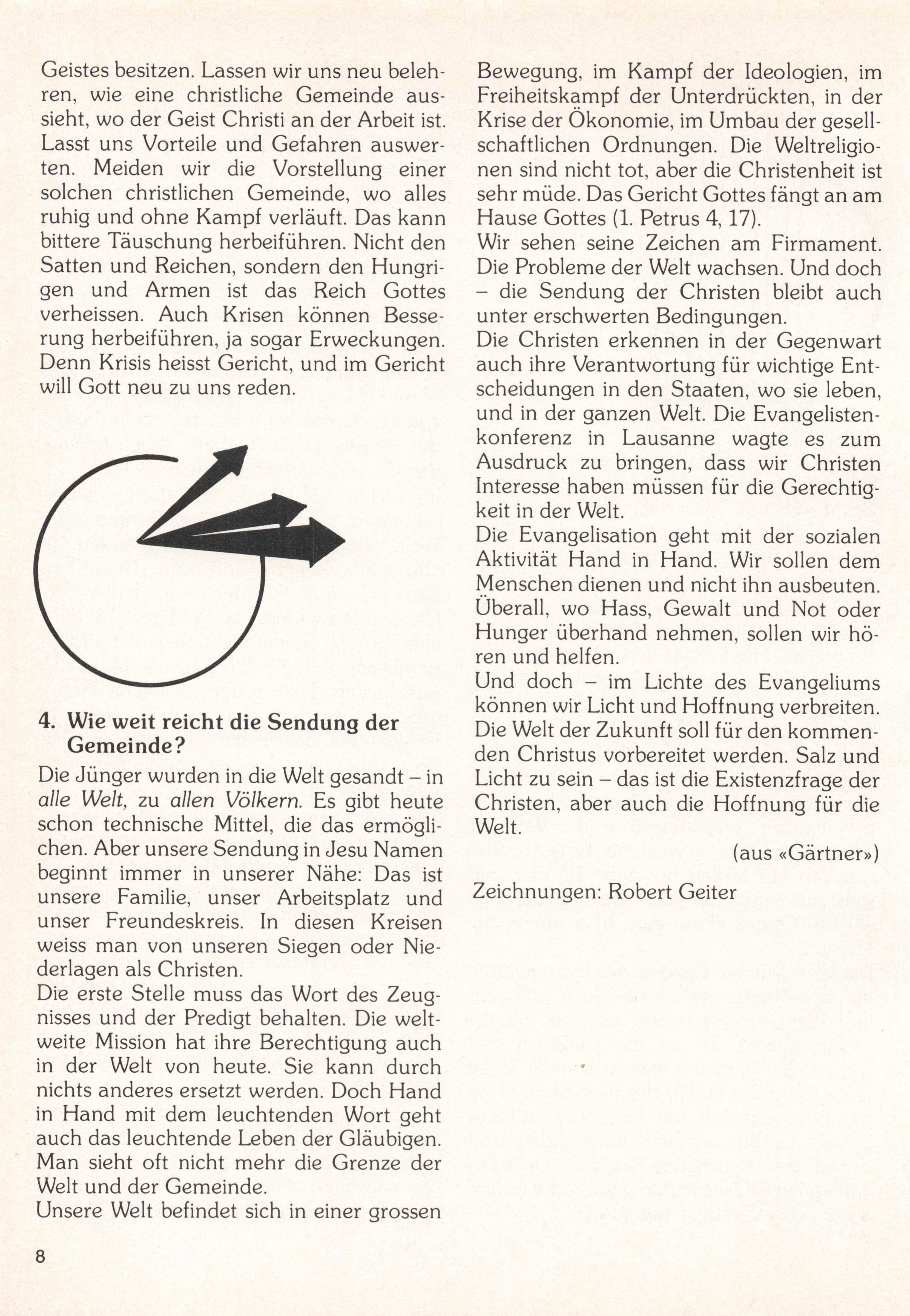 Geistes besitzen. Lassen wir uns neu beleh ren, wie eine christliche Gemeinde aus sieht, wo der Geist Christi an der Arbeit ist. Lasst uns Vorteile und Gefahren auswer ten. Meiden wir die Vorstellung einer solchen christlichen Gemeinde, wo alles ruhig und ohne Kampf verläuft. Das kann bittere Täuschung herbeiführen. Nicht den Satten und Reichen, sondern den Hungri gen und Armen ist das Reich Gottes verheissen. Auch Krisen können Besse rung herbeiführen, ja sogar Erweckungen. Denn Krisis heisst Gericht, und im Gericht will Gott neu zu uns reden.