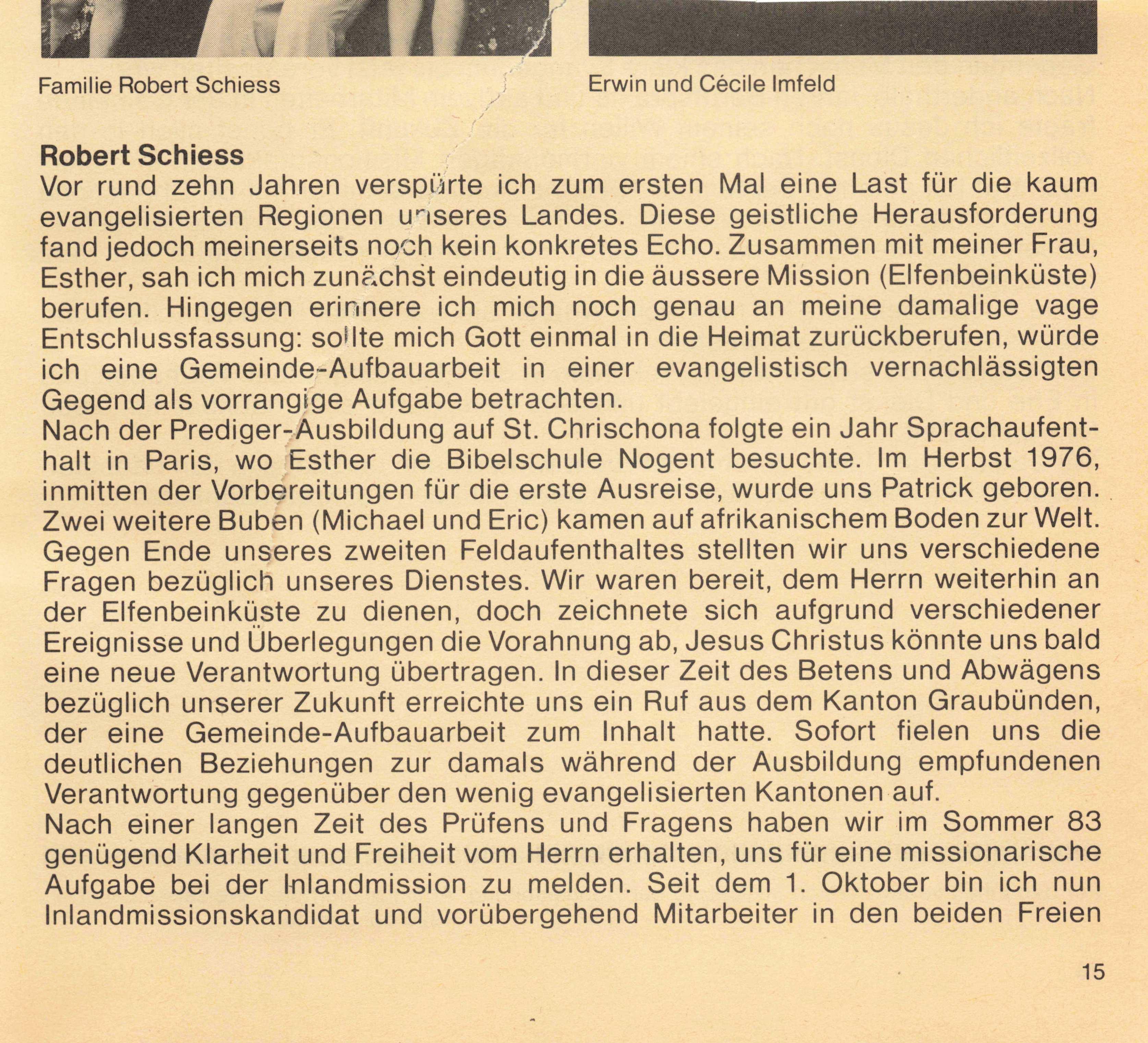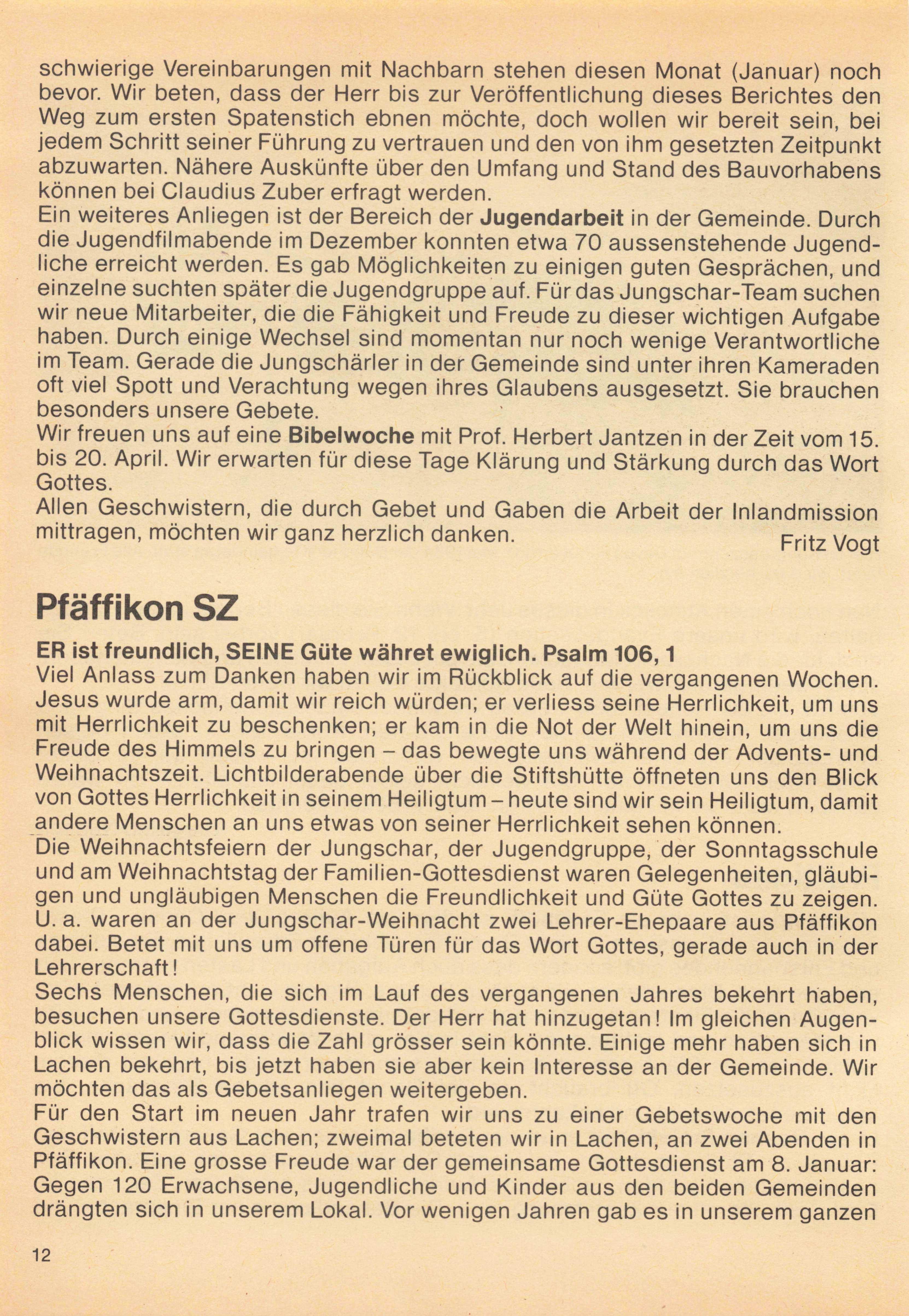 Nun noch einen Ausblick in dieses Jahr. Wenn Sie diesen Bericht in den Händen halten, wird unsere Evangelisation (5. bis 12. Februar) vorbei sein. Beten Sie doch für die Nacharbeit! Menschen, die ein Leben mit Jesus angefangen haben, sollen weitergeführt werden. Neue Kontakte wollen wir weiter nützen. Vom 18. bis 26. August 1984 werden wir wieder ein missionarische s Sing- und Musiklager durchführen (siehe «Ferien, Daten, Kurse 1984»). Auch diesen Einsatz, der mit einer Evangelisation verbunden ist, wollen wir im Gebet vorbereiten. Oder könnten Sie vielleicht selber dabei mithelfen? Wir wären dankbar, wenn wir mit einem starken Team arbeiten könnten.