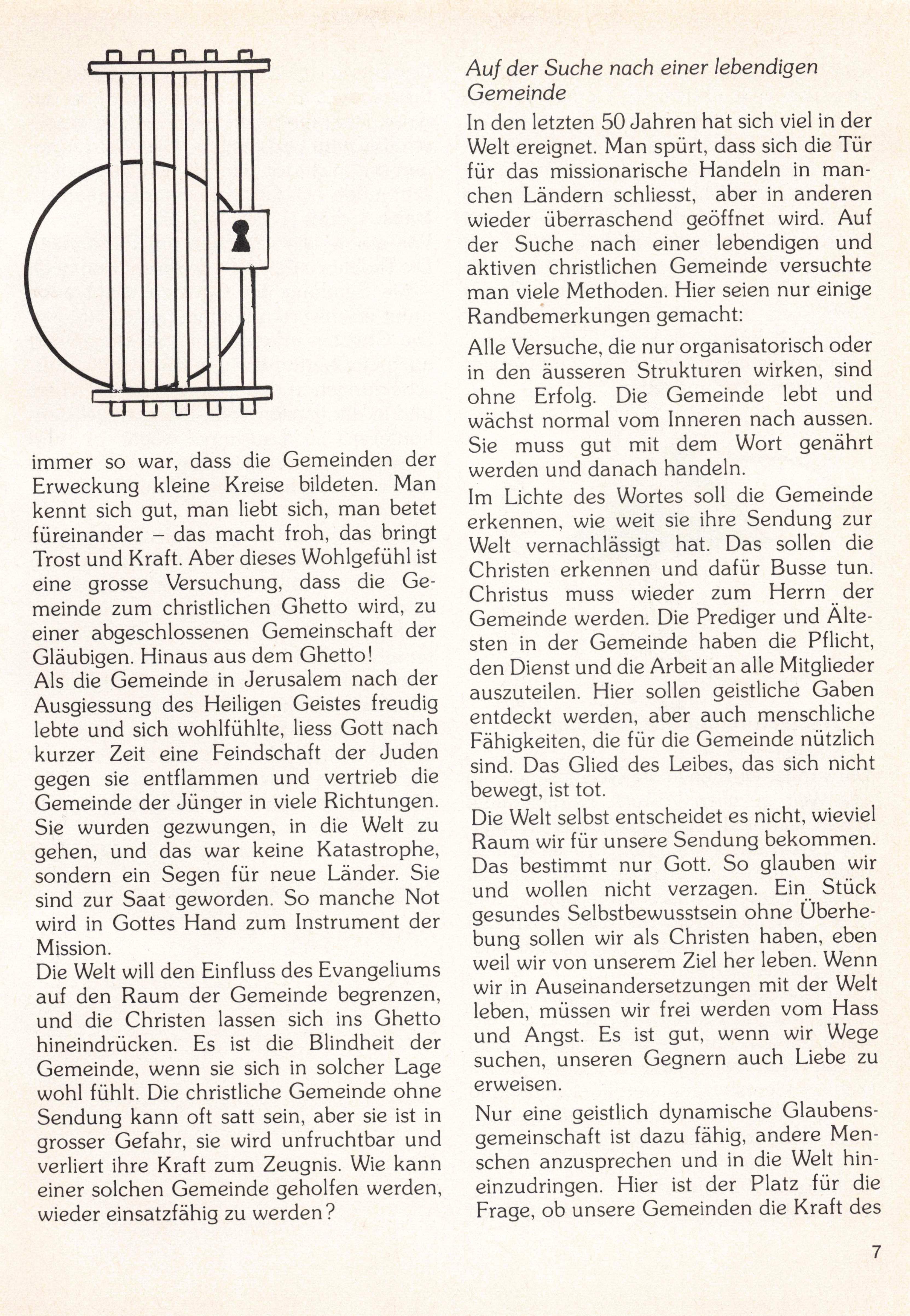 immer so war, dass die Gemeinden der Erweckung kleine Kreise bildeten. Man kennt sich gut, man liebt sich, man betet füreinander - das macht froh, das bringt Trost und Kraft. Aber dieses Wohlgefühl ist eine grosse Versuchung, dass die Ge meinde zum christlichen Ghetto wird, zu einer abgeschlossenen Gemeinschaft der Gläubigen. Hinaus aus dem Ghetto! Als die Gemeinde in Jerusalem nach der Ausgiessung des Heiligen Geistes freudig lebte und sich wohlfühlte, Hess Gott nach kurzer Zeit eine Feindschaft der Juden gegen sie entflammen und vertrieb die Gemeinde der Jünger in viele Richtungen. Sie wurden gezwungen, in die Welt zu gehen, und das war keine Katastrophe, sondern ein Segen für neue Länder. Sie sind zur Saat geworden. So manche Not wird in Gottes Hand zum Instrument der Mission.